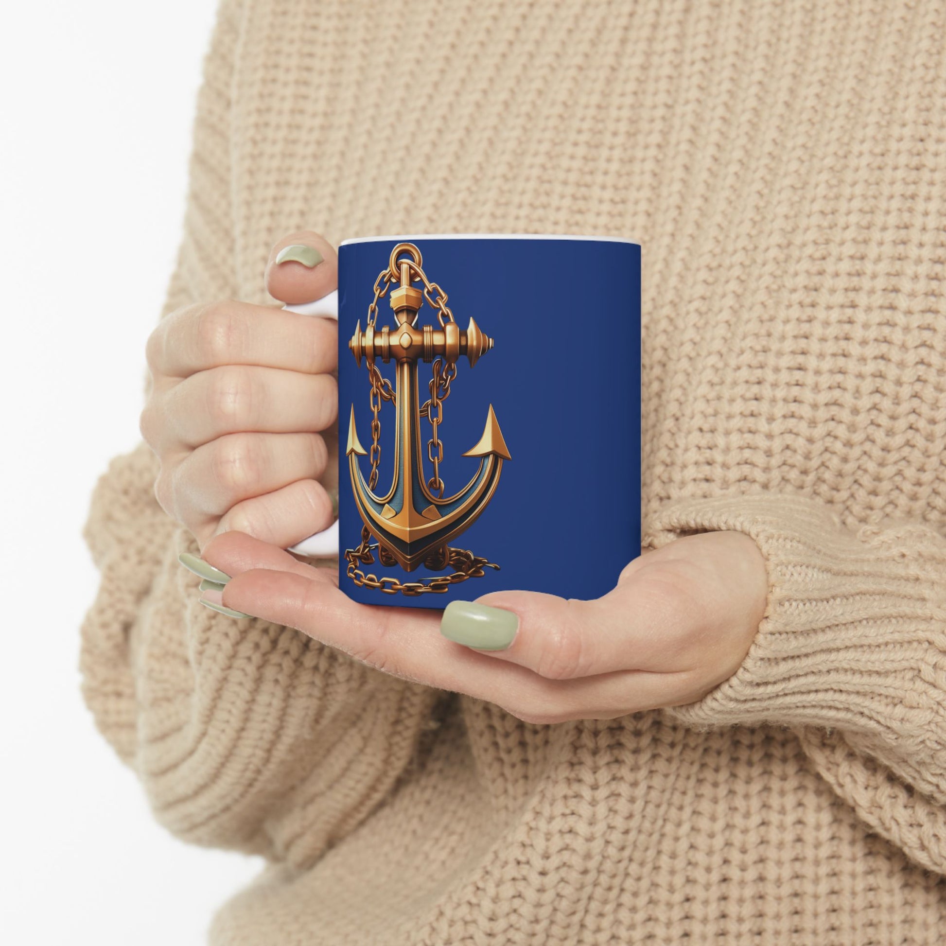 This glossy ceramic mug brings a touch of maritime charm to your everyday ritual. Deep navy wraps around the cup, punctuated by a golden anchor motif that feels both classic and quietly adventurous. Customize it with the background color of your choice. The comfortable C-handle and shiny finish make every sip feel deliberate — a moment to steady yourself before the day moves on. Lightweight enough for morning coffee, roomy enough for an afternoon tea or cocoa, it slips easily into a ship-shape routine and blends with nautical décor or a desk full of maps and sketches.