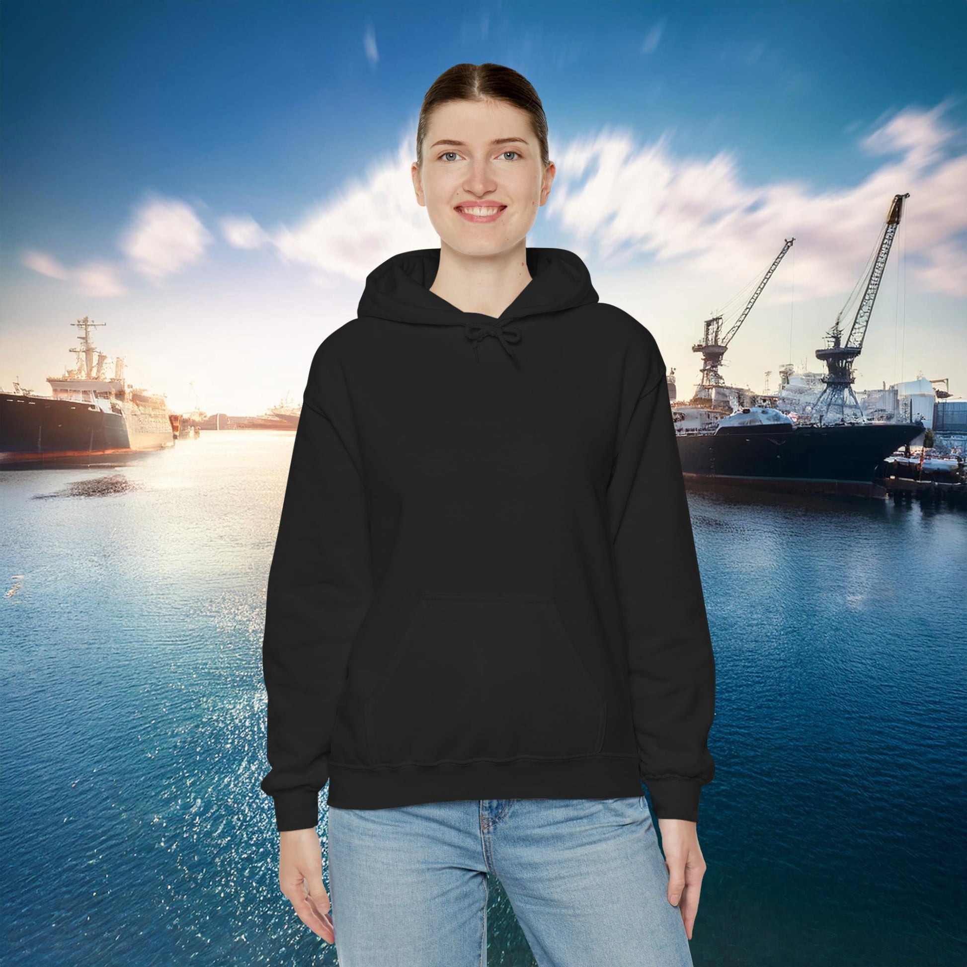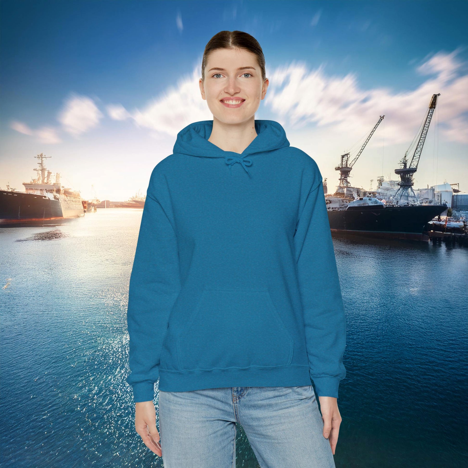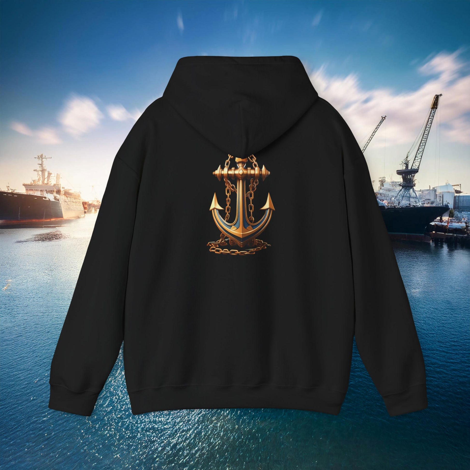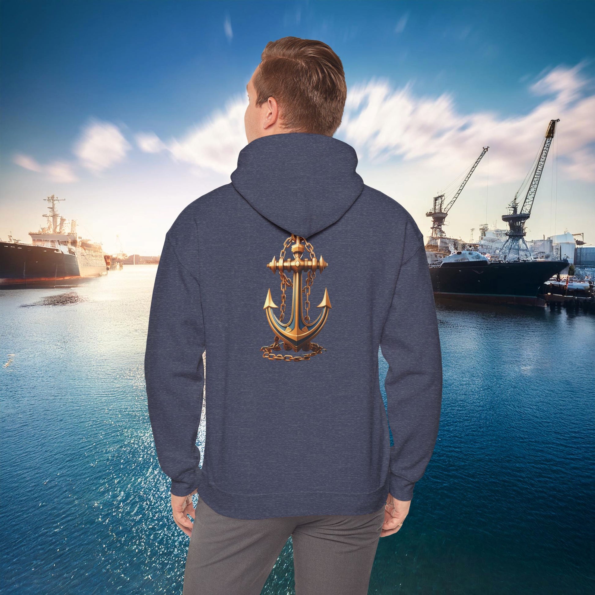 This nautical themed anchor heavy blend hooded sweatshirt is relaxation itself. Made with a thick blend of cotton and polyester, it feels plush, soft and warm, a perfect choice for any cold day. In the front, the spacious kangaroo pocket adds daily practicality while the hood's drawstring is the same color as the base sweater for extra style points.