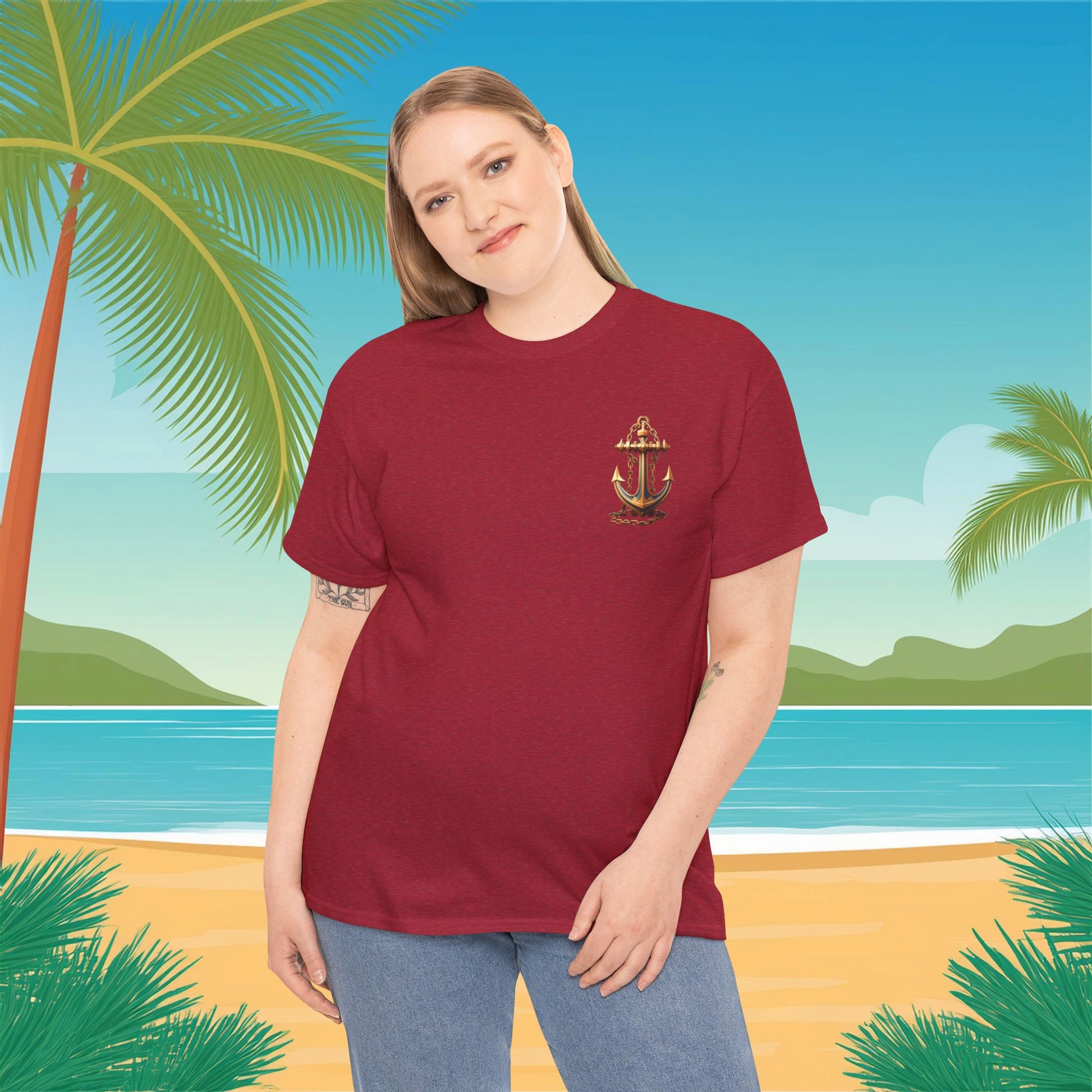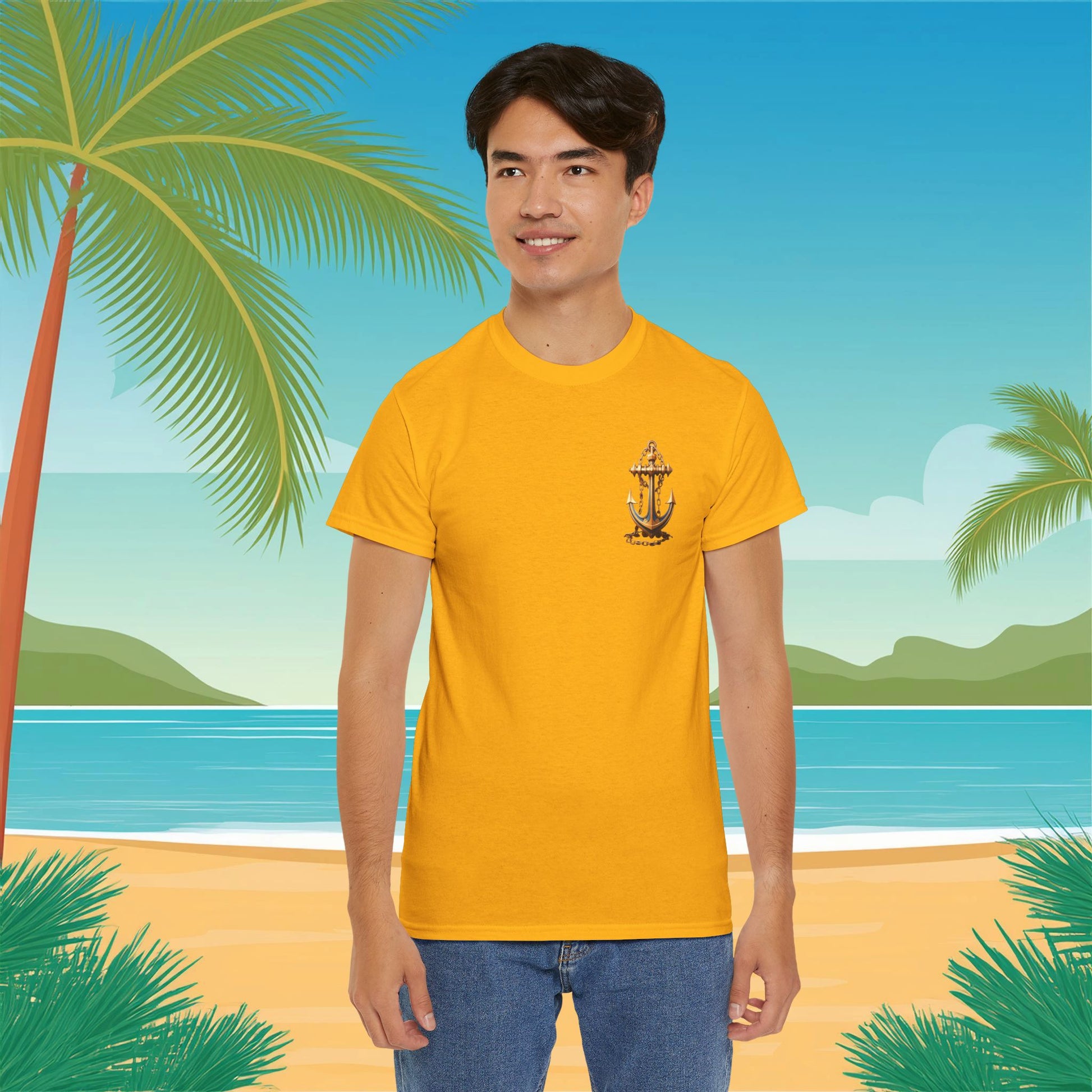 This nautical themed anchor heavy cotton tee is the basic staple of any wardrobe. It is the foundation upon which casual fashion grows. The specially spun fibers provide a smooth surface for premium printing vividity and sharpness. No side seams mean there are no itchy interruptions under the arms. The shoulders have tape for improved durability.