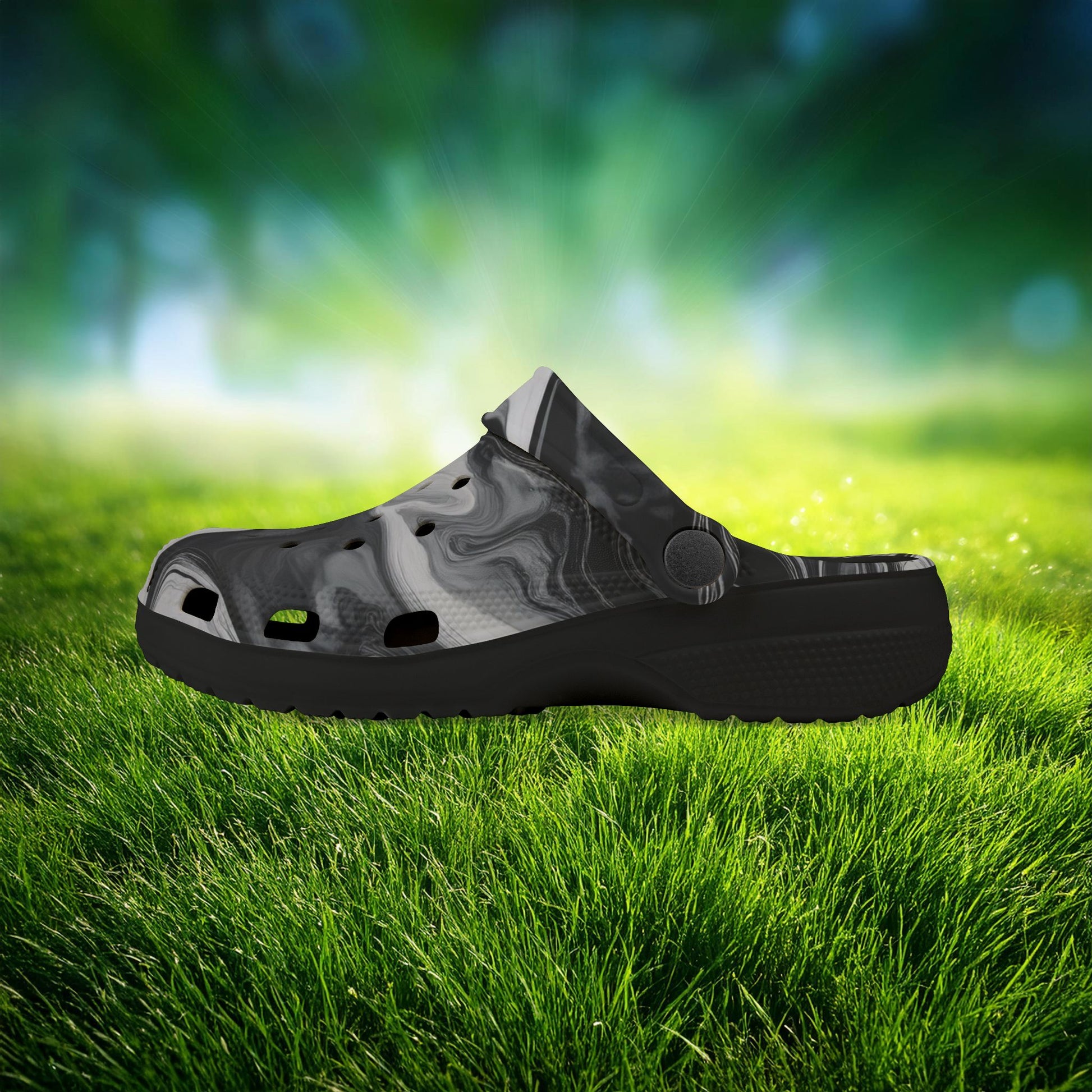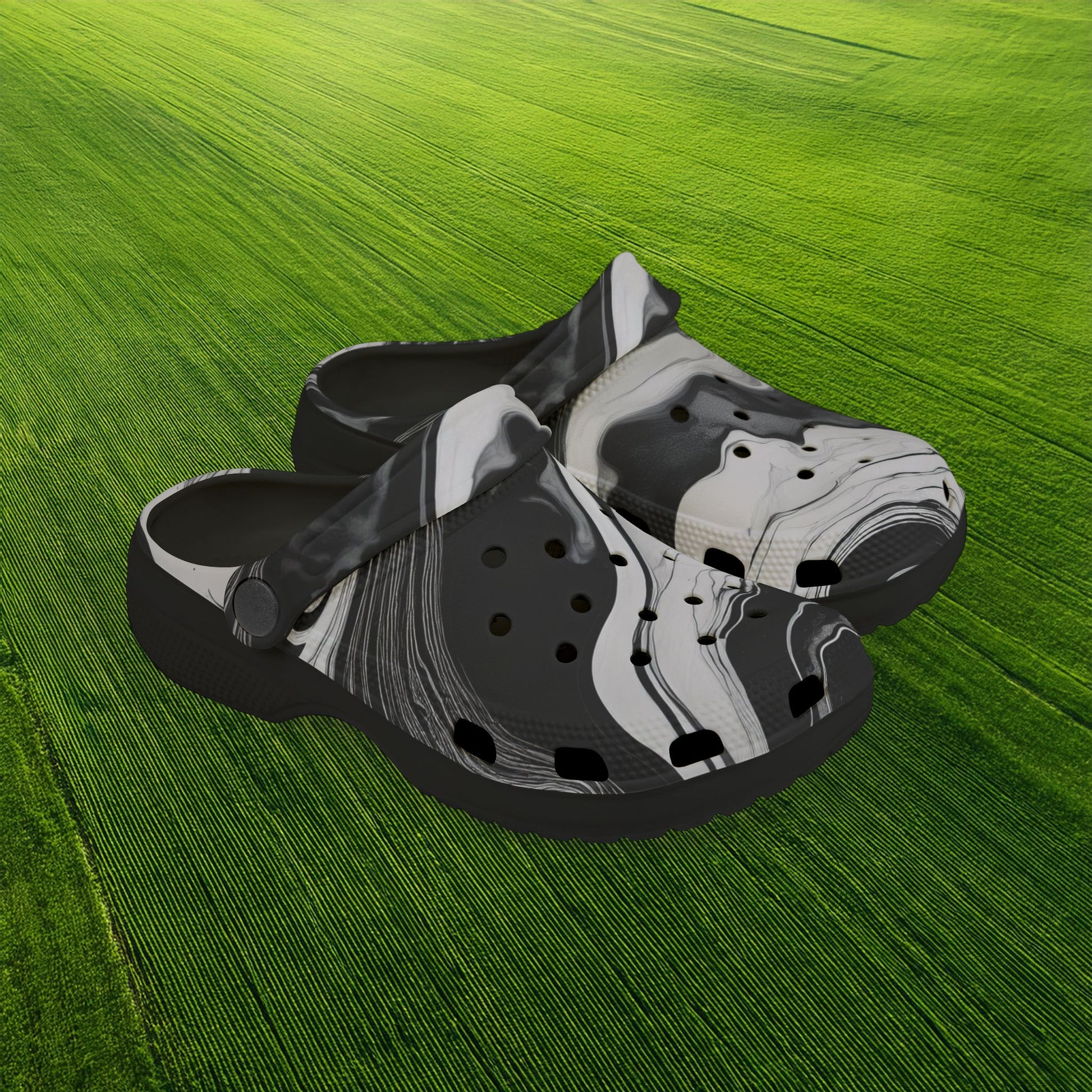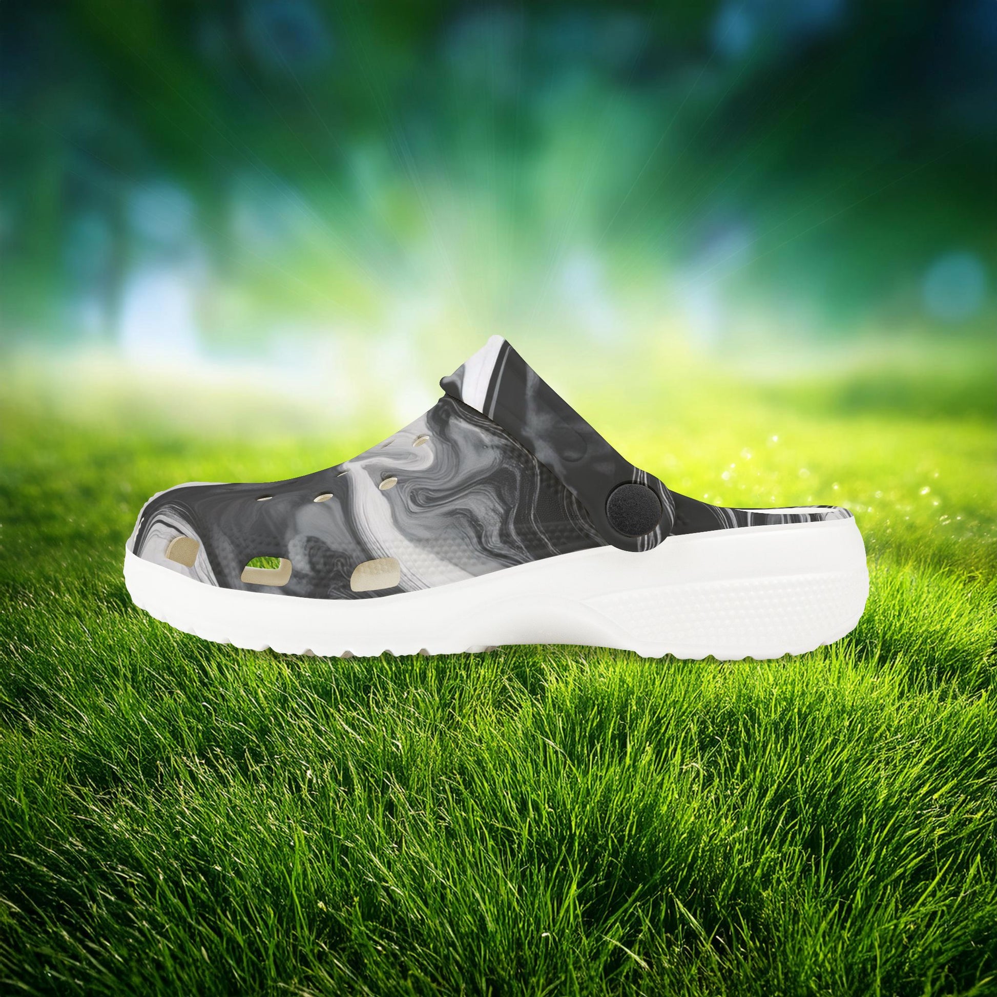 The perfect companion to a kid's adventure is here -- meet the black and white marble pattern clogs for kids. Made with EVA foam, they offer a plush feel for day-long coziness, excellent arch support, and shock absorption for hard surfaces. The design adds a unique touch, showcasing vibrant personality and style.