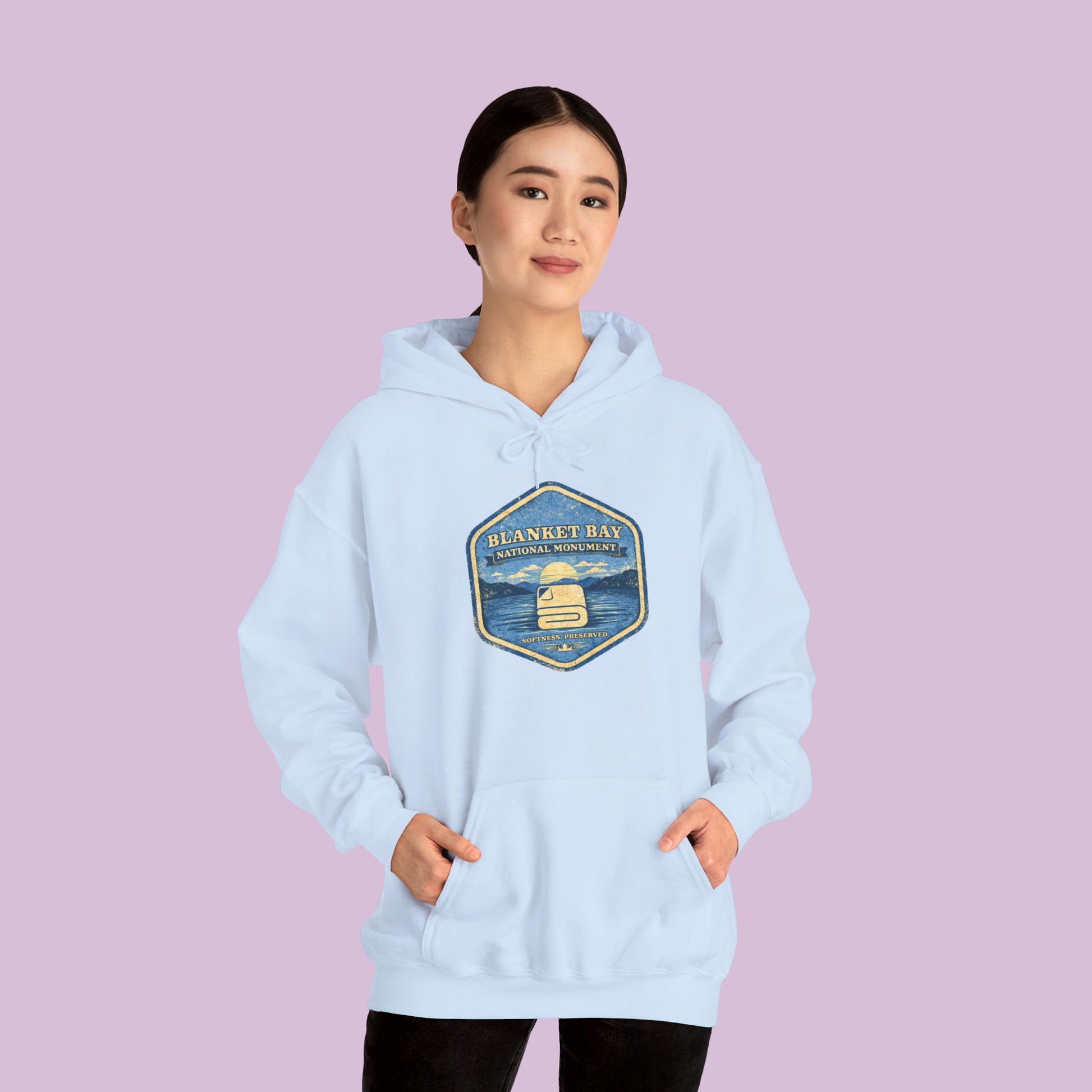 Featuring a vintage national park inspired badge design, this hoodie showcases a tranquil bay scene with mountains, water, and a perfectly folded blanket beneath a rising sun. Marked “Blanket Bay National Monument – Softness Preserved,” the retro-style artwork blends classic park heritage aesthetics with a playful tribute to cozy living.