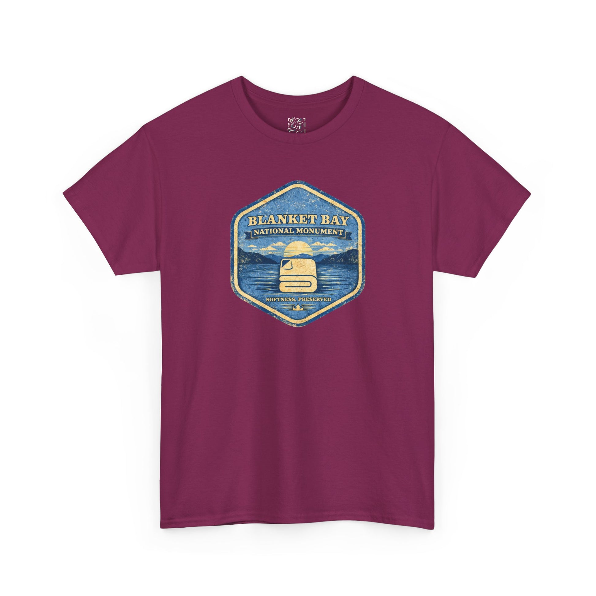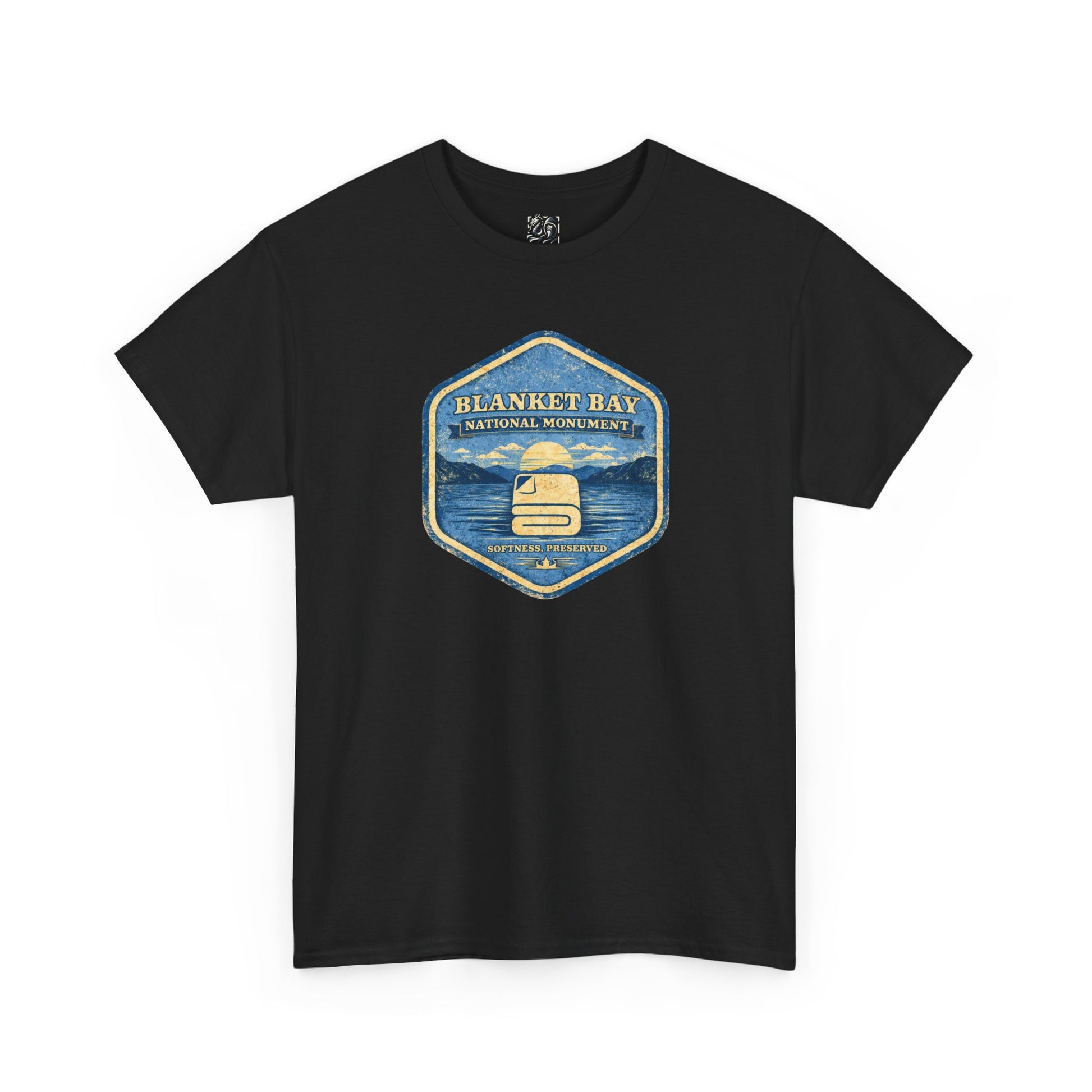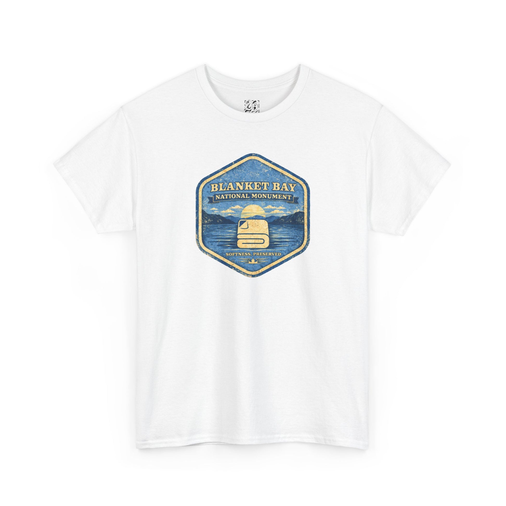 Featuring a vintage national park inspired badge design, this shirt showcases a tranquil bay scene with mountains, water, and a neatly folded blanket beneath a rising sun. Marked “Blanket Bay National Monument – Softness Preserved,” the retro-style artwork blends classic park heritage aesthetics with a playful tribute to cozy living.