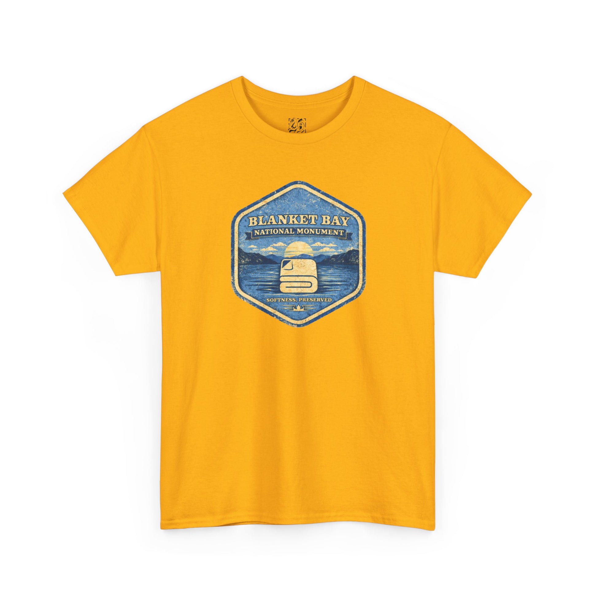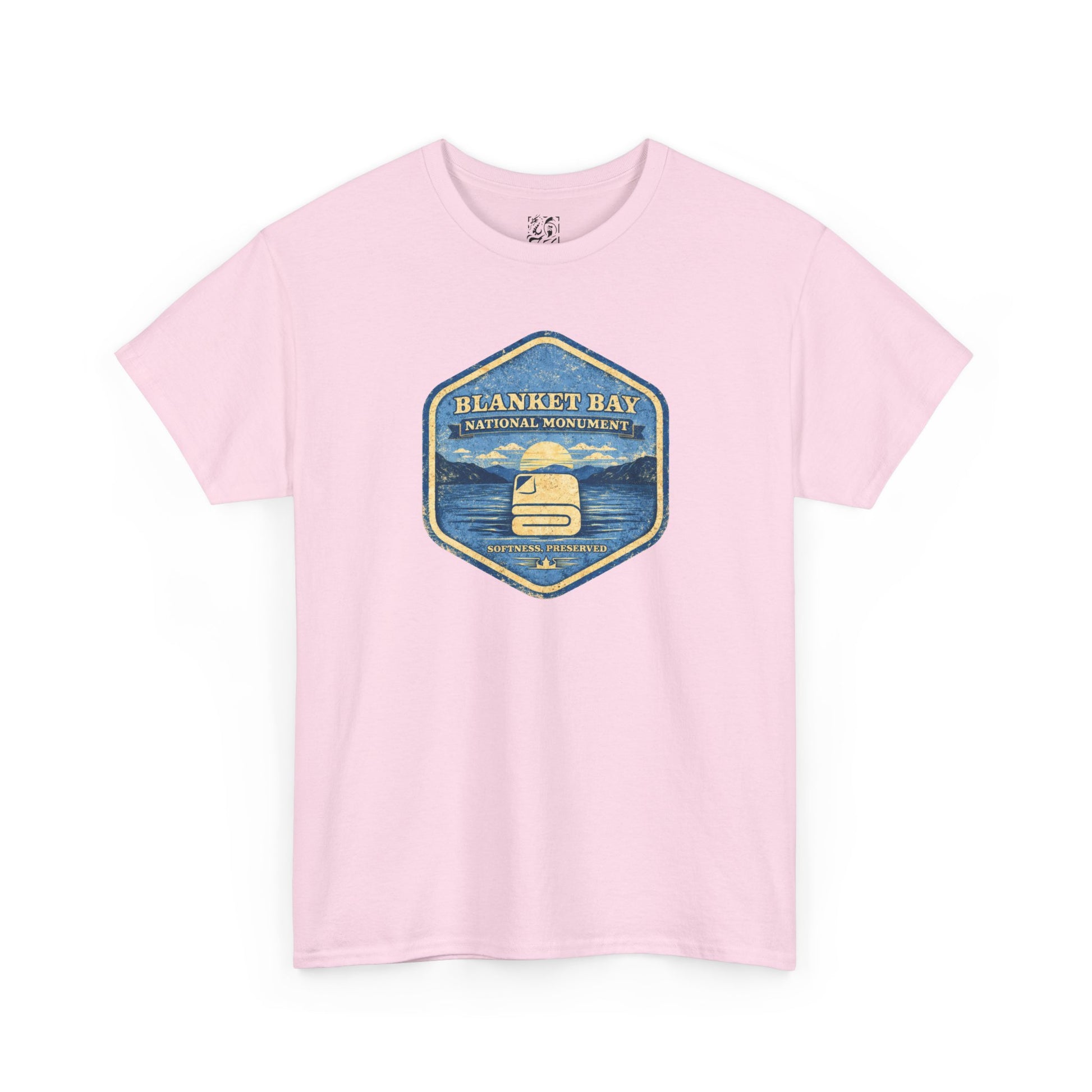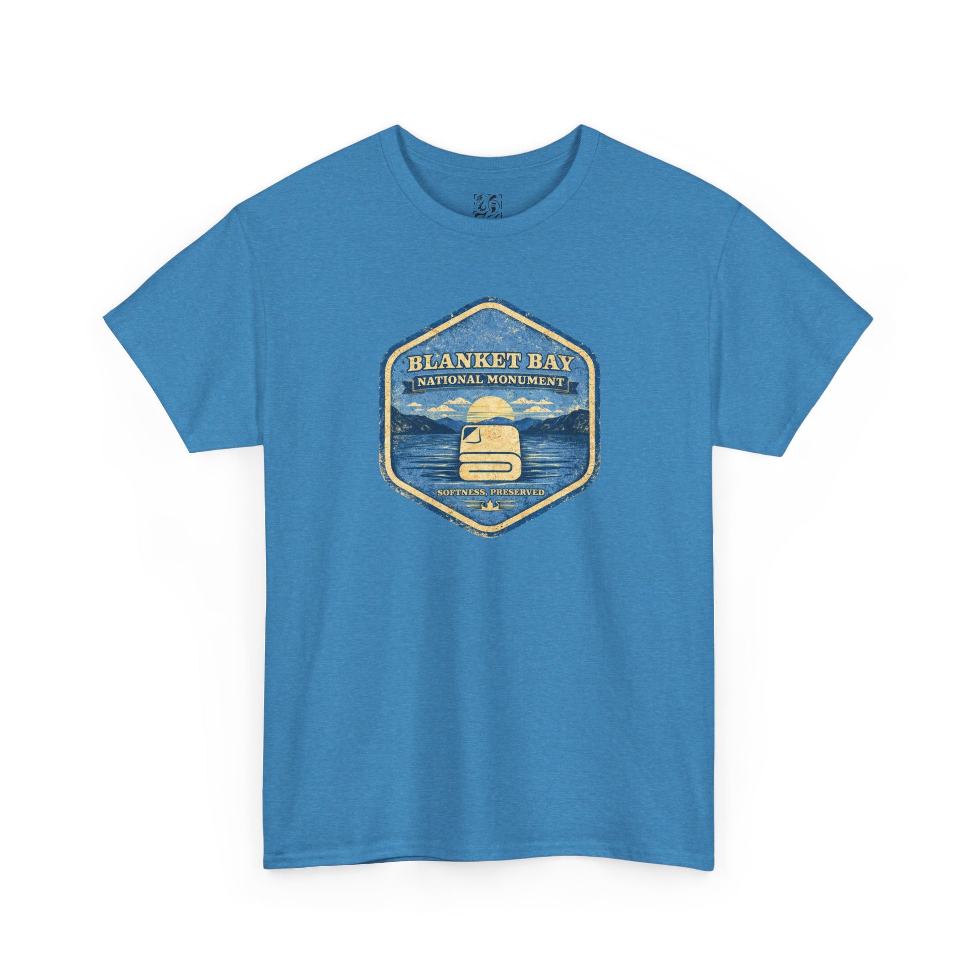 Featuring a vintage national park inspired badge design, this shirt showcases a tranquil bay scene with mountains, water, and a neatly folded blanket beneath a rising sun. Marked “Blanket Bay National Monument – Softness Preserved,” the retro-style artwork blends classic park heritage aesthetics with a playful tribute to cozy living.