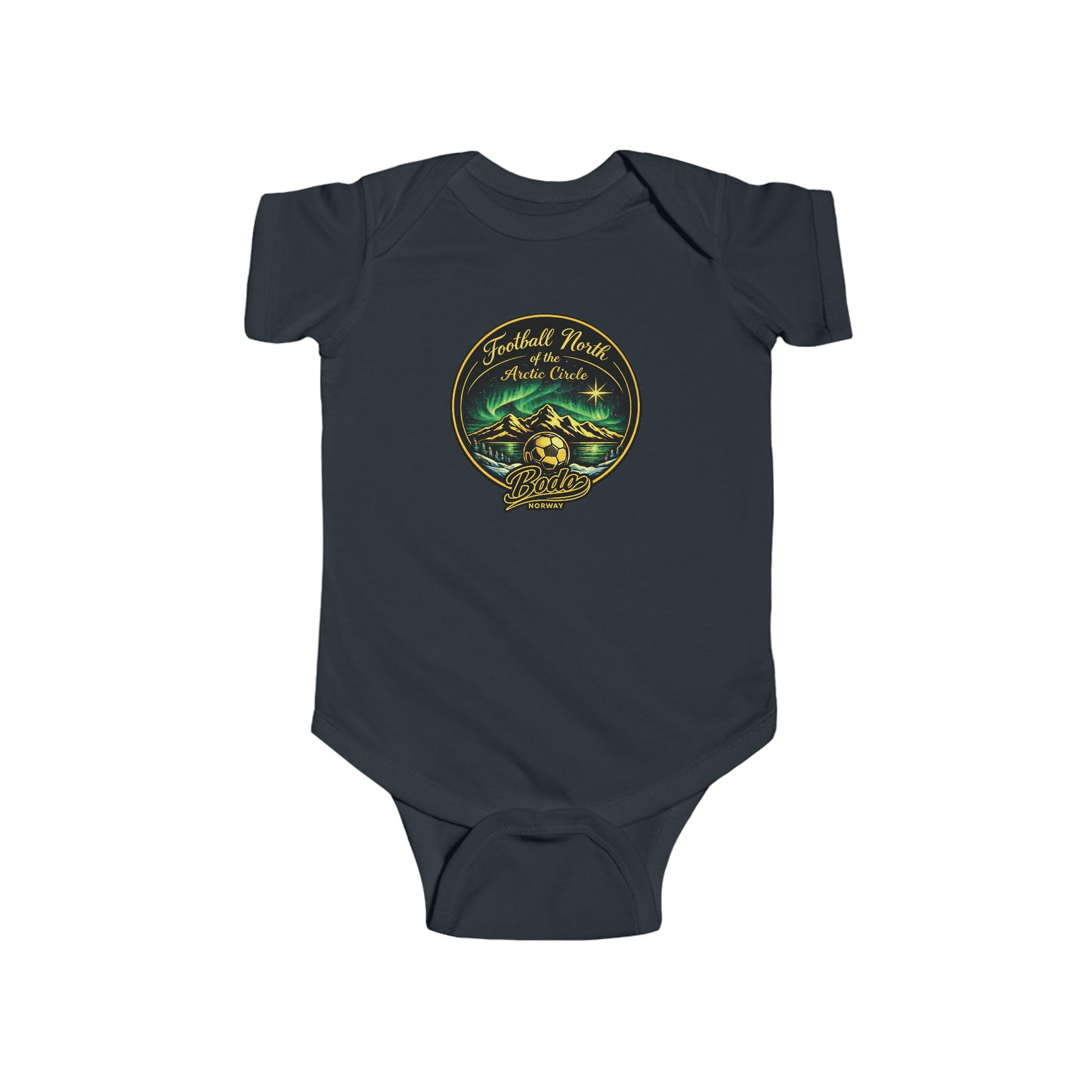Start their football journey early with the Bodø “North of the Arctic Circle” Infant Bodysuit. Inspired by the unique football culture of Bodø, Norway, this adorable piece celebrates the beautiful game played beneath glowing northern lights and Arctic skies.