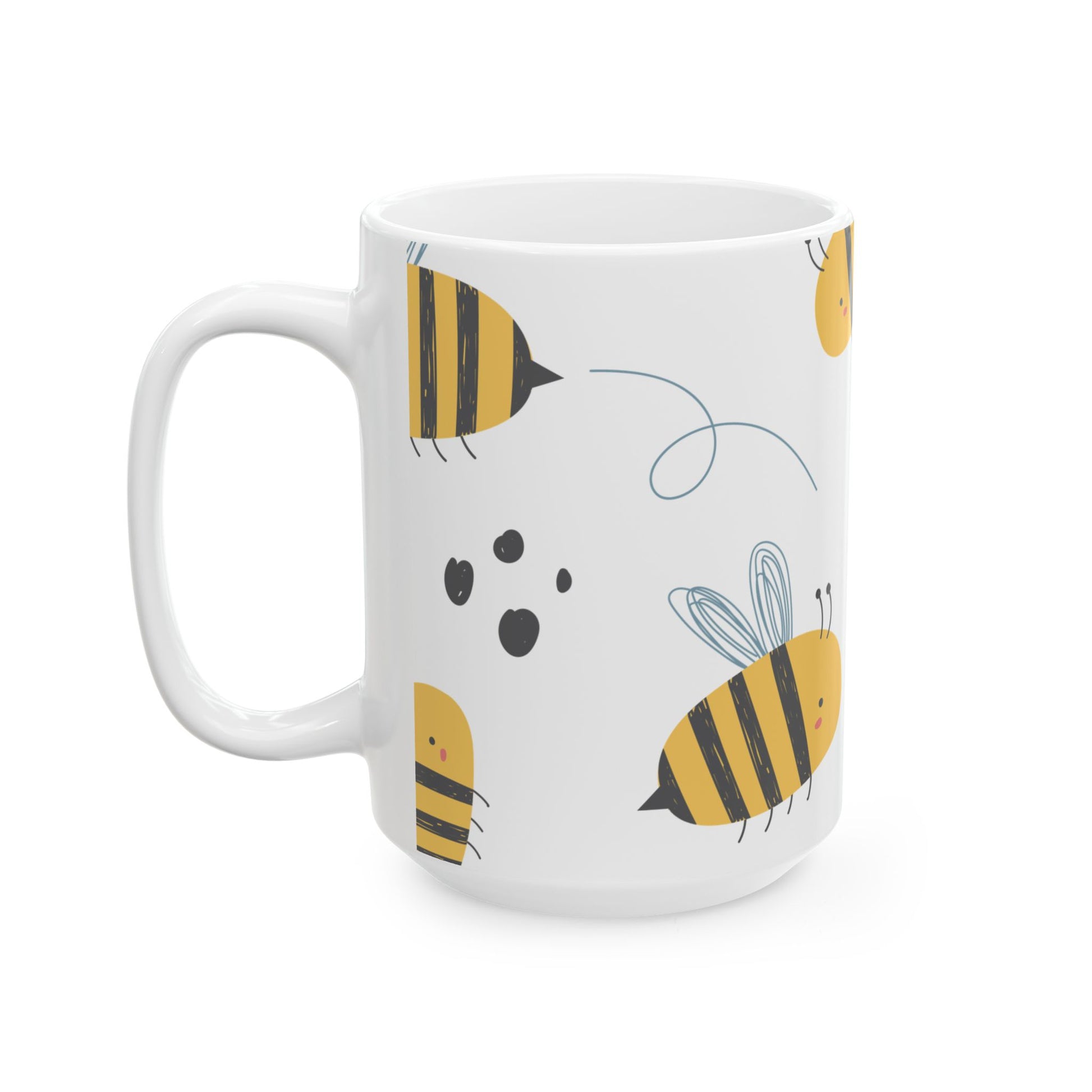 Wake up to a little swarm of sunshine. This ceramic mug carries a playful bee pattern—soft golden bodies, tiny blushing faces, and sketchy wings—set on a clean white canvas. It feels light and cheerful in your hands, brightening a slow morning or a busy desk break. Use it for coffee, tea, or a cozy cocoa when you need a small, friendly lift. The glossy finish makes the colors pop while the C-handle sits comfortably for everyday sipping.