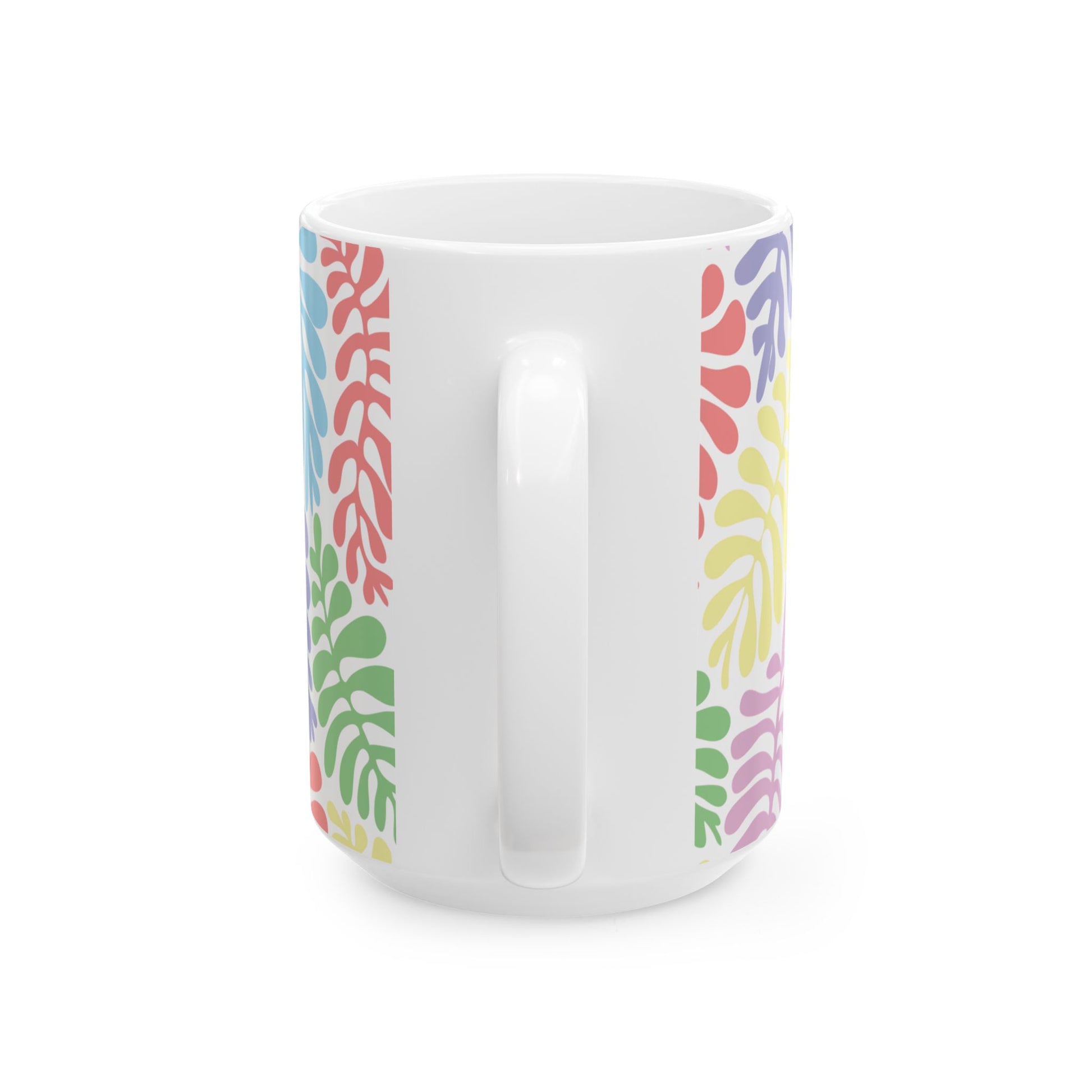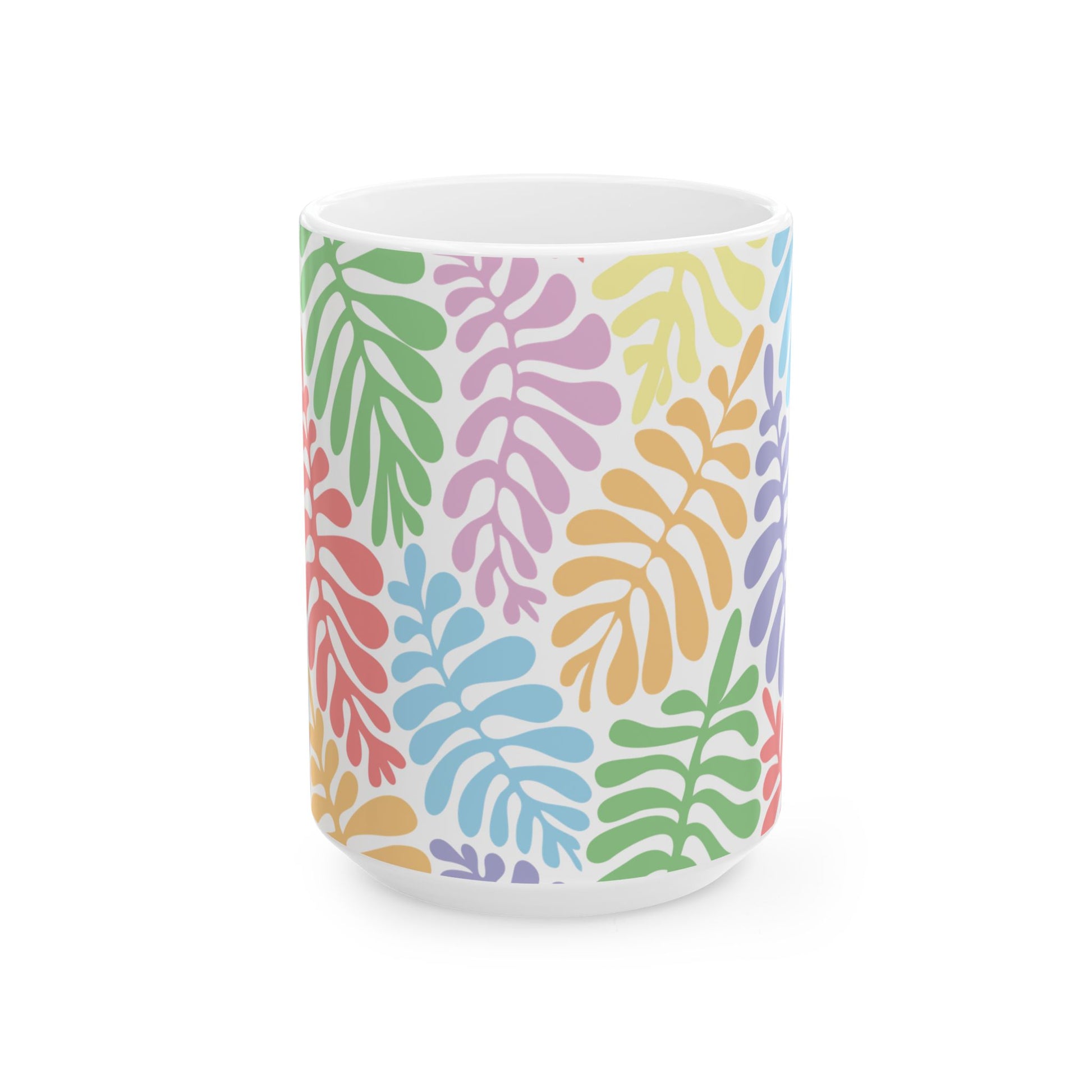 Bright, leafy color brings a gentle lift to morning coffee or afternoon tea. This glossy ceramic mug wraps a playful botanical pattern—curving fronds in soft pastels—around a crisp white base. It feels light in your hand, the C-shaped handle sits comfortably while the glossy finish keeps colors lively through daily use. Use it at your desk to brighten work days, on the porch for slow weekend sips, or as a cheerful companion during houseplant care. The design reads like a small, sunny garden — calm, cheerful, and quietly optimistic.