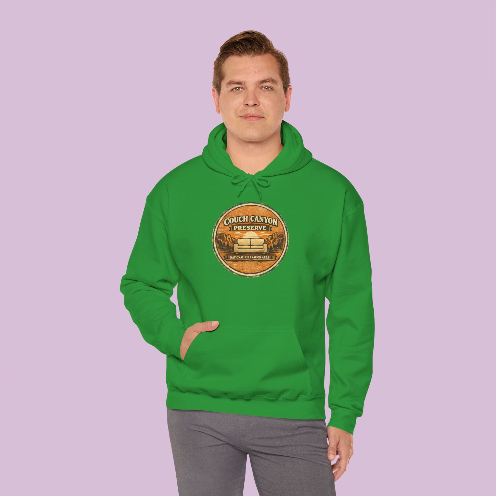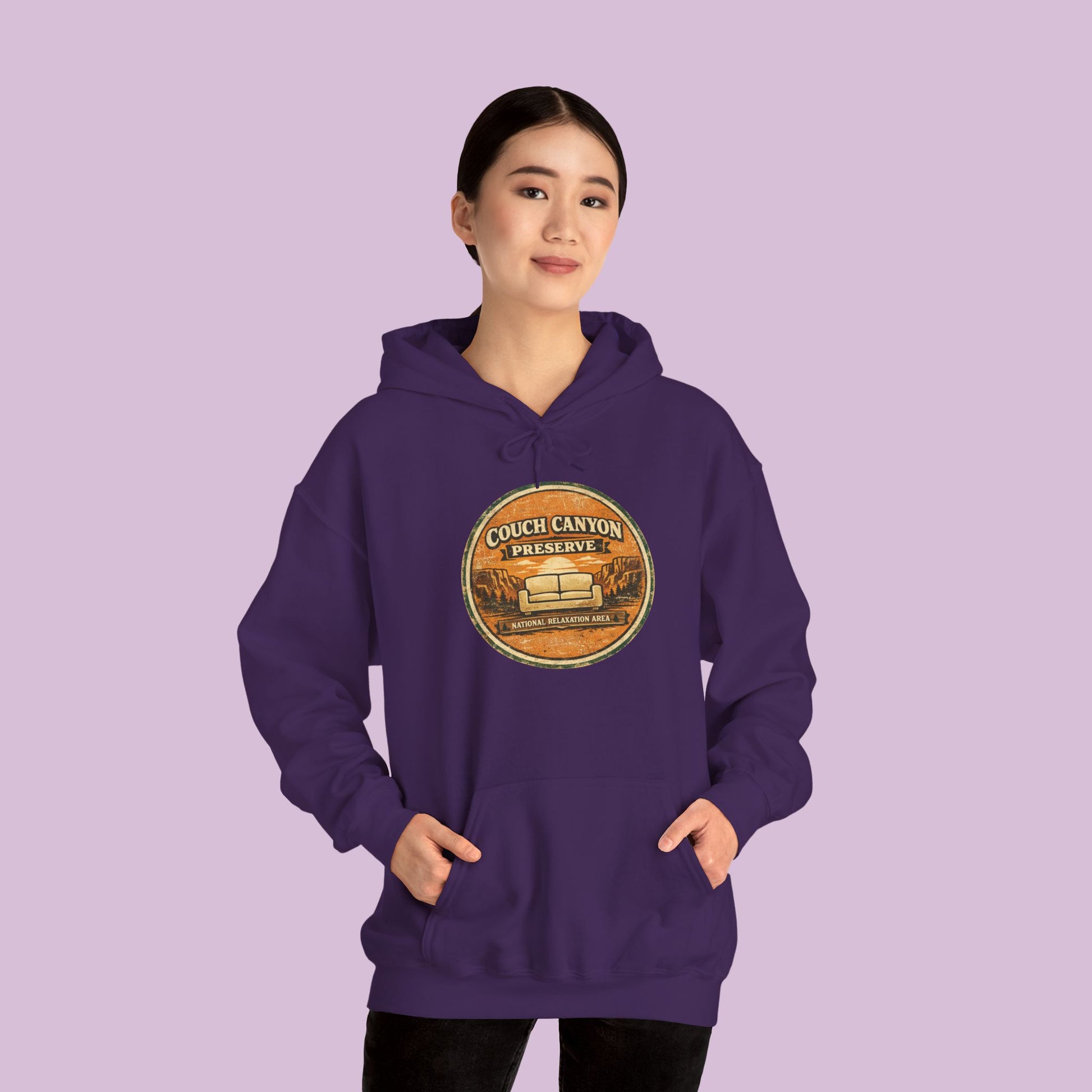 Welcome to the most comfortable preserve on the map. The Couch Canyon Preserve Hoodie celebrates the ultimate relaxation destination, where the only trail leads to the couch and the main activity is unwinding.