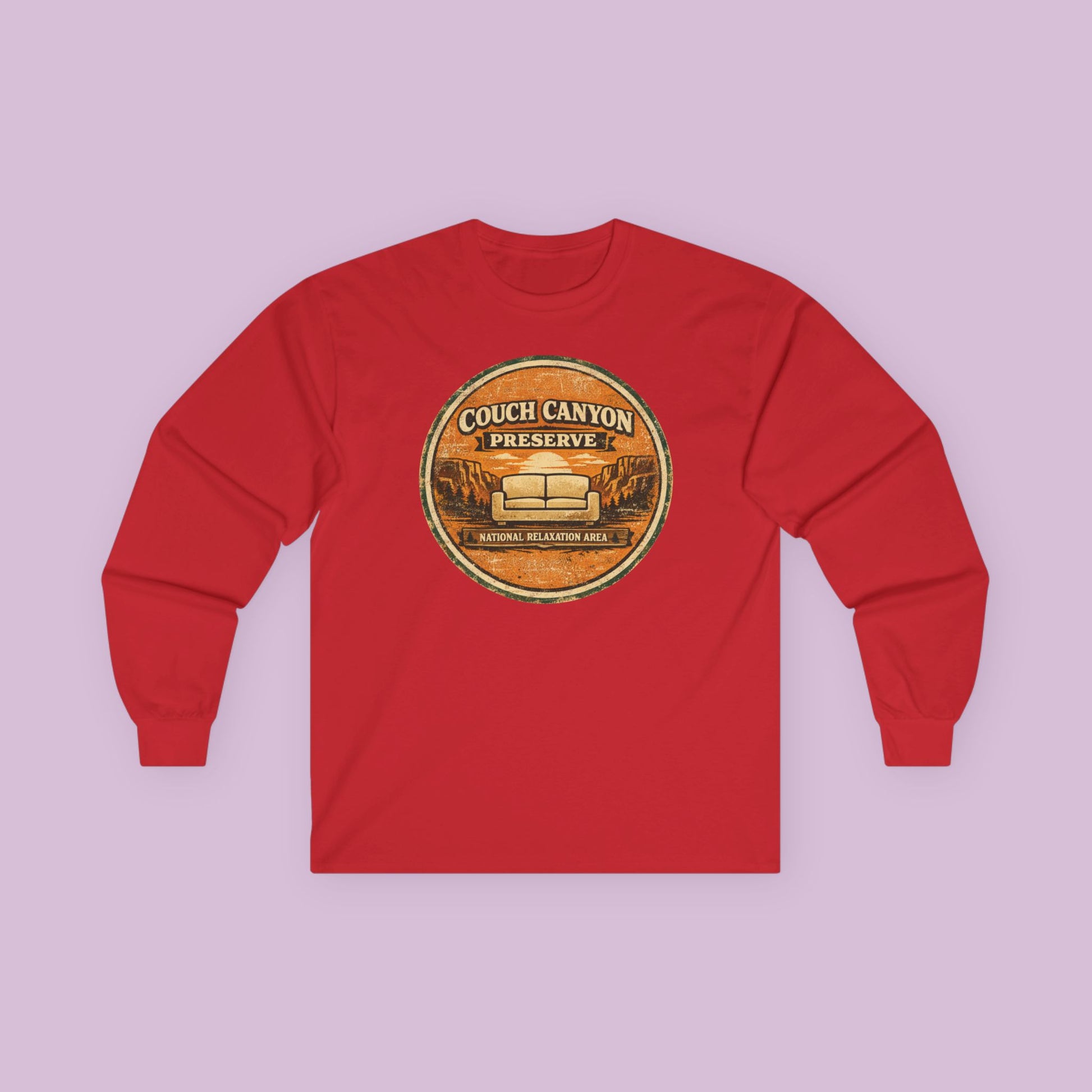 Featuring a vintage national park inspired badge design, this shirt showcases a canyon landscape with a cozy couch at the center and the proud designation “Couch Canyon Preserve – National Relaxation Area.” The distressed retro artwork gives the design a classic park patch feel while adding a playful twist for anyone who appreciates the art of relaxing.