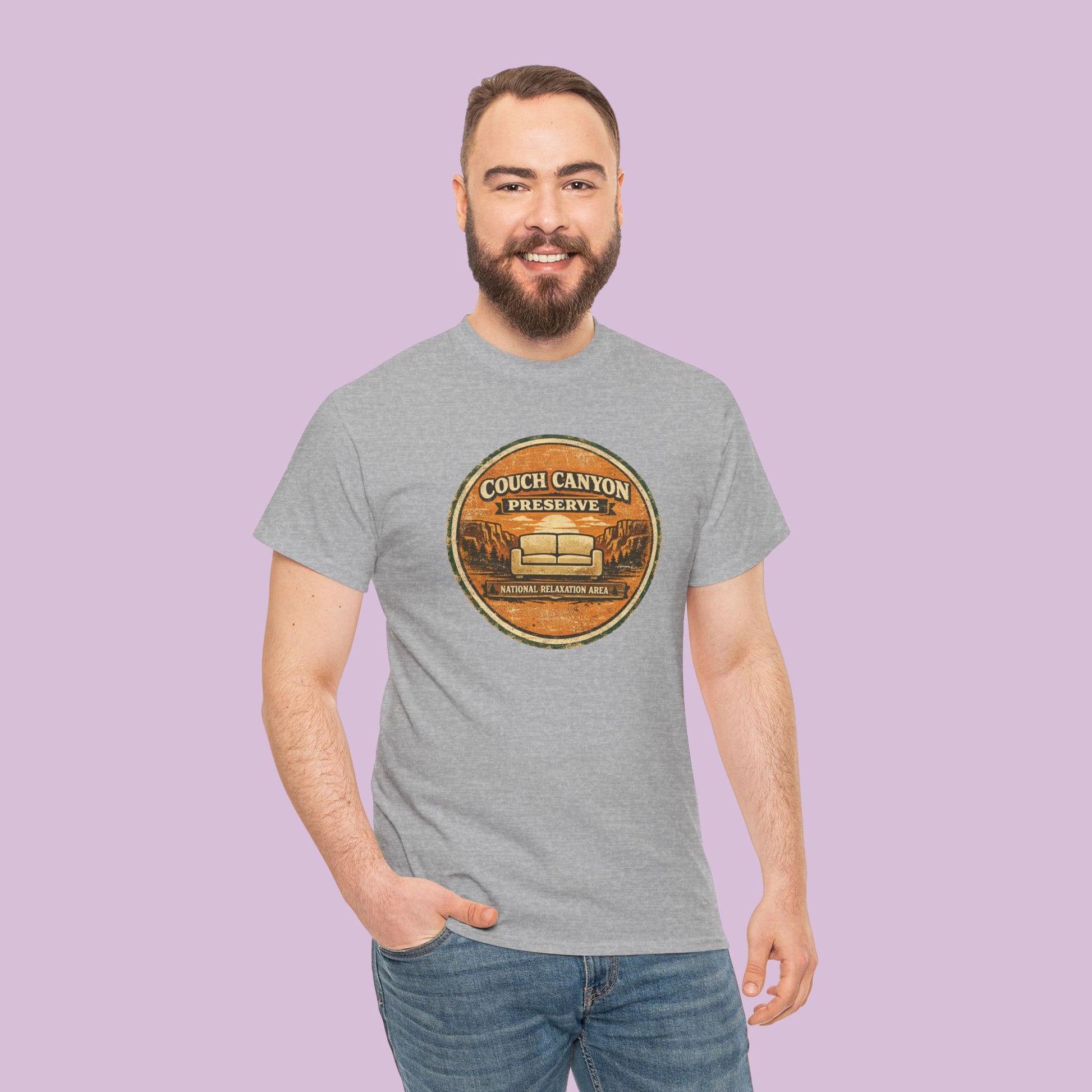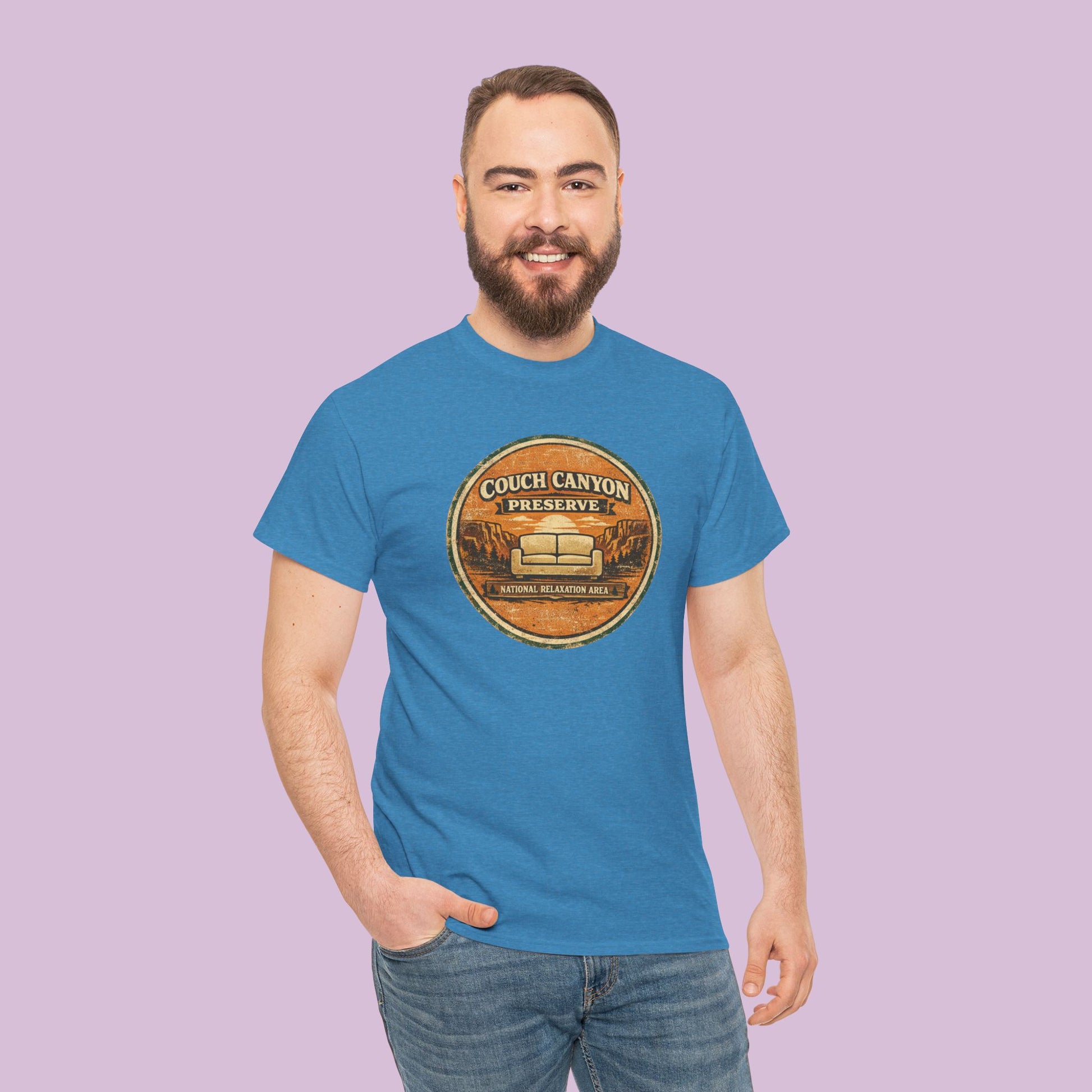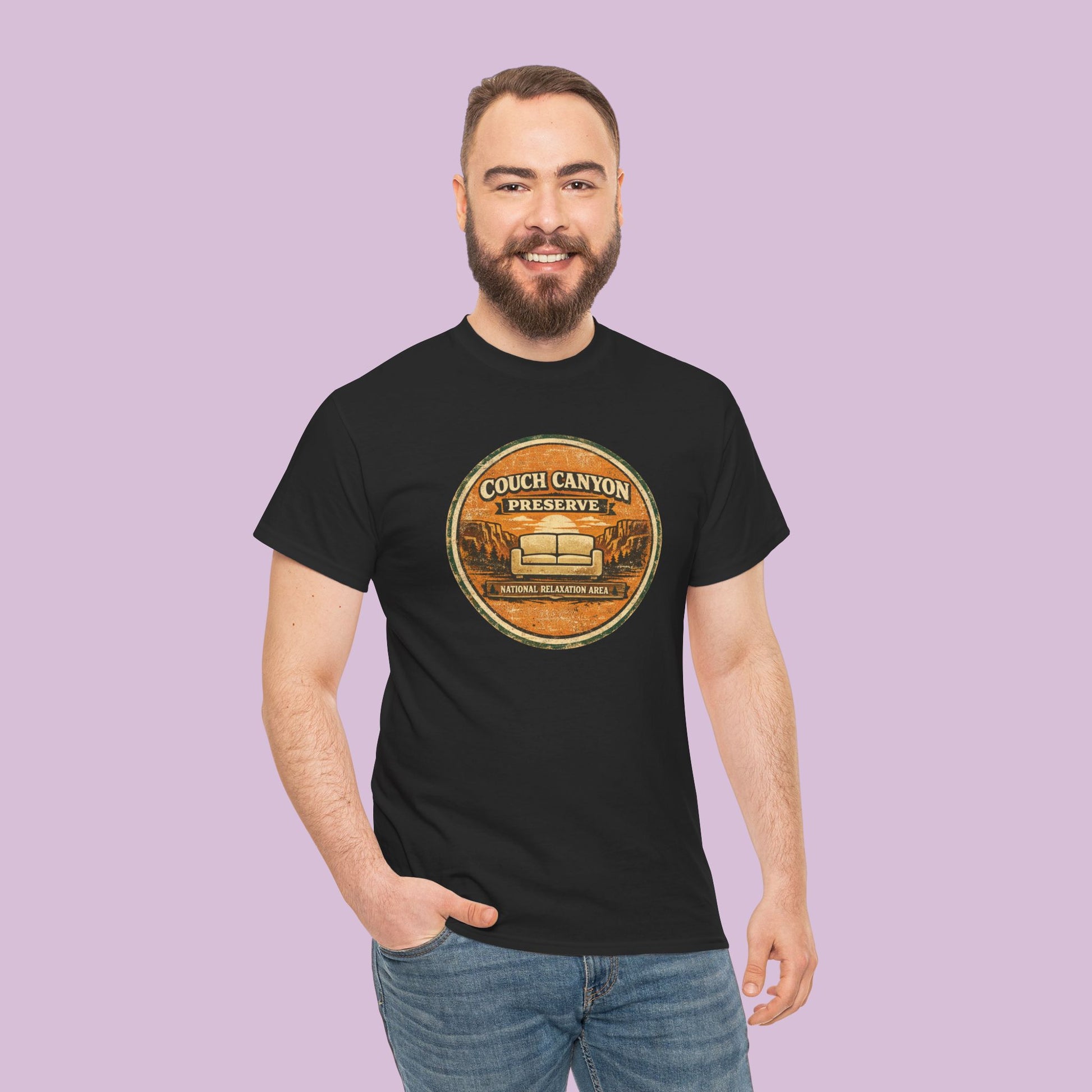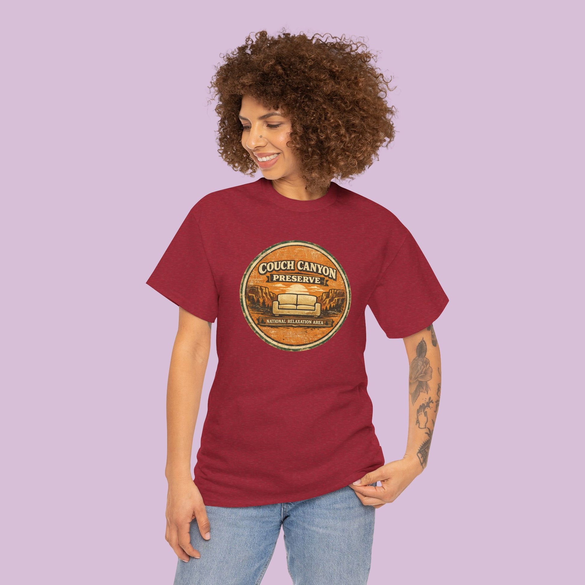 Designed in a vintage national park badge style, this tee features a cozy couch set against a canyon landscape with the proud designation “Couch Canyon Preserve – National Relaxation Area.” The distressed retro artwork gives the design a classic park patch feel while adding a playful twist for anyone who appreciates the art of doing absolutely nothing.