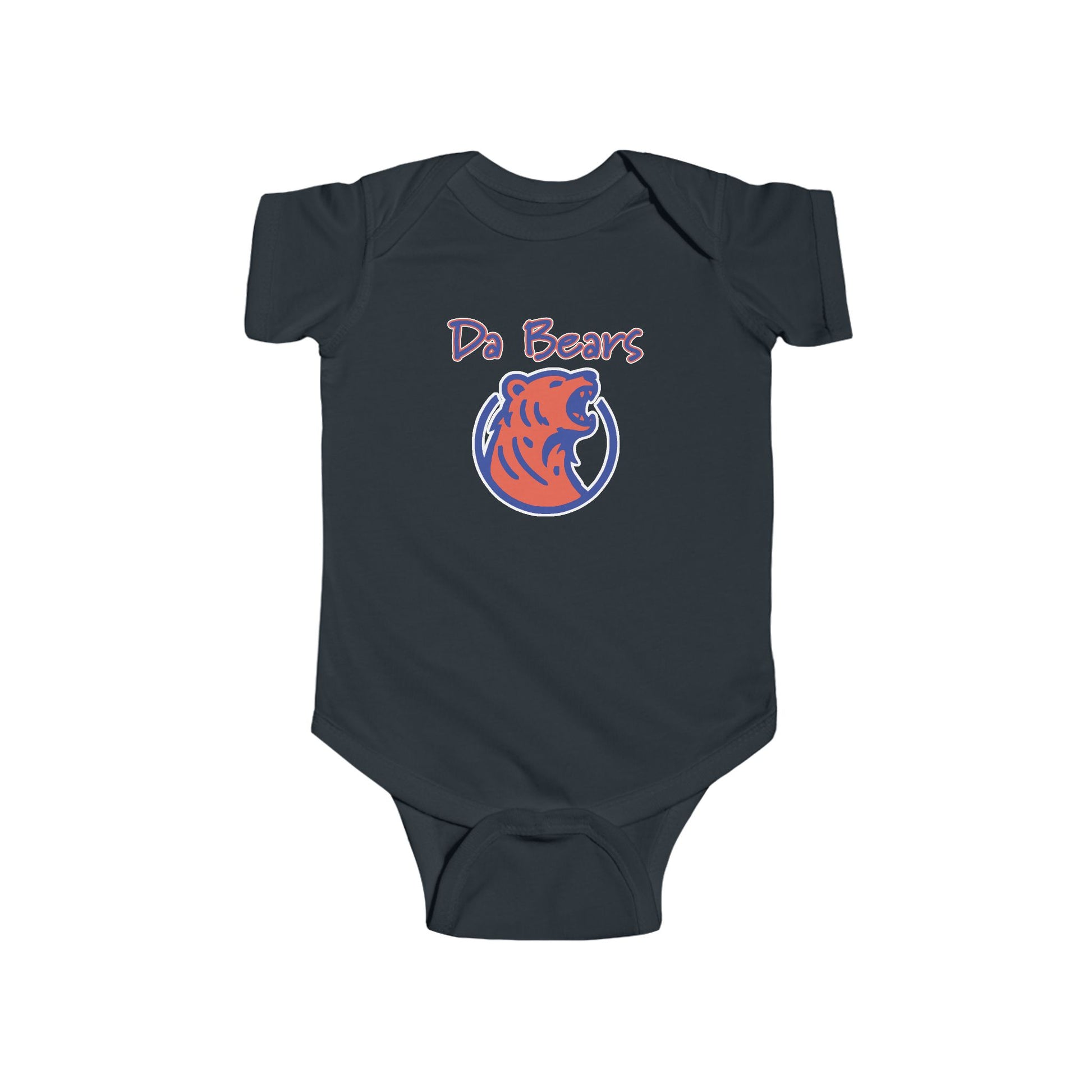 Soft, lightweight infant bodysuit featuring a playful "Da Bears" graphic — a warm, tiny reminder of game day spirit and family traditions. Made from smooth, combed ringspun cotton with ribbed knit binding and side seams, this onesie keeps its shape through washes while allowing little arms to move freely. Snaps at the crotch make diaper changes quick and fuss-free. The tear-away label prevents irritation on delicate skin. Machine-friendly and REACH certified, it slips easily into everyday wear: lounging at home, cheering from the couch during a game, or joining family gatherings where a bit of team pride shines through.