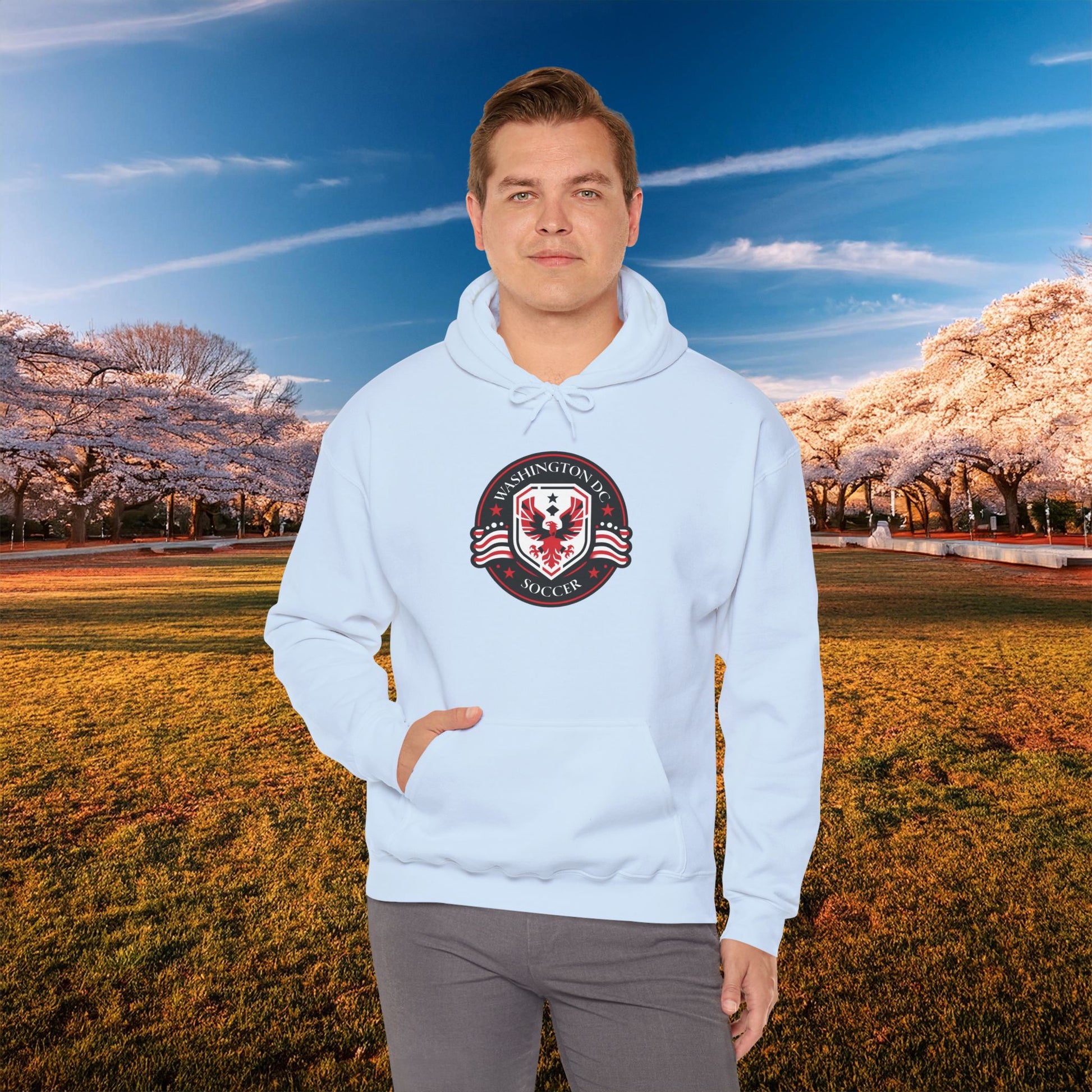 This DC United themed heavy blend hooded sweatshirt is relaxation itself. Made with a thick blend of cotton and polyester, it feels plush, soft and warm, a perfect choice for any cold day. In the front, the spacious kangaroo pocket adds daily practicality while the hood's drawstring is the same color as the base sweater for extra style points.