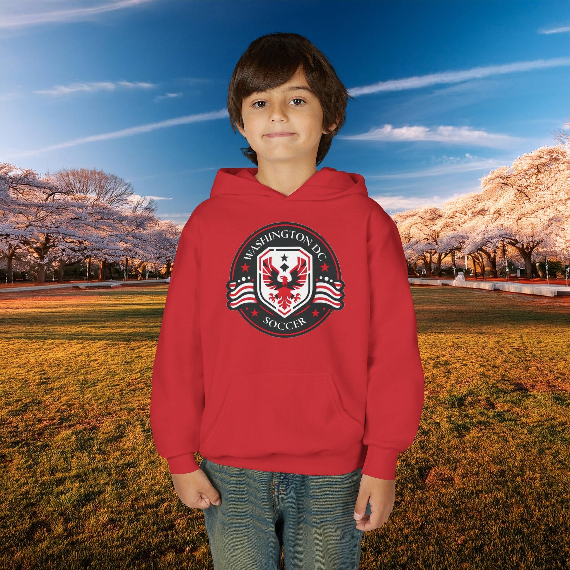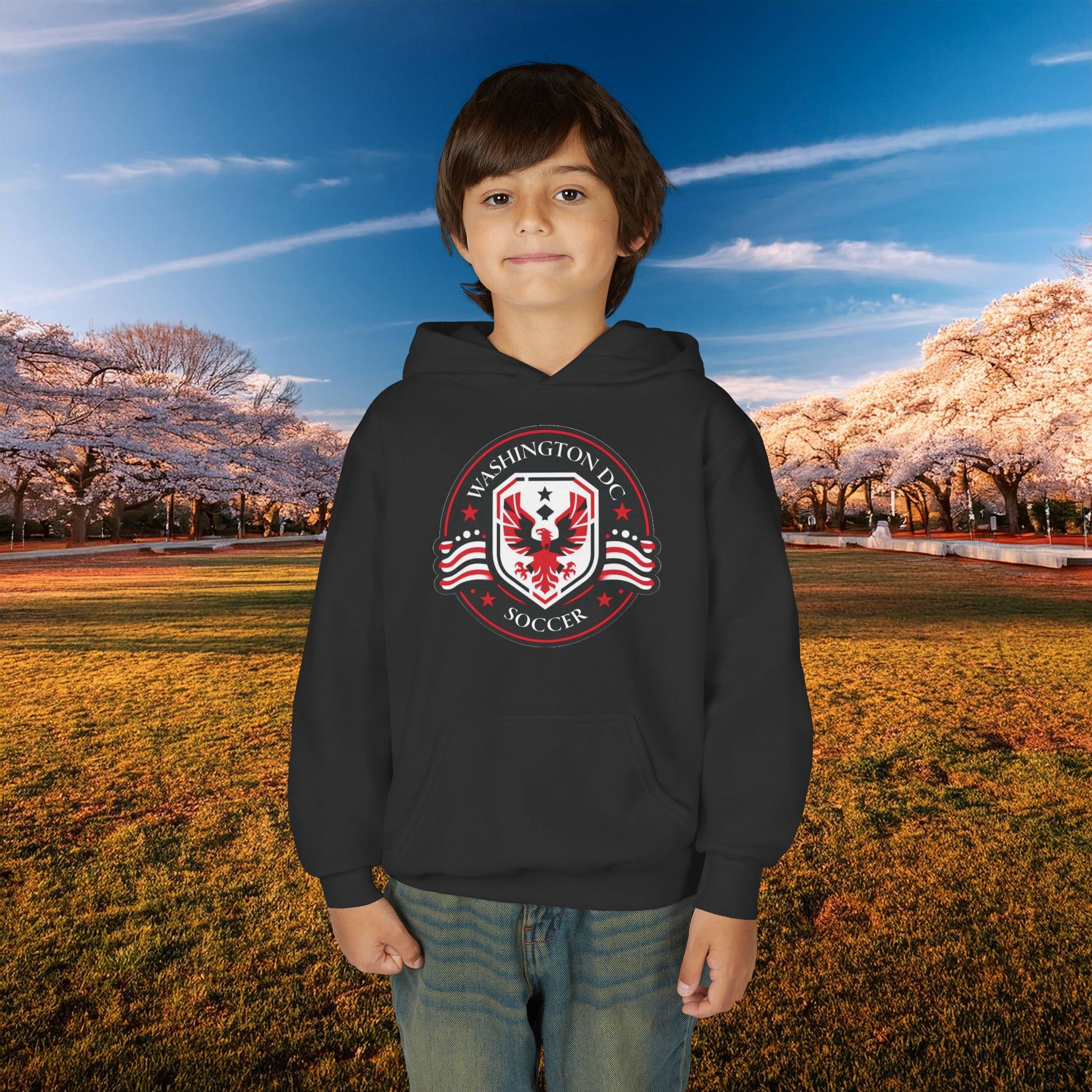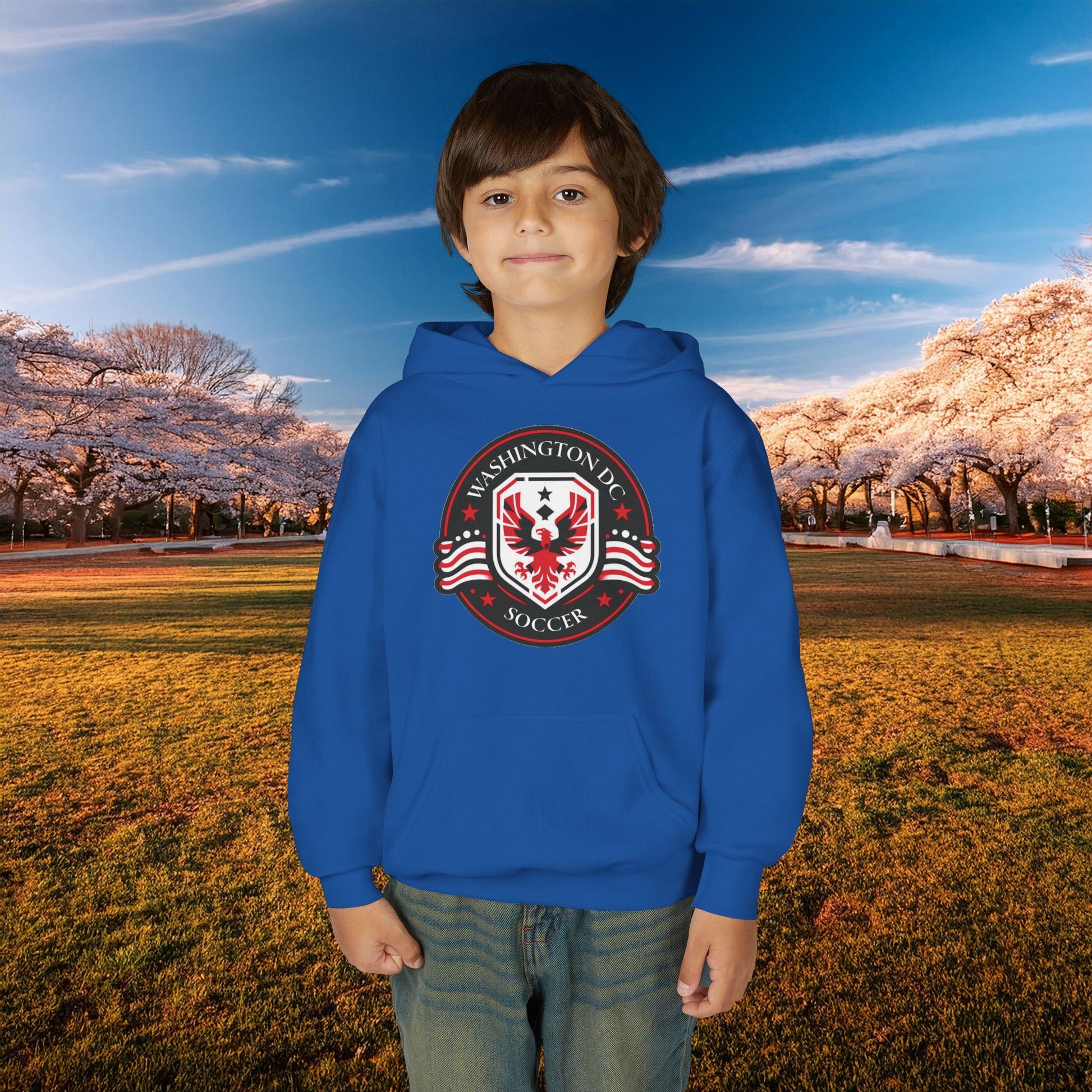 This DC United themed youth blend hooded sweatshirt is made of ultra-soft, preshrunk fleece that feels wonderful against the skin. The garment is 50% cotton 50% polyester with reduced lint buildup. The front has a kangaroo pocket big enough for both hands. The neck is reinforced with twill taping.