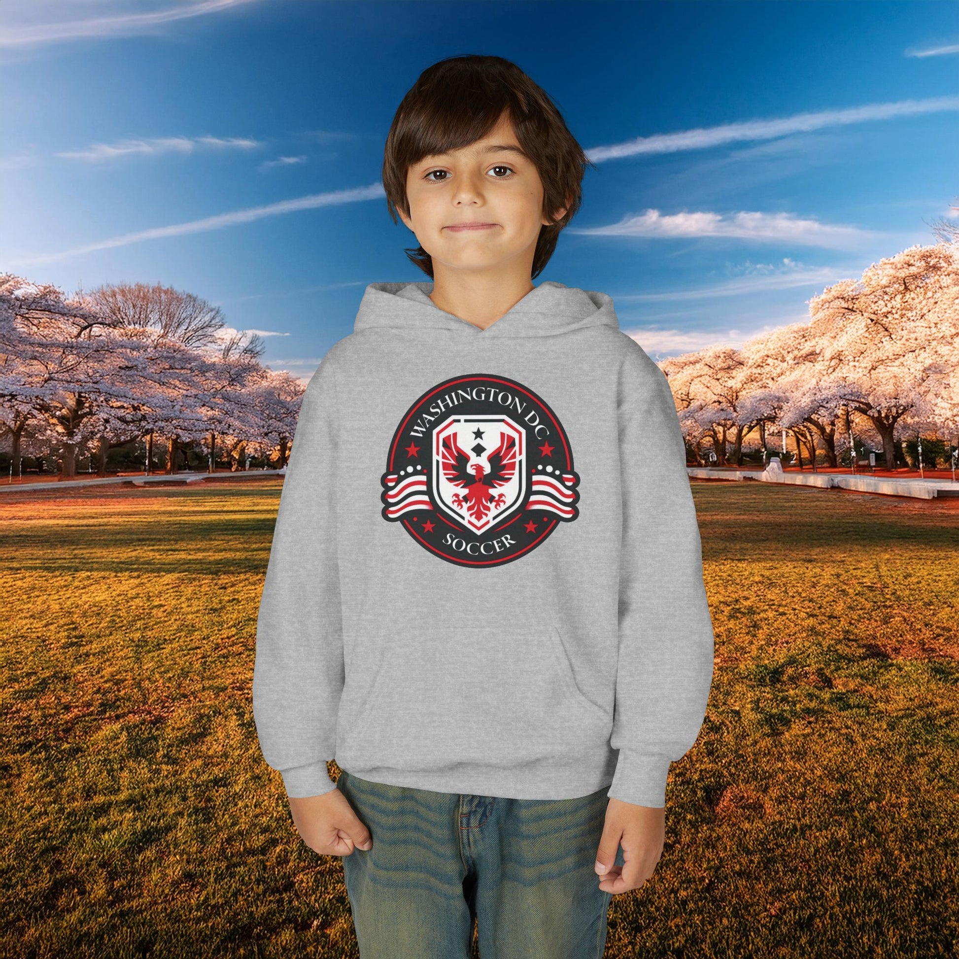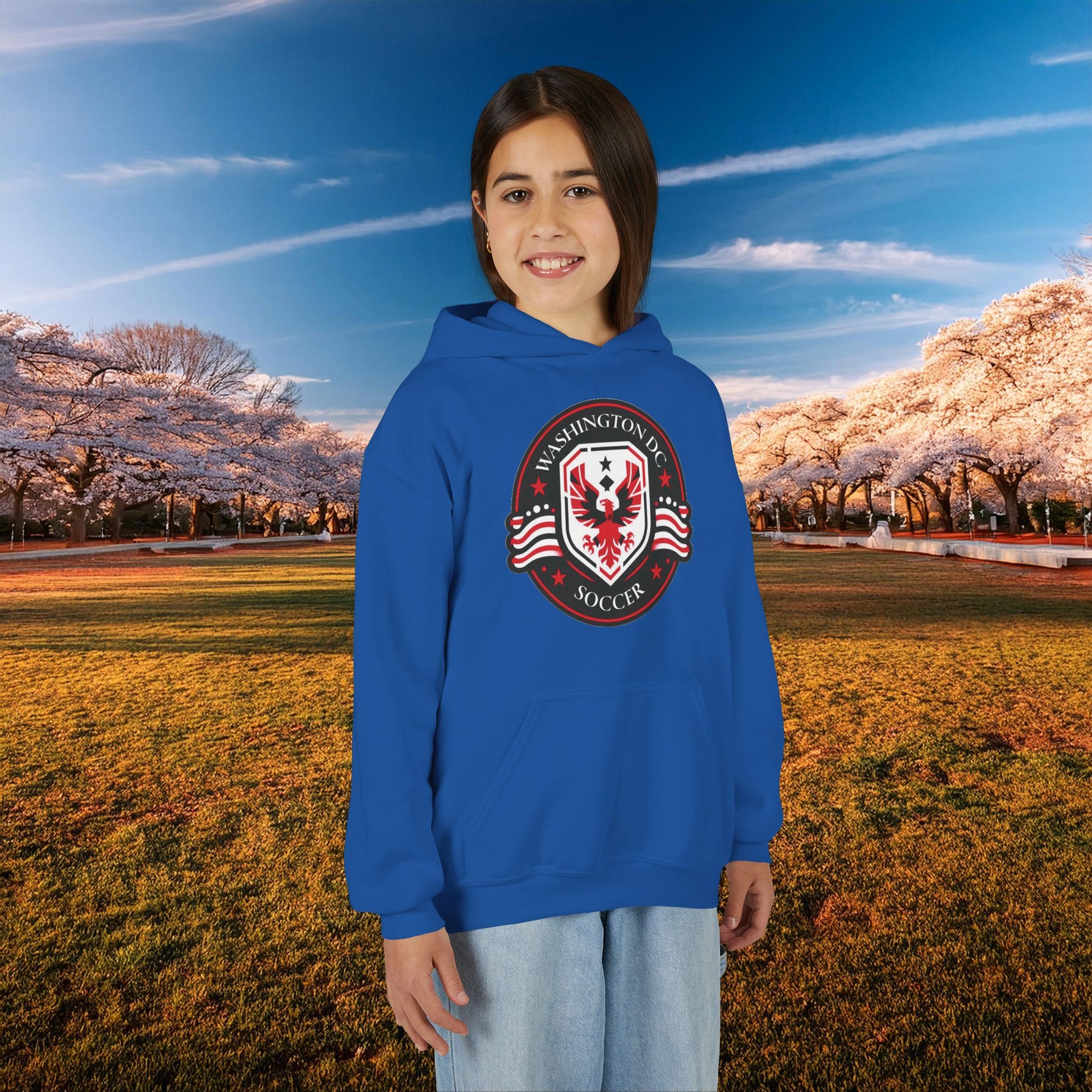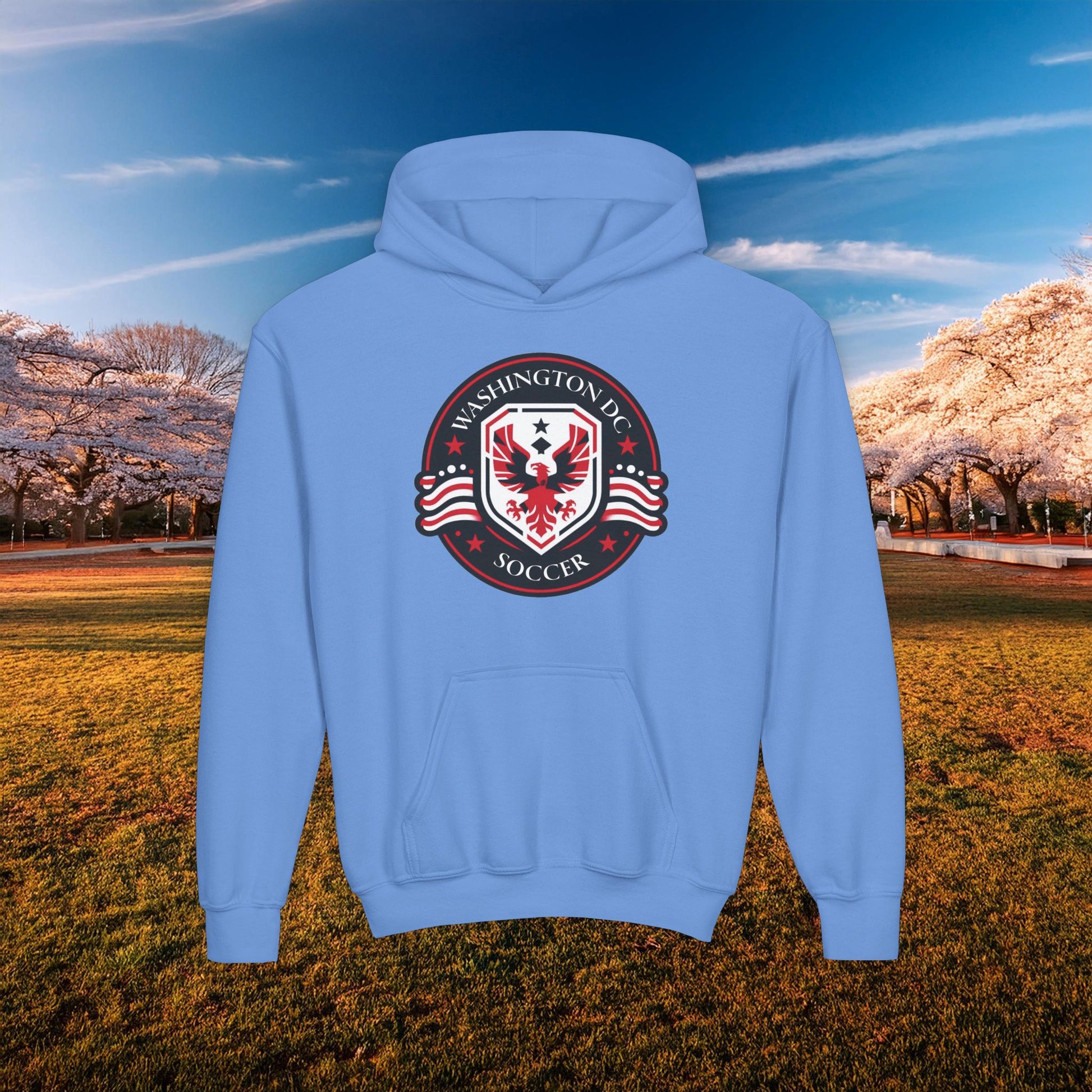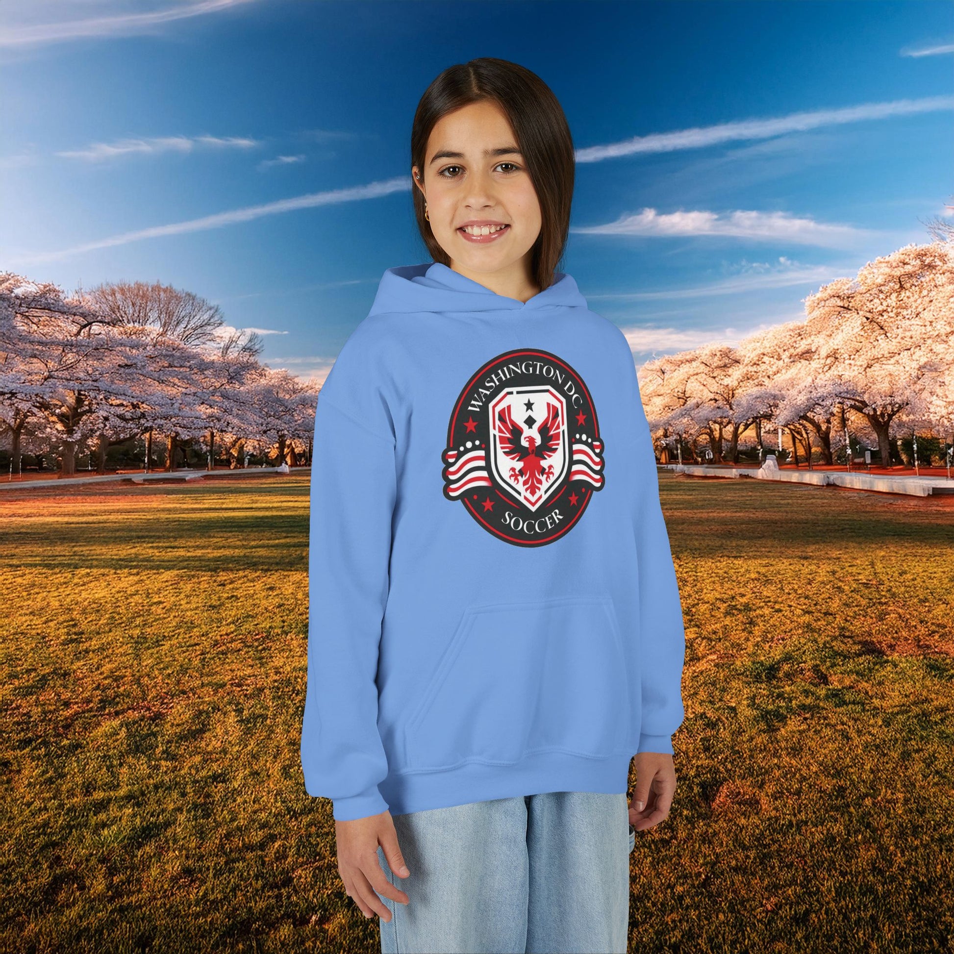 This DC United themed youth blend hooded sweatshirt is made of ultra-soft, preshrunk fleece that feels wonderful against the skin. The garment is 50% cotton 50% polyester with reduced lint buildup. The front has a kangaroo pocket big enough for both hands. The neck is reinforced with twill taping.