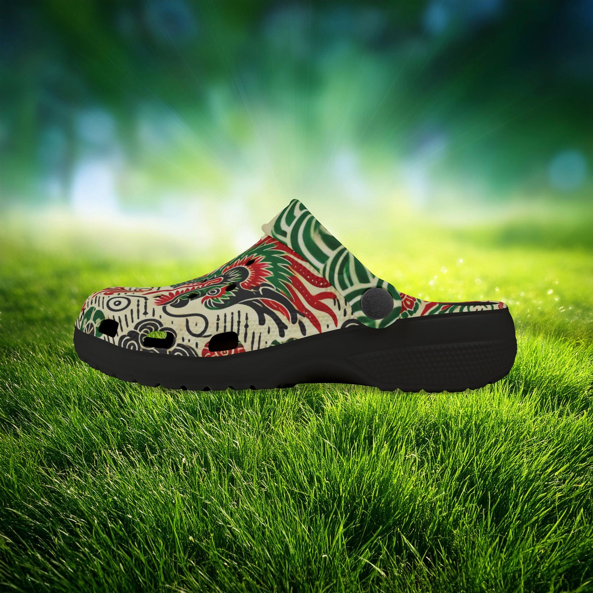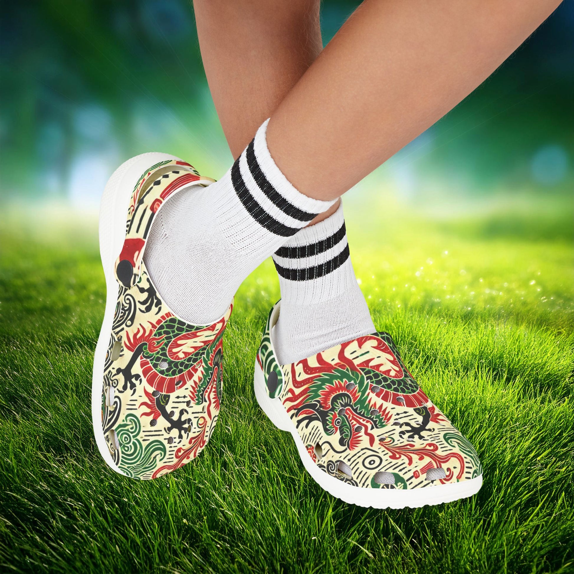 The perfect companion to a kid's adventure is here -- meet the dragon dance clogs for kids. Made with EVA foam, they offer a plush feel for day-long coziness, excellent arch support, and shock absorption for hard surfaces. The design adds a unique touch, showcasing vibrant personality and style.