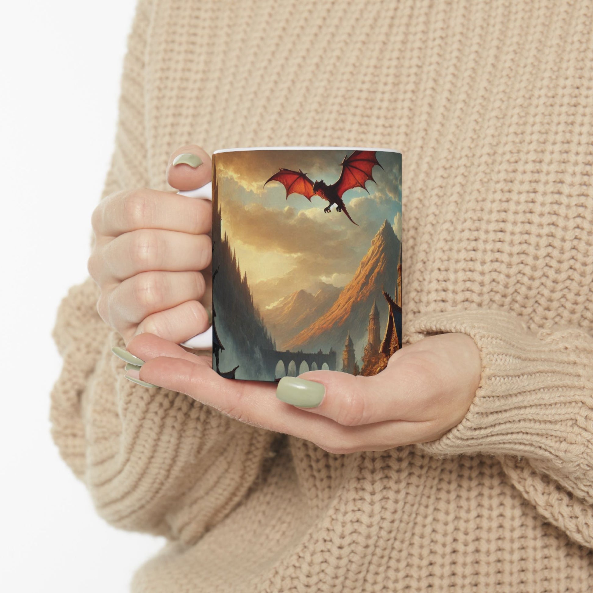 Sip slowly and step into a story. This glossy ceramic mug wraps a sweeping fantasy scene—towering stone spires, misty mountains, and a red-winged dragon circling an ancient keep. Morning light and drifting clouds give the artwork a lived-in, painterly warmth that turns your coffee or tea into a moment of calm adventure. It sits naturally in a creative morning routine, on sketch-dappled desks, or beside a stack of favorite fantasy novels. The comfortable C-handle and shiny white interior keep everyday use effortless while the bright, resilient print keeps the scene vibrant through many washes and reheats. For people who collect worlds as much as mugs, this brings a little castle-and-dragon magic to ordinary days.