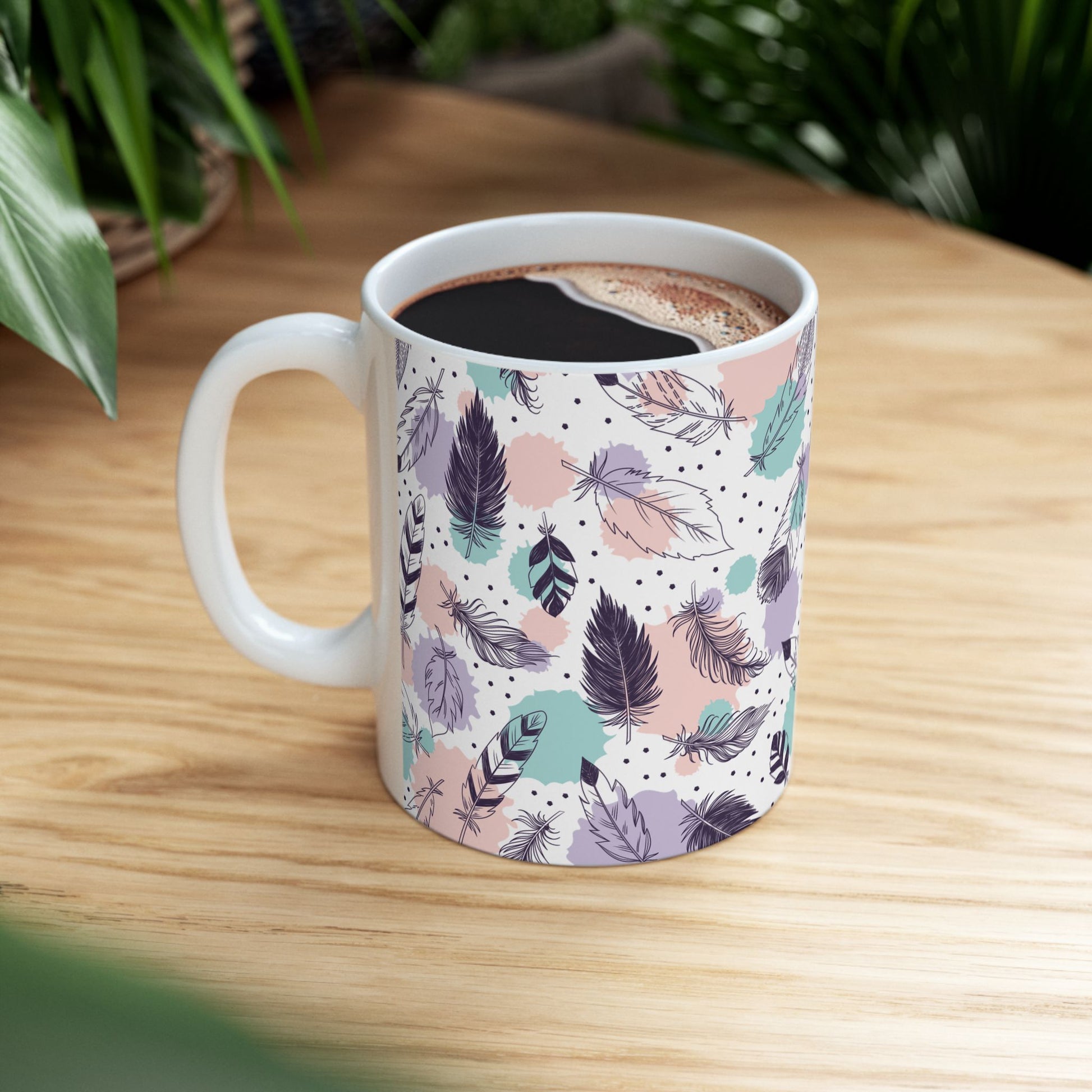 Sip in a soft, dreamy moment with this feather-patterned ceramic mug. Muted mauves, mint greens, and warm blush brush across delicate feather illustrations, creating a calm, whimsical scene that brightens quiet mornings and slow afternoons. The glossy white ceramic makes the colors pop while the comfortable C-handle keeps every reach easy. Whether it’s desk-side coffee, a late-night tea, or a comforting cocoa, this mug brings a gentle, handcrafted vibe to everyday rituals.