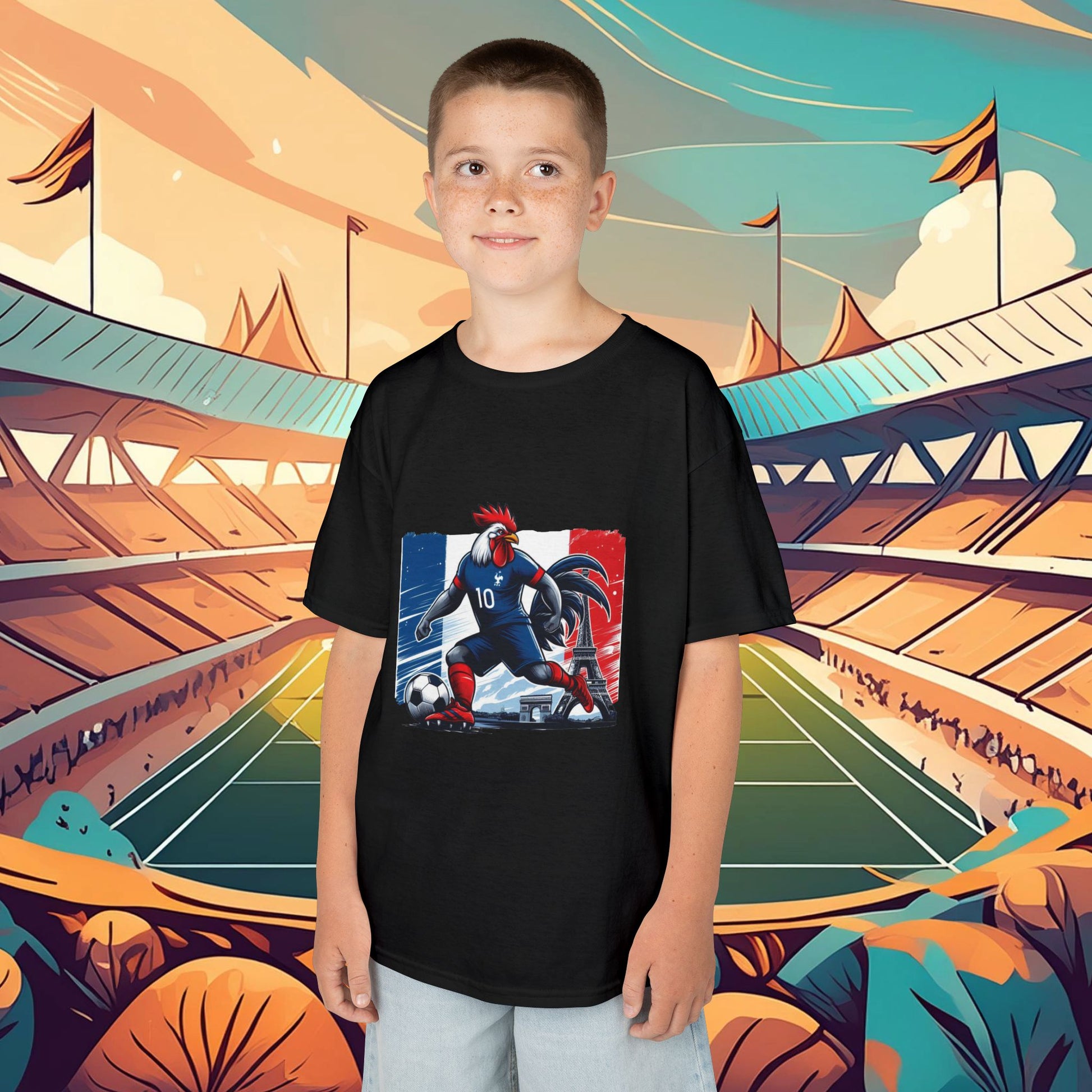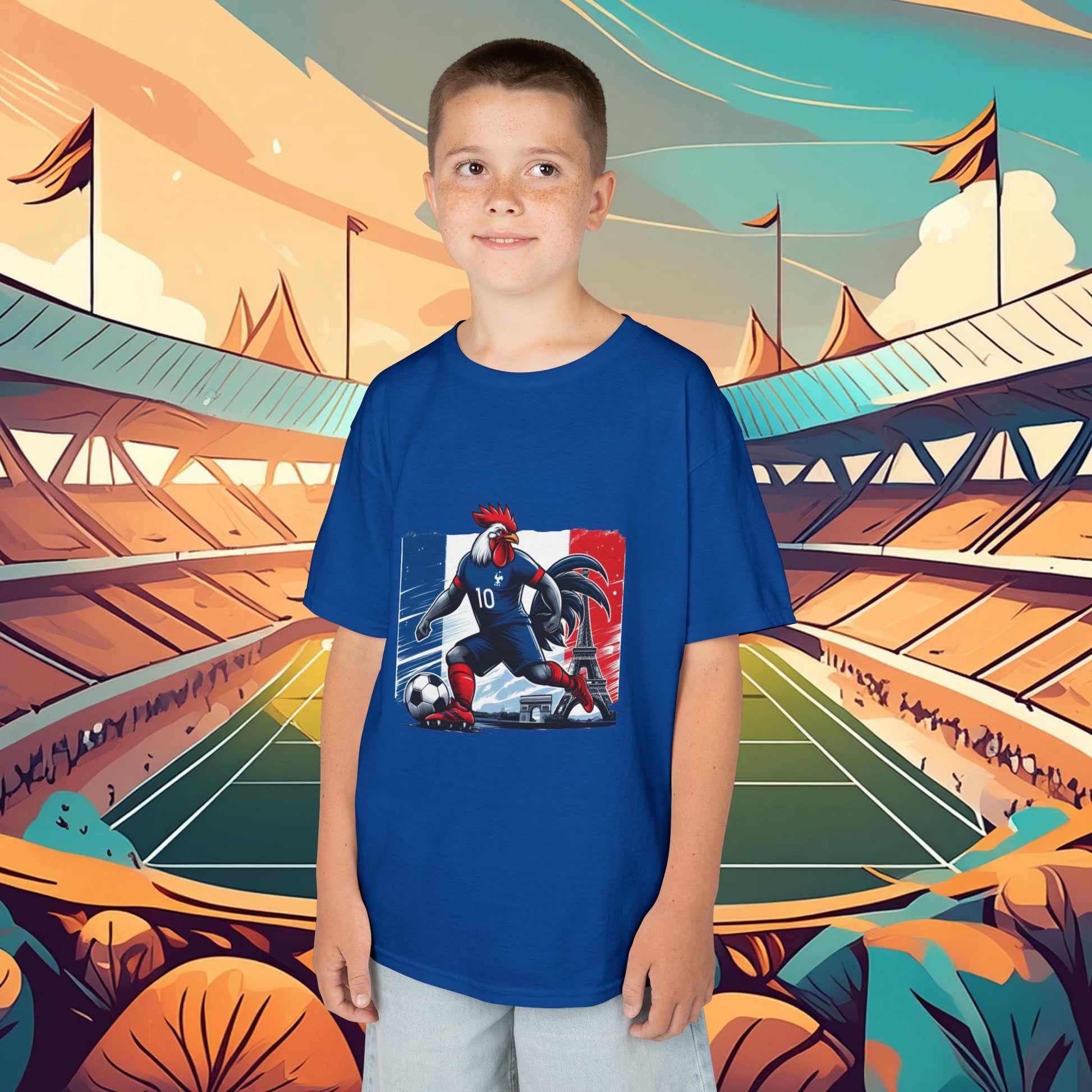 This French football themed kids heavy cotton tee is perfect for everyday use. The fabric is 100% cotton for solid colors. Polyester is included for heather-color variants. The shoulders have twill tape for improved durability. The collar is curl resistant due to ribbed knitting. There are no seams along the sides.