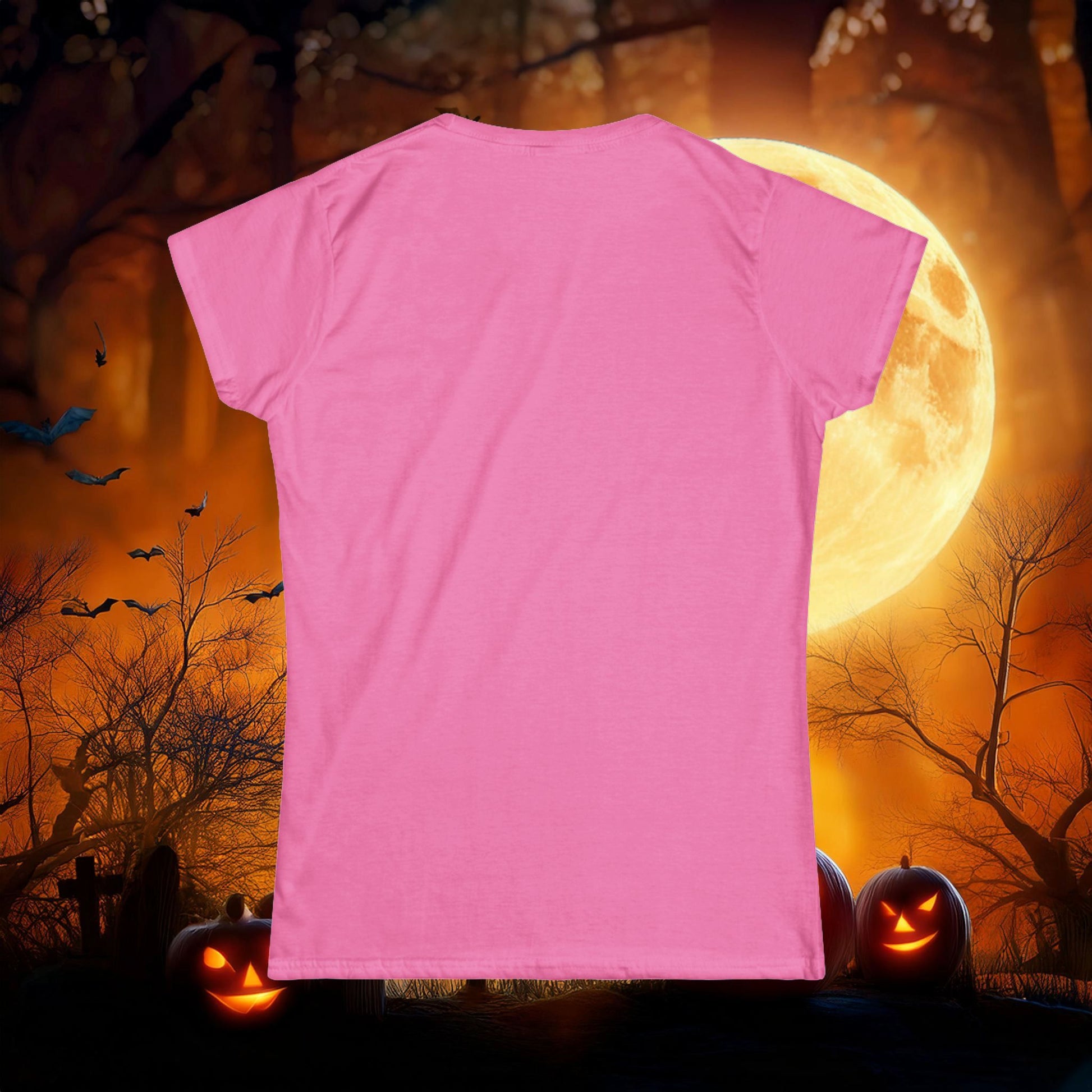 This Halloween themed woman's softstyle tee is a more feminine take on the classic tee. The sleeves are shortened to reveal some shoulder. The fabric is 100% ringspun cotton for all solid colors. The shoulders are taped with twill to prolong durability. The collar seam is reinforced with ribbed knitting.
