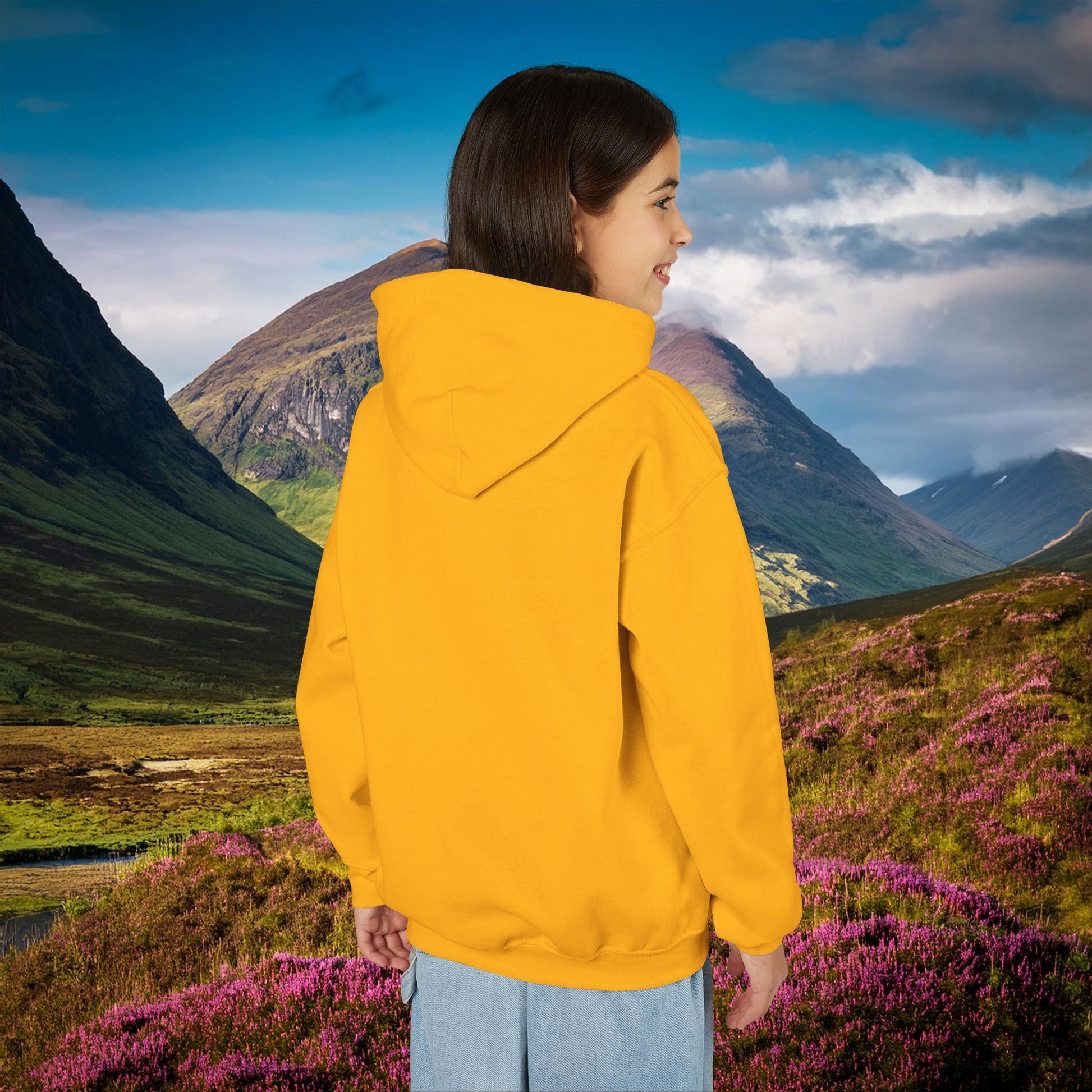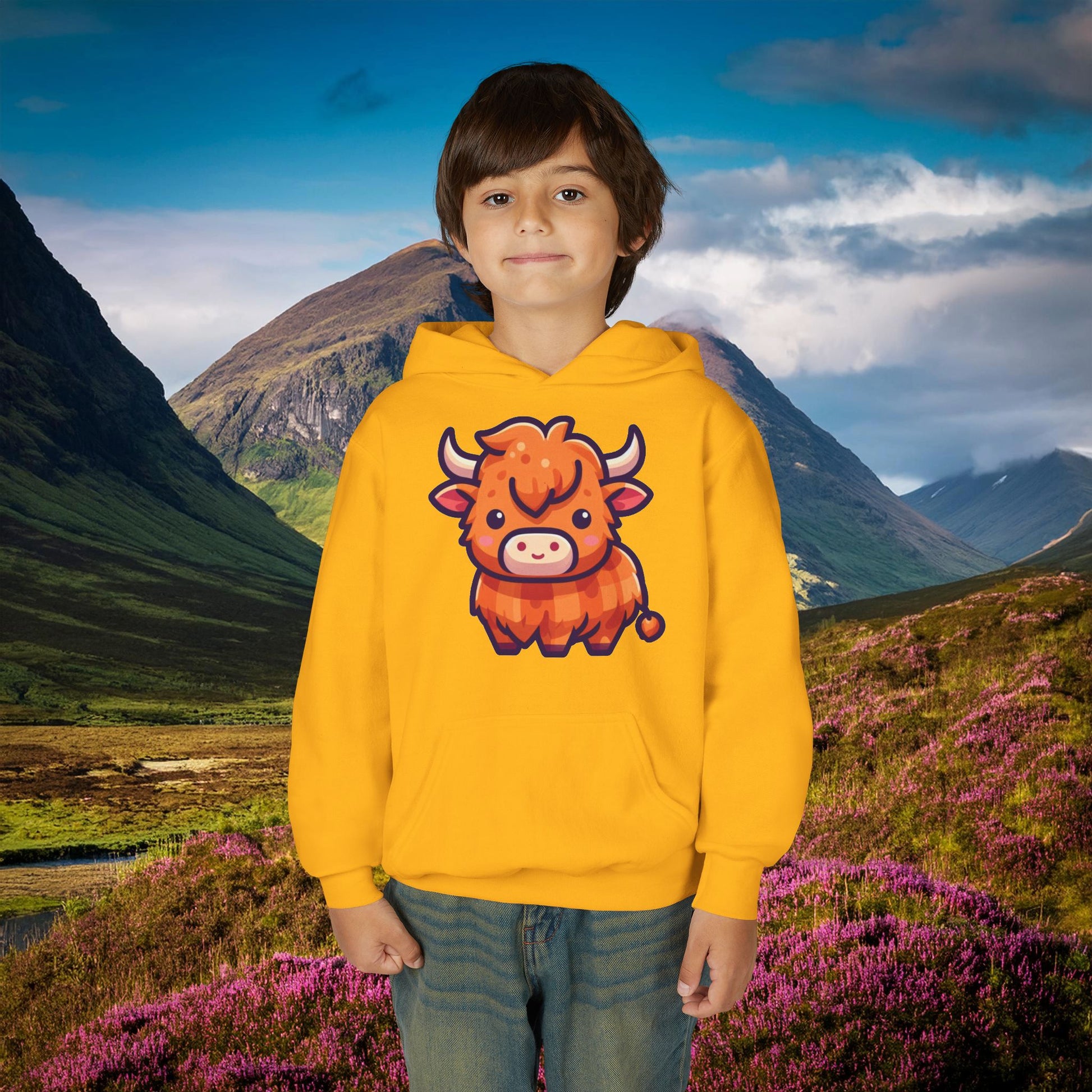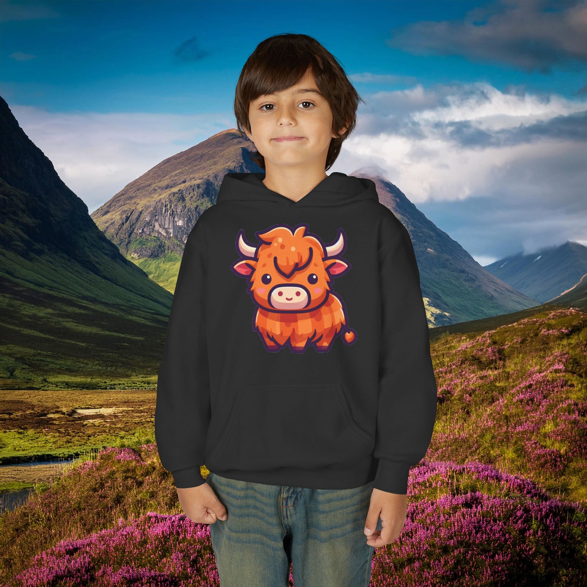 This Scottish Highland Coo youth blend hooded sweatshirt is made of ultra-soft, preshrunk fleece that feels wonderful against the skin. The garment is 50% cotton 50% polyester with reduced lint buildup. The front has a kangaroo pocket big enough for both hands. The neck is reinforced with twill taping.