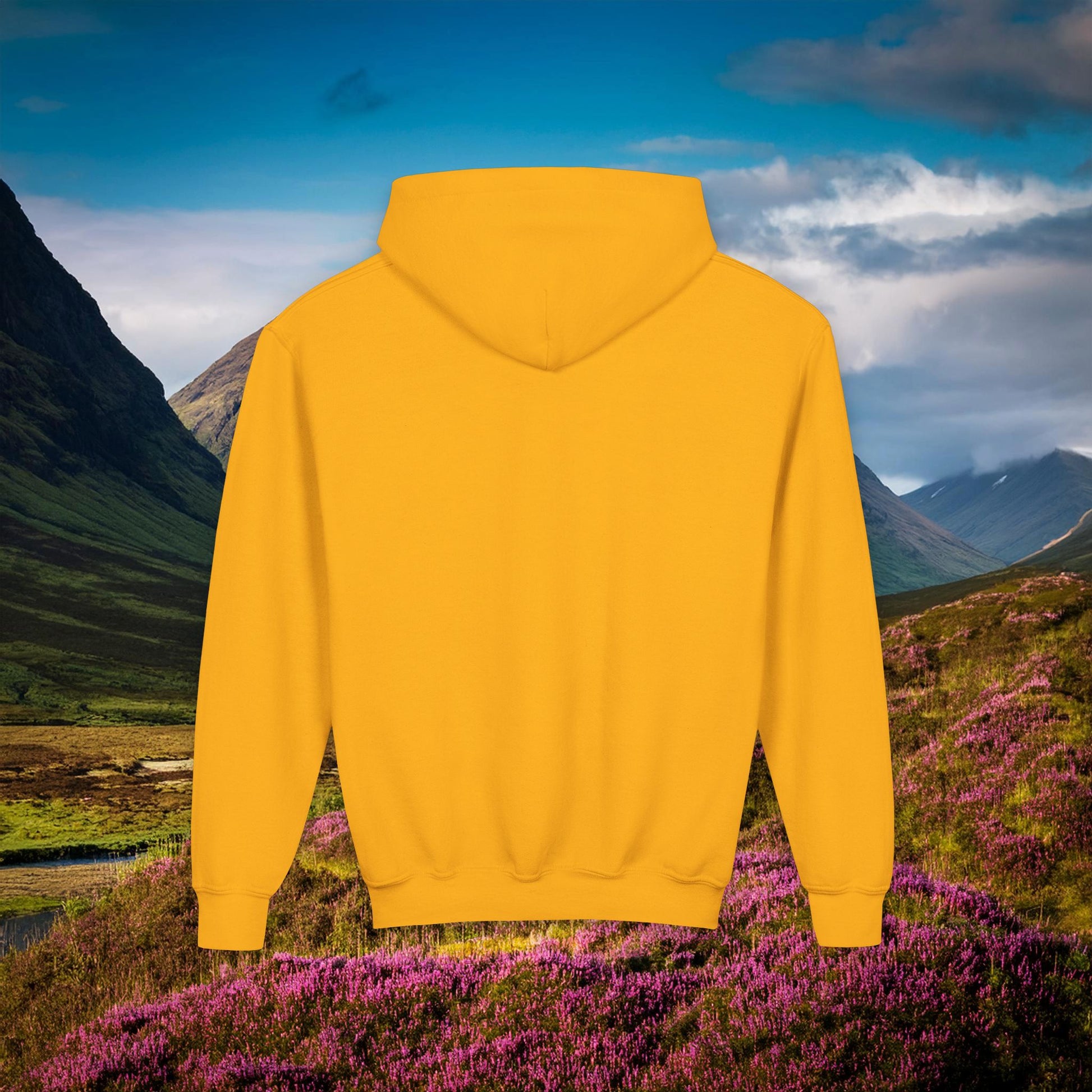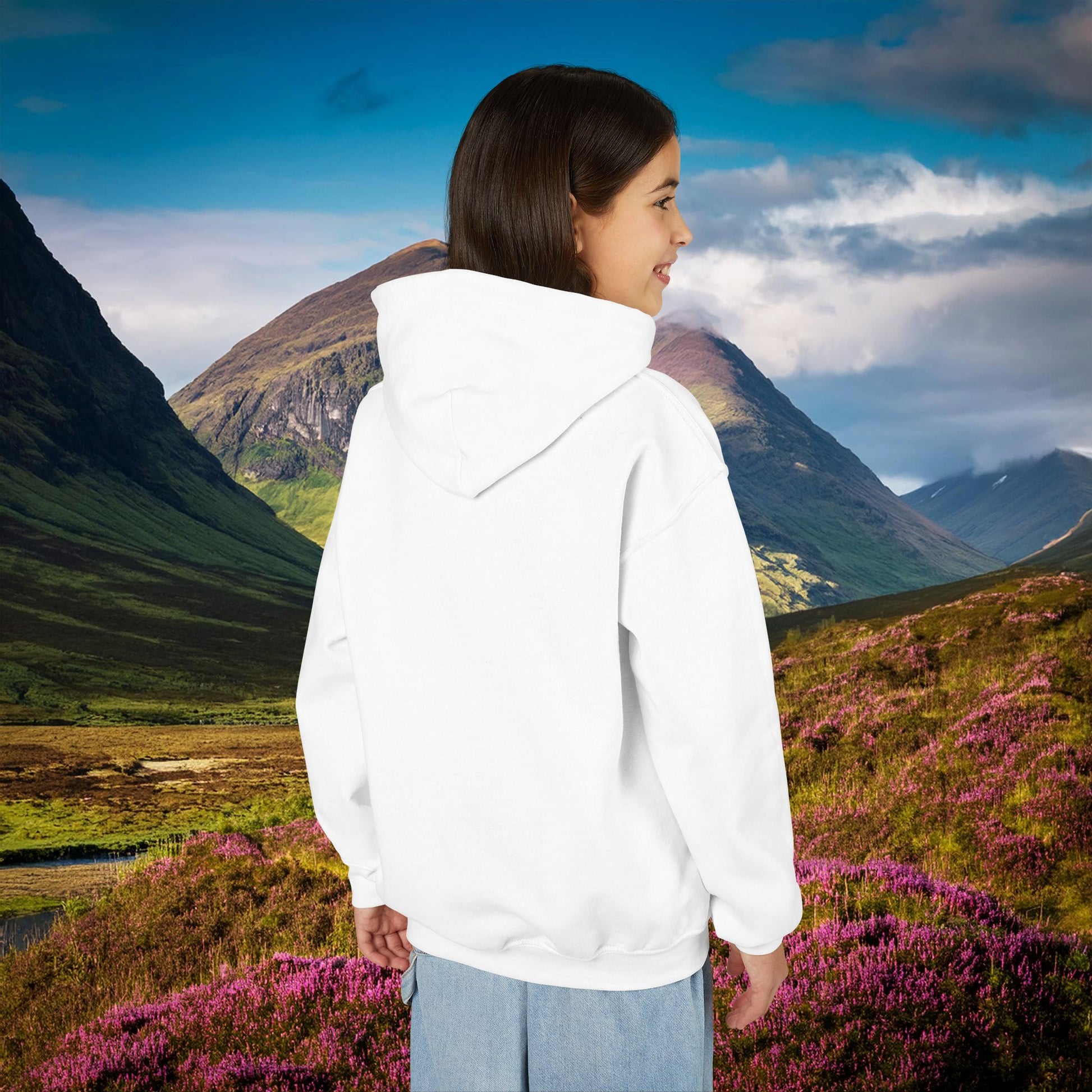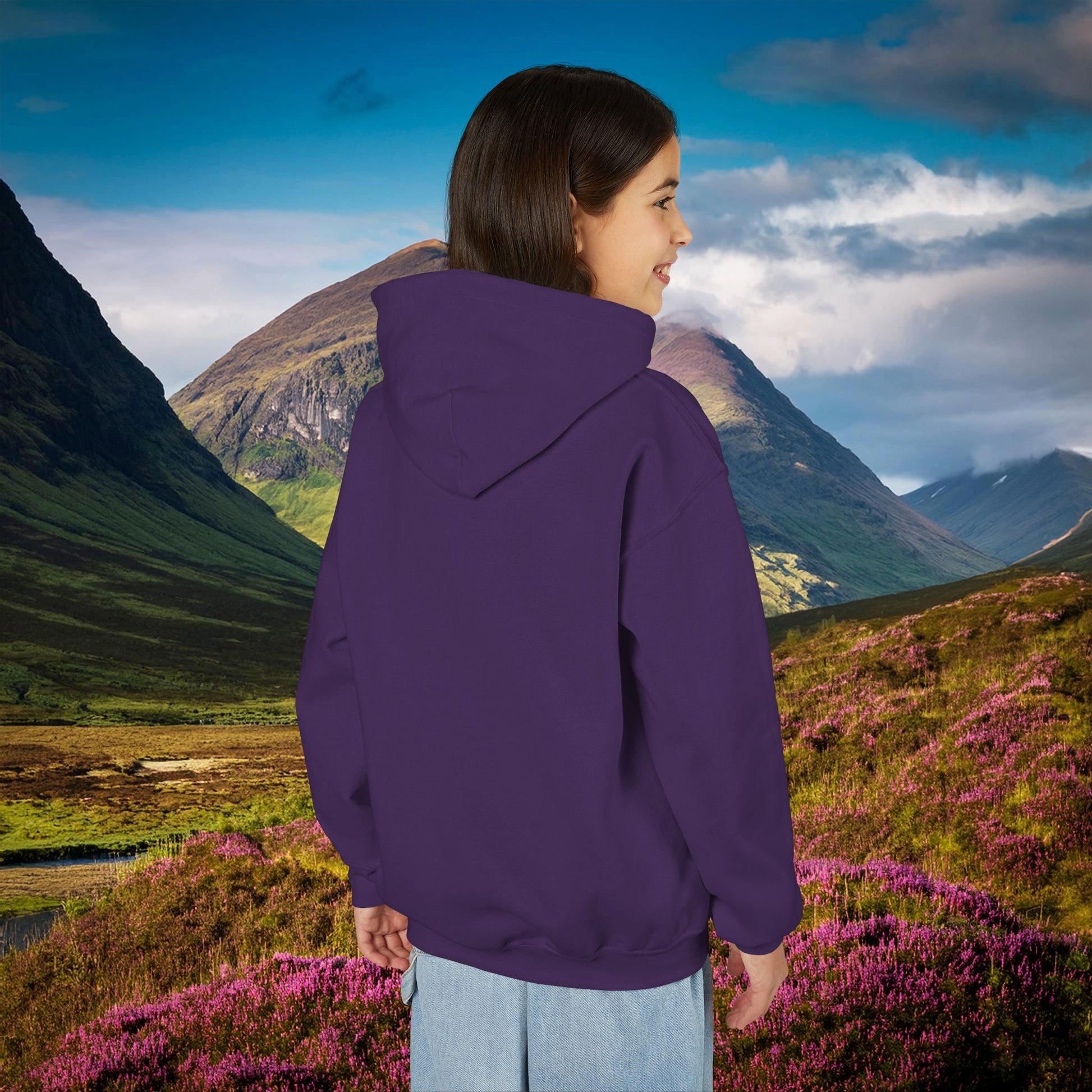 This Scottish Highland Coo youth blend hooded sweatshirt is made of ultra-soft, preshrunk fleece that feels wonderful against the skin. The garment is 50% cotton 50% polyester with reduced lint buildup. The front has a kangaroo pocket big enough for both hands. The neck is reinforced with twill taping.