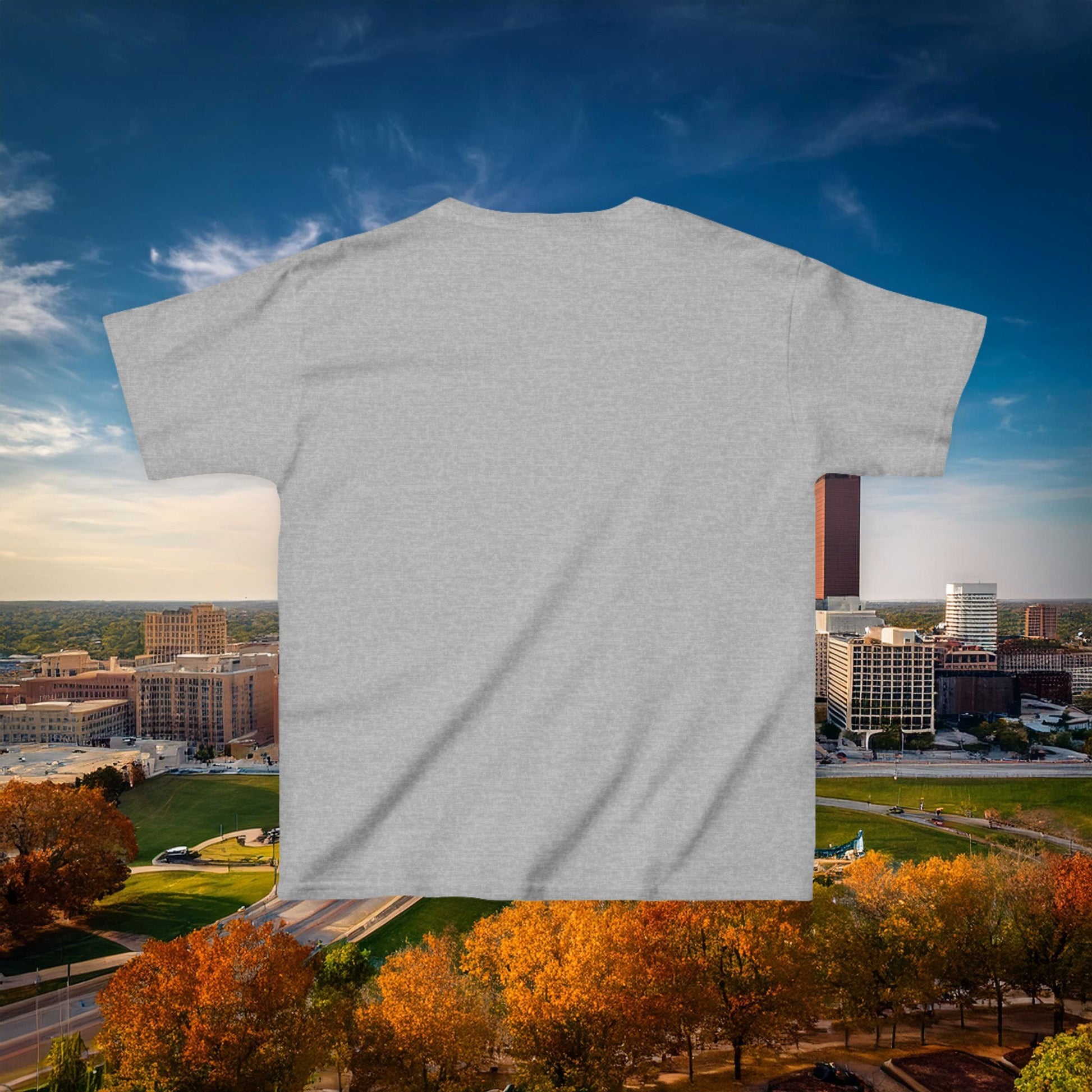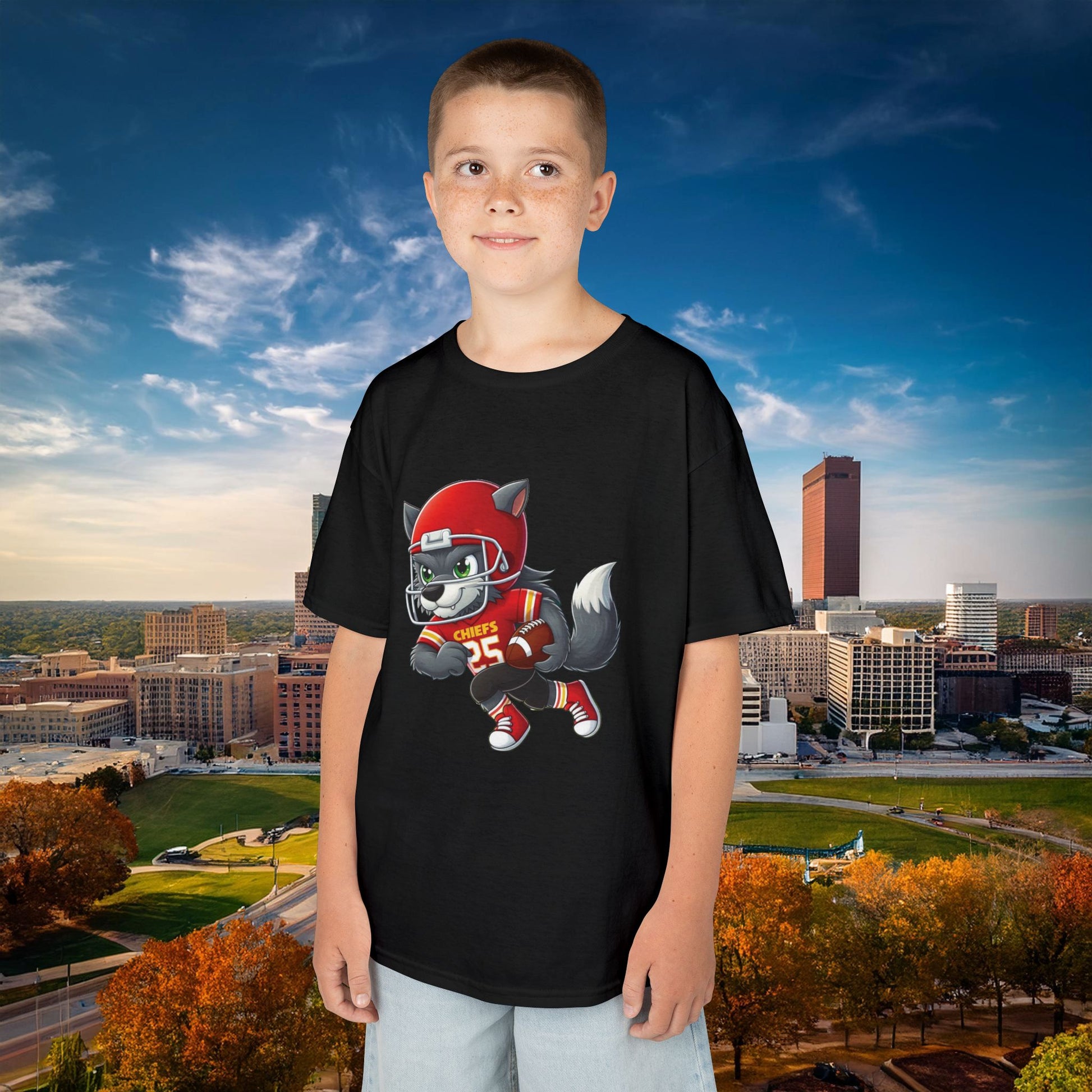 This Kansas City Chiefs themed kids heavy cotton tee is perfect for everyday use. The fabric is 100% cotton for solid colors. Polyester is included for heather-color variants. The shoulders have twill tape for improved durability. The collar is curl resistant due to ribbed knitting. There are no seams along the sides.