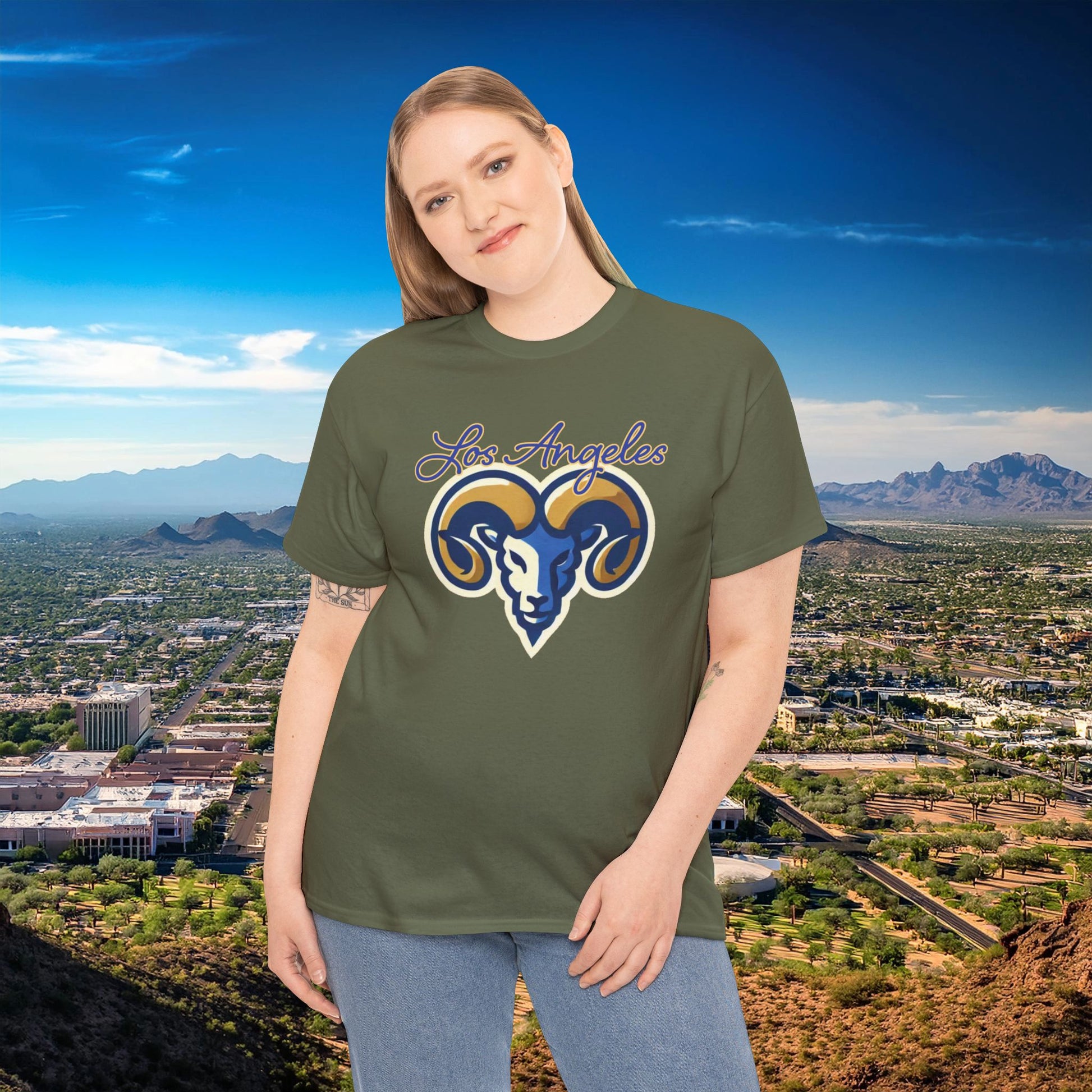 Breathe in sunlit streets and stadium cheers. This soft, classic tee carries a hand-drawn ram emblem and flowing “Los Angeles” script across the chest — a quiet nod to hometown pride without shouting. It sits relaxed on the shoulders, sleeves that don’t cling, and a crew neckline that keeps the silhouette clean. Wear it on city walks, weekend coffee runs, or to low-key game-day gatherings. The subtle speckled Natural option and smooth print detail give it lived-in character from the first wear. It’s for people who collect local memories: sunrise drives, corner tacos, and the roar of a crowd when your team takes the field.