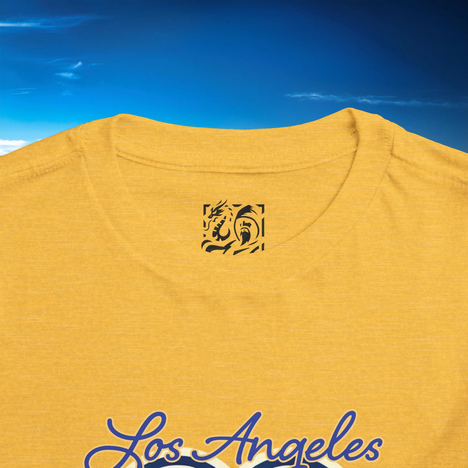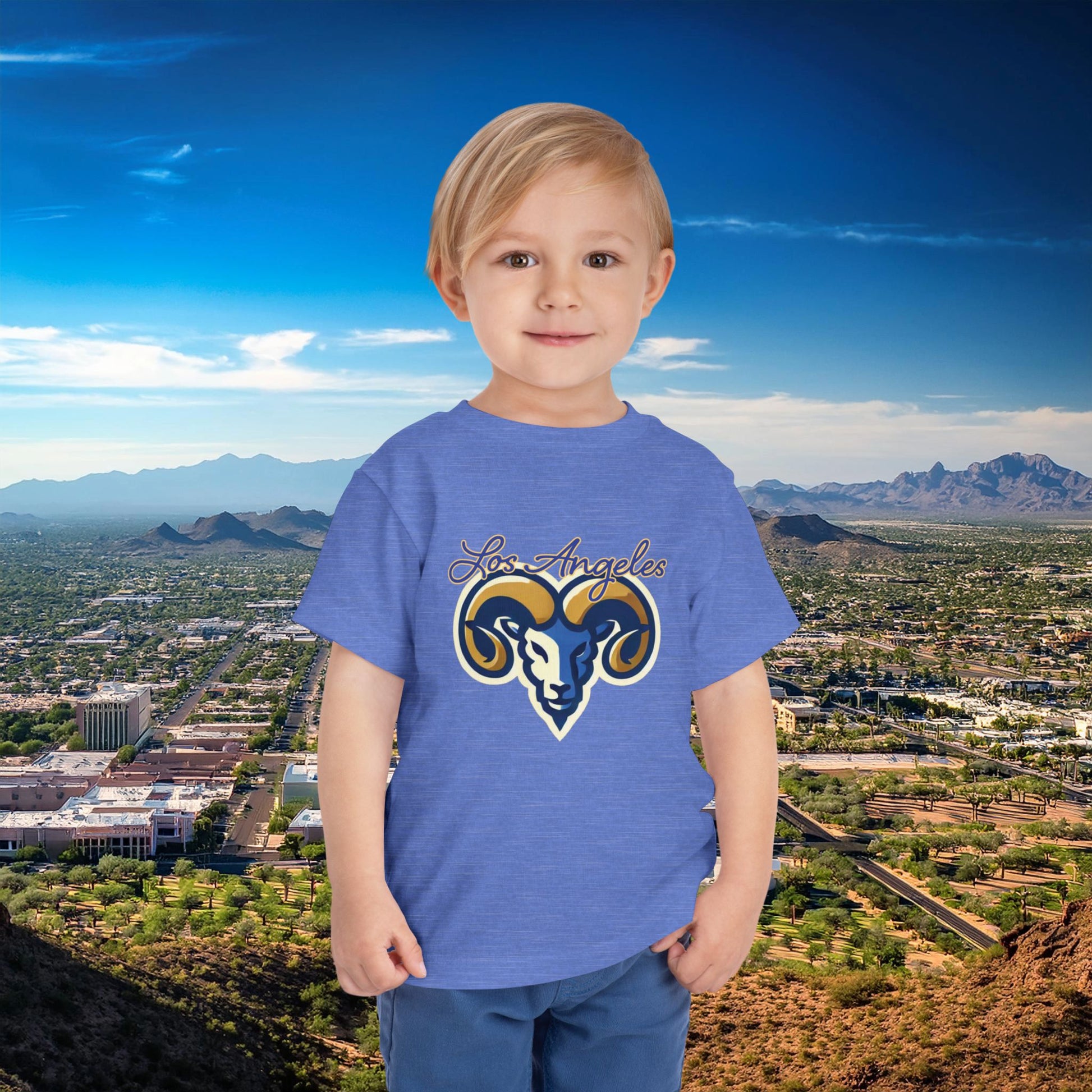 A soft, lightweight tee made for little explorers who cheer on their team or show city pride with playful style. The shirt’s simple silhouette keeps movement easy for running, climbing, and quiet cuddles. A bold ram logo with flowing “Los Angeles” lettering sits front-and-center, giving the tee an athletic, hometown vibe that pairs easily with shorts, jeans, or a cozy hoodie. Breathable fabric and a tear-away label keep sensory-sensitive toddlers comfortable all day — from playground afternoons to family outings around the neighborhood.