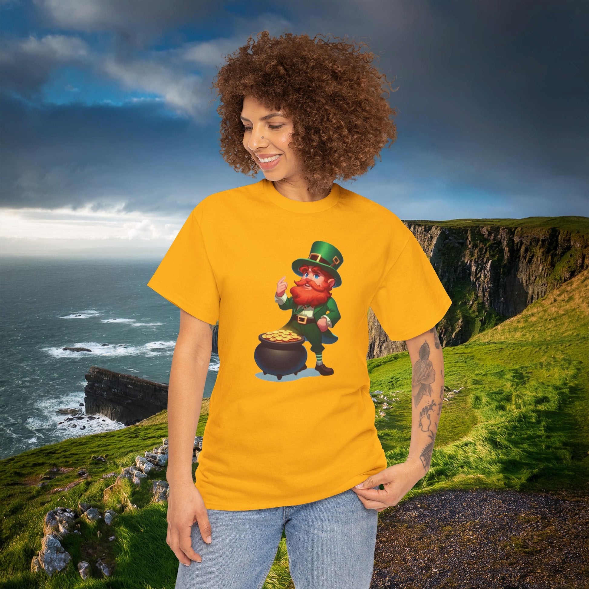 A soft, sturdy cotton tee with a cheerful leprechaun design that brings a little bit of luck and story to everyday wear. Lightweight but durable, the shirt feels familiar from the first wear and holds its shape wash after wash. The artwork sits centered on the chest, adding a playful focal point that pairs well with jeans, layered jackets, or a cozy knit. Wear it to small gatherings, informal holidays, or when you want a bright, whimsical touch to your day — the shirt blends comfort, responsible sourcing, and long-lasting print clarity into one easy piece.