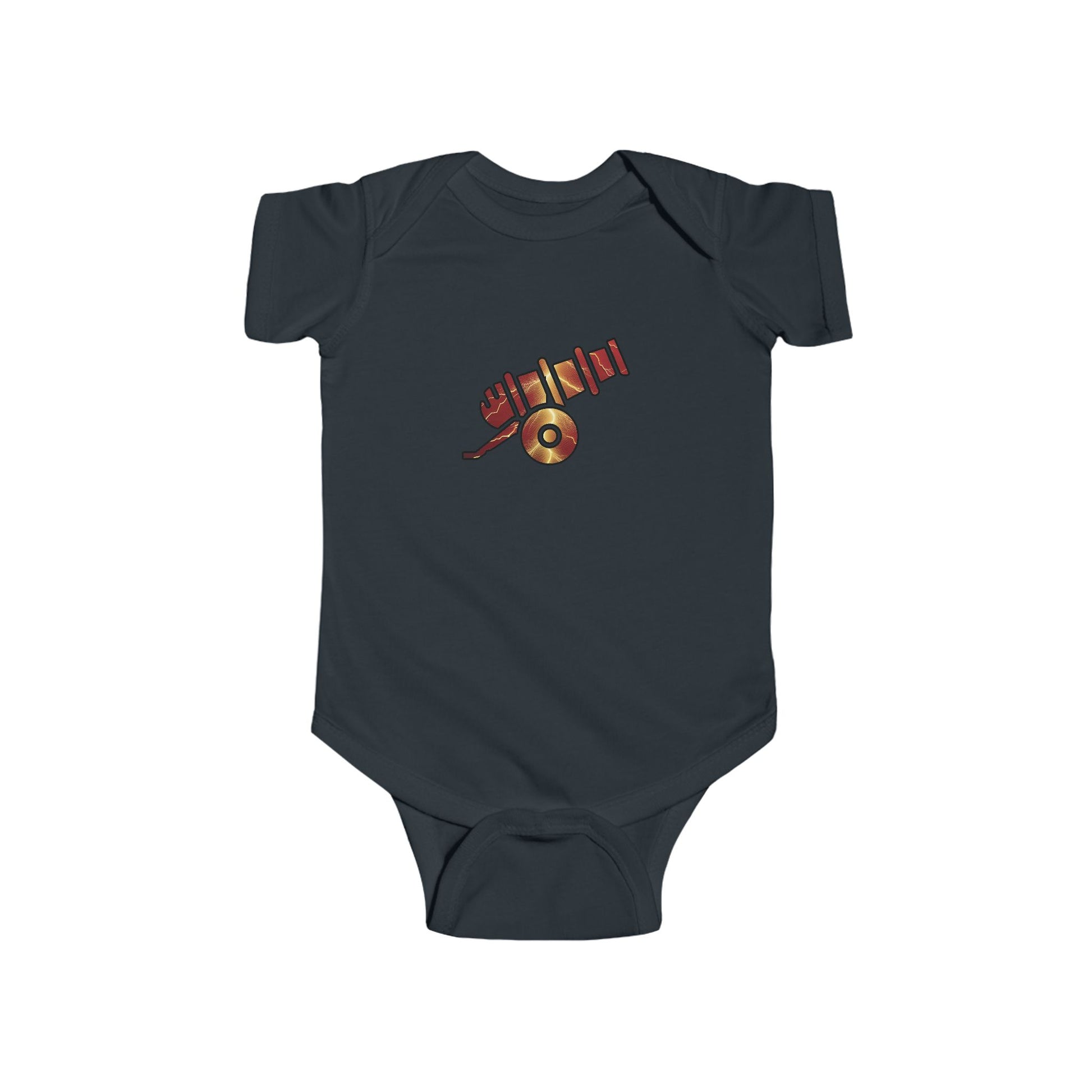 Baby clothing needs to be both durable and soft. With this Arsenal themed infant fine jersey bodysuit, youths get just that. The fabric is 100% cotton for solid colors. For heather colors, polyester is included. There are seams along the sides of this product. All bindings are made with ribbed knitting for improved durability. There are plastic snaps at the cross closure for easy changing access.