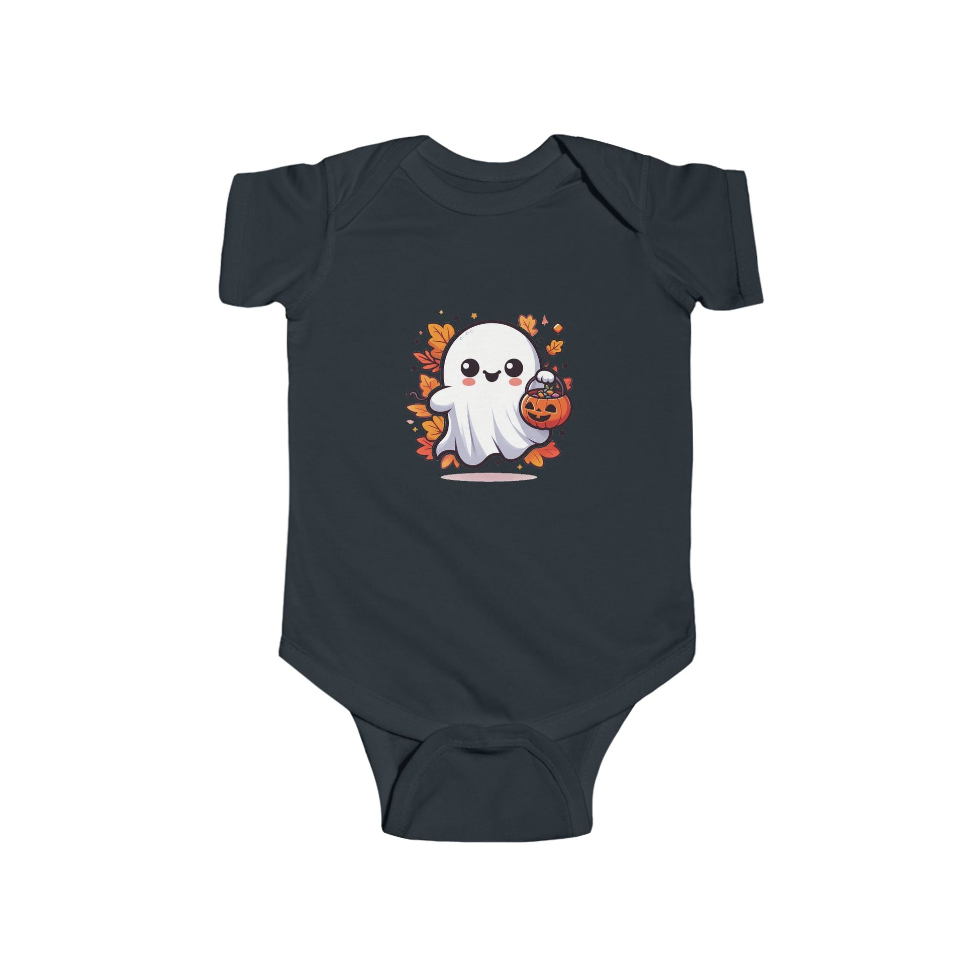 Baby clothing needs to be both durable and soft. With this Halloween themed infant fine jersey bodysuit, youths get just that. The fabric is 100% cotton for solid colors. For heather colors, polyester is included. There are seams along the sides of this product. All bindings are made with ribbed knitting for improved durability. There are plastic snaps at the cross closure for easy changing access.