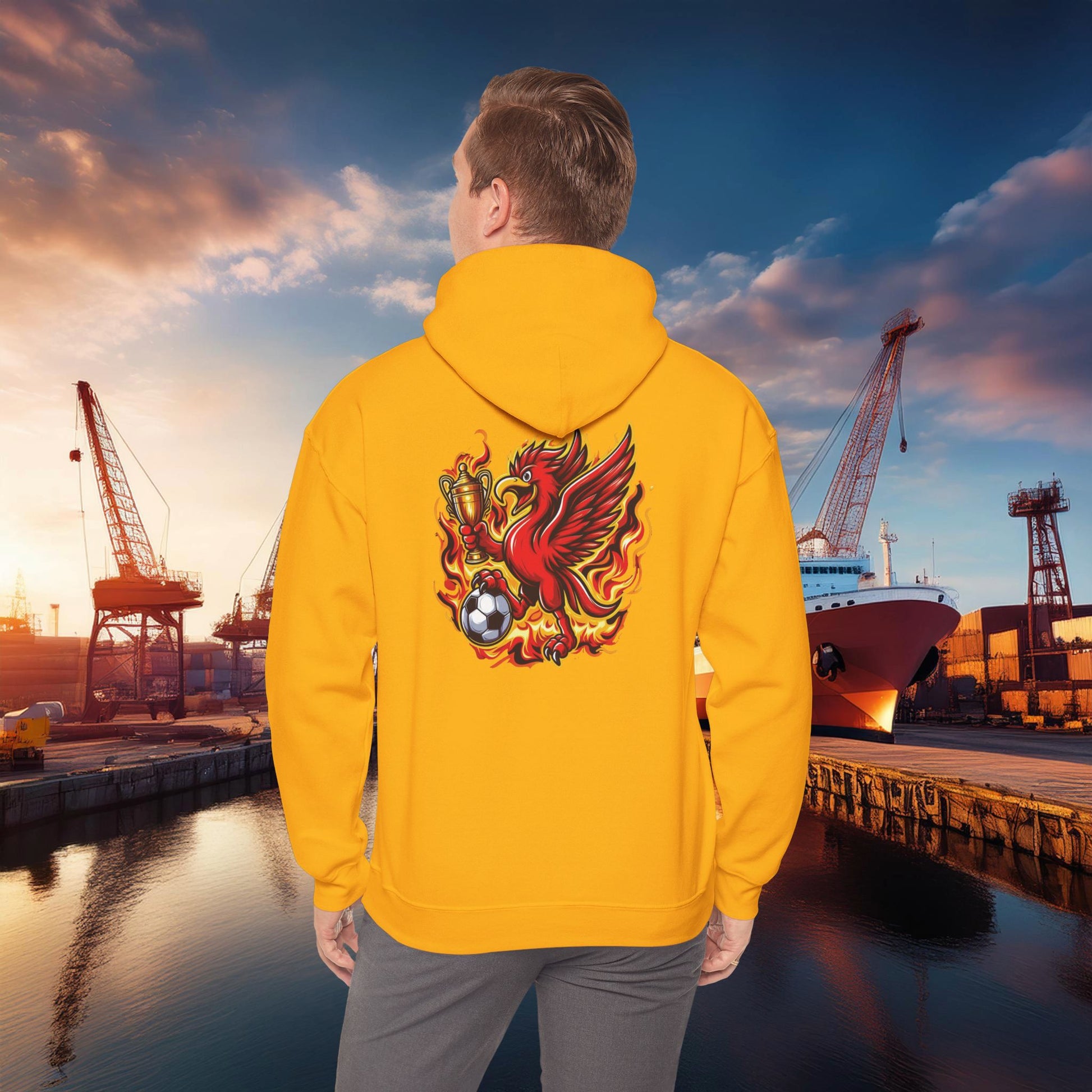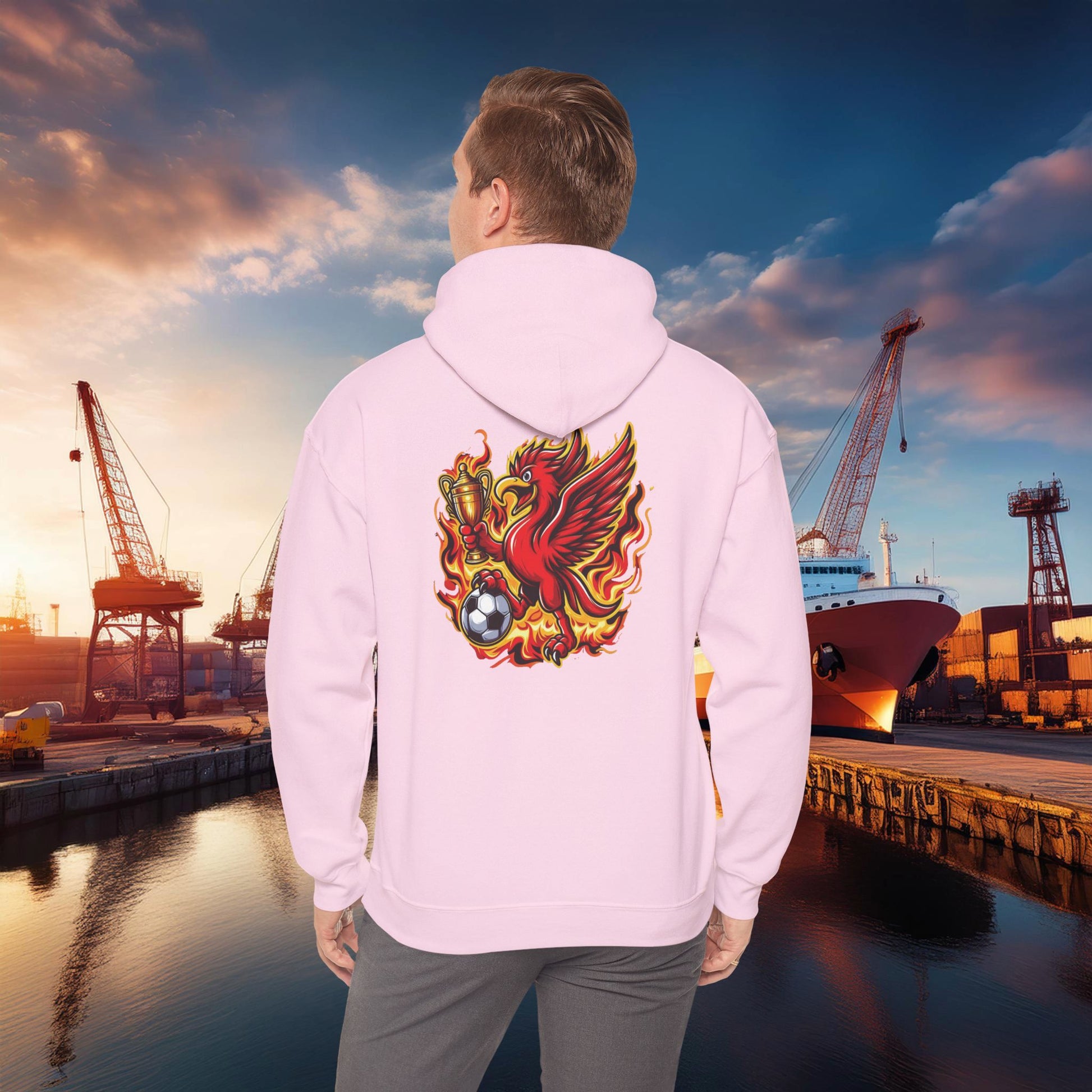This Liverpool themed heavy blend hooded sweatshirt is relaxation itself. Made with a thick blend of cotton and polyester, it feels plush, soft and warm, a perfect choice for any cold day. In the front, the spacious kangaroo pocket adds daily practicality while the hood's drawstring is the same color as the base sweater for extra style points.