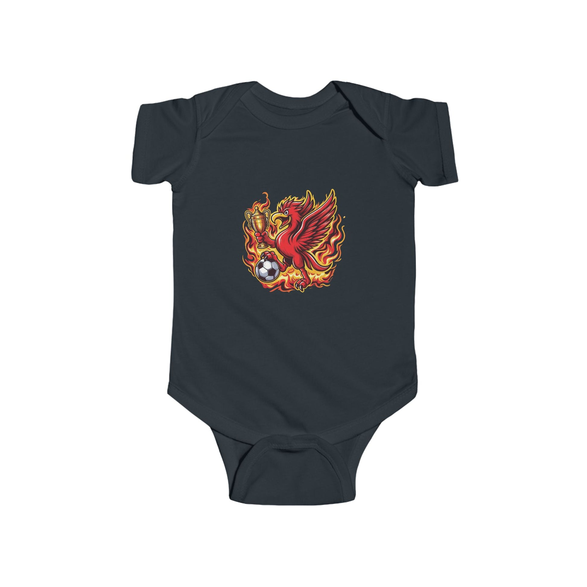 Baby clothing needs to be both durable and soft. With this Liverpool themed infant fine jersey bodysuit, youths get just that. The fabric is 100% cotton for solid colors. For heather colors, polyester is included. There are seams along the sides of this product. All bindings are made with ribbed knitting for improved durability. There are plastic snaps at the cross closure for easy changing access.