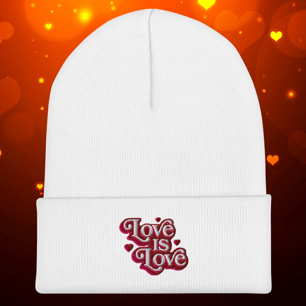 Crafted from soft, durable knit fabric, it offers a comfortable stretch and a snug fit that keeps you warm without feeling bulky. The classic cuffed silhouette makes it easy to style with anything from cozy sweaters to street-ready layers, while the bold yet minimal “Love is Love” detail adds purpose to every outfit.
