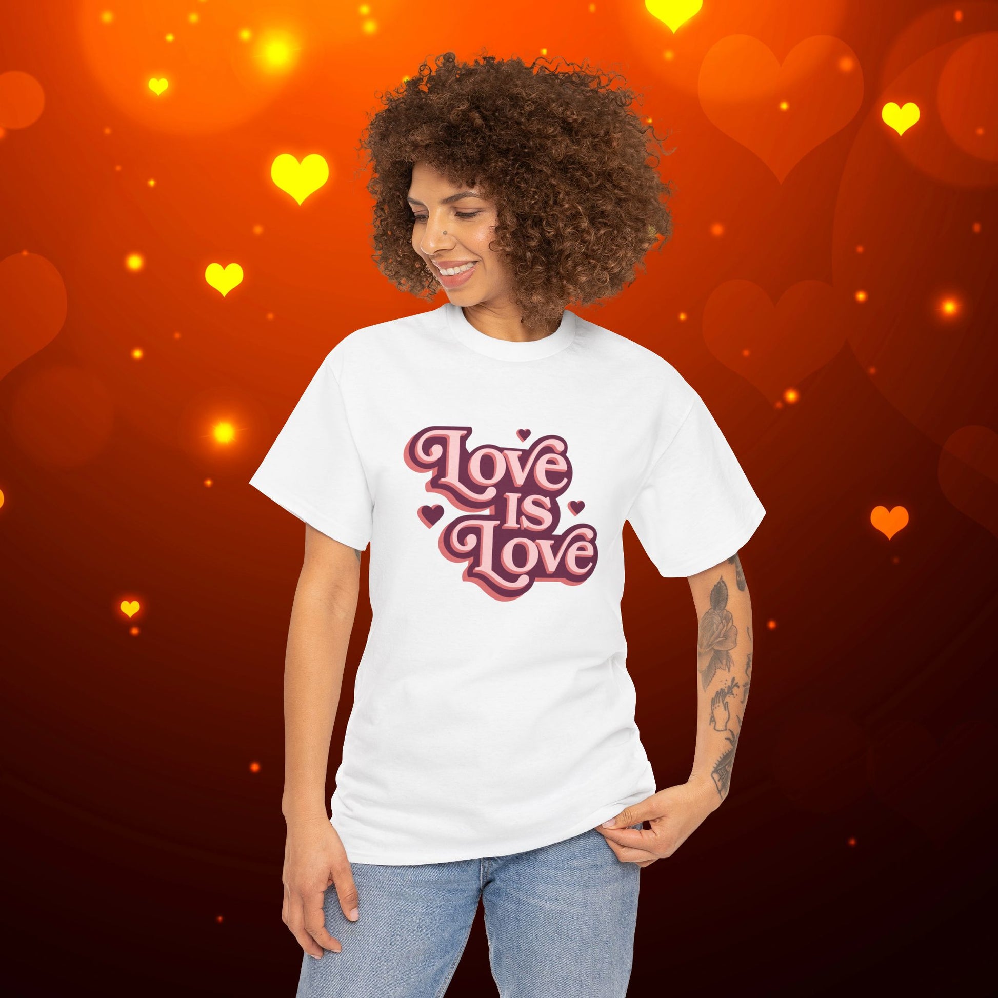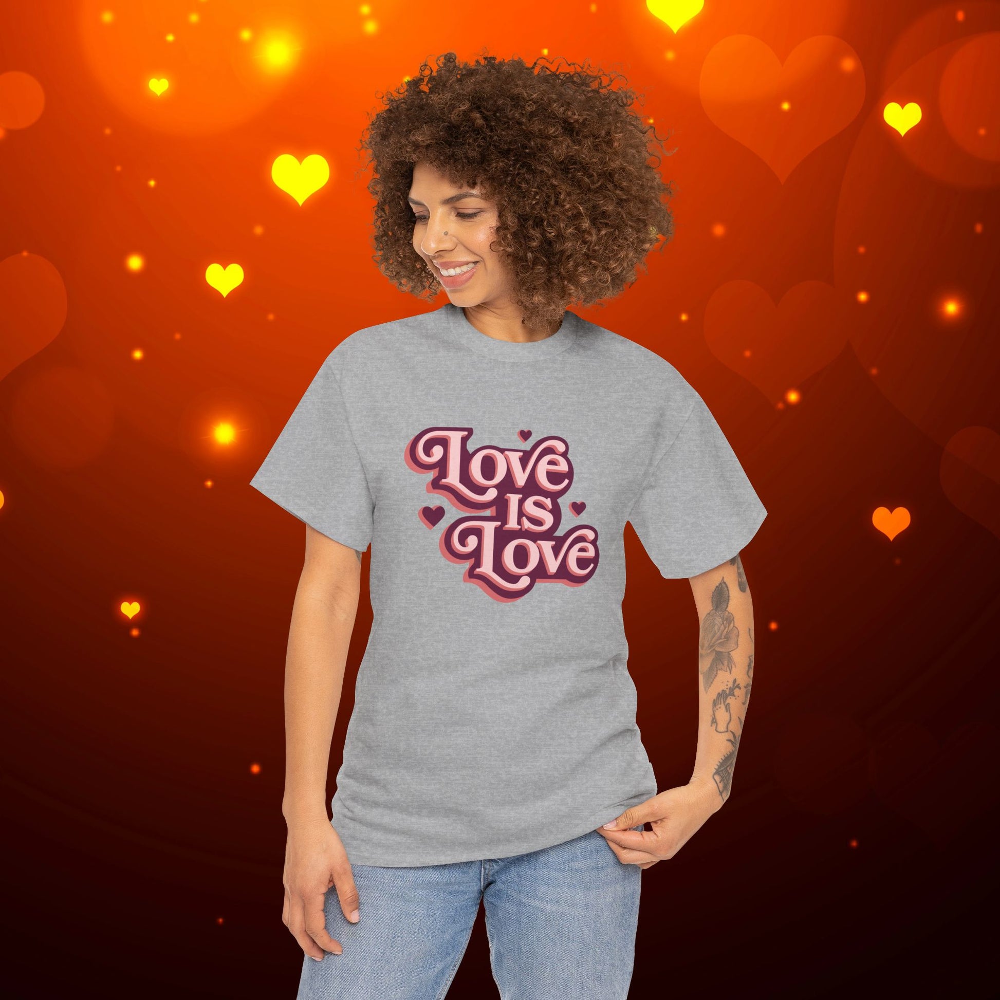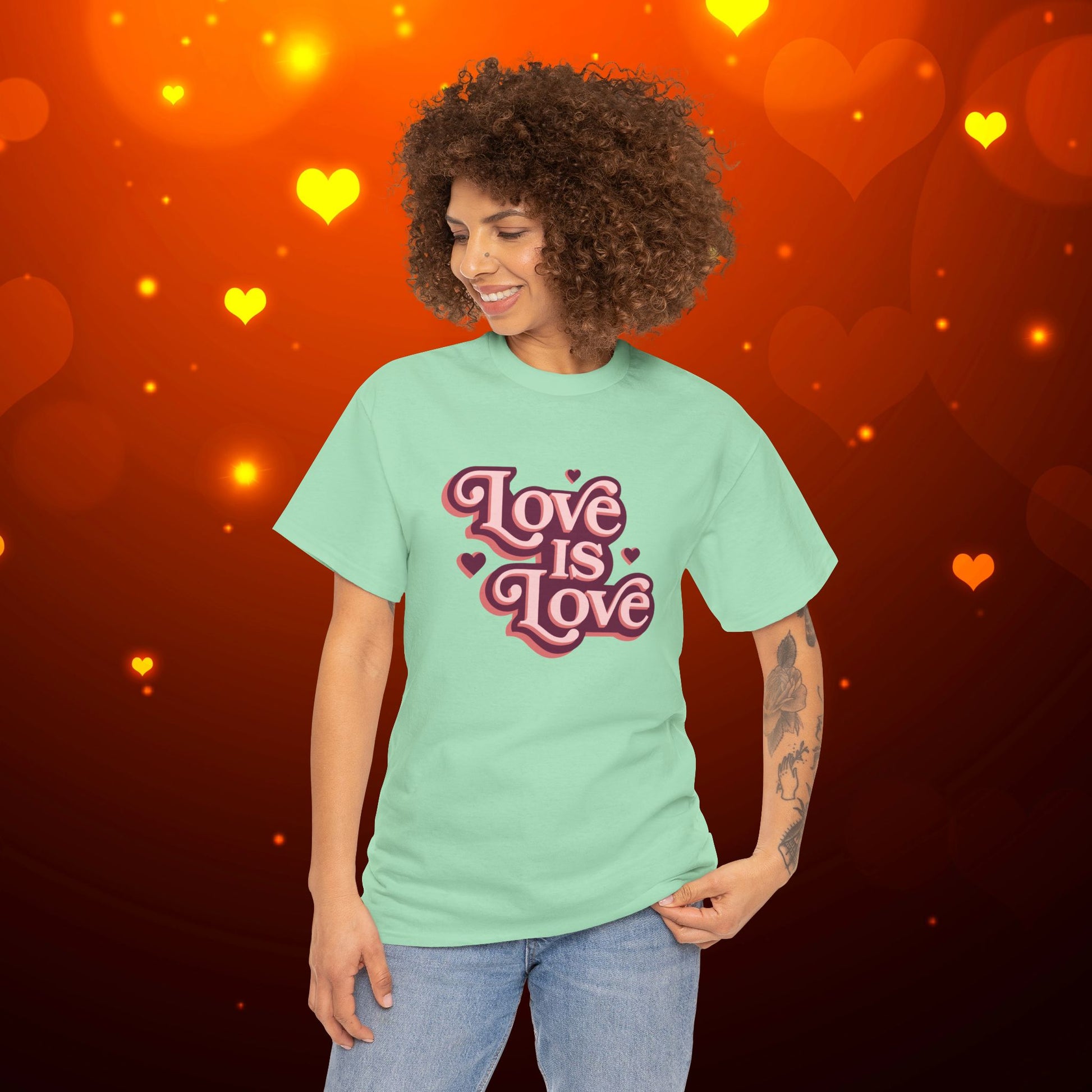 Soft, comfortable, and quietly bold — this tee carries a warm, retro-hearted message right on the chest. The rounded, groovy lettering and tiny hearts read “Love is Love” in a rosy, slightly faded palette that feels like a shared secret between friends. Wear it to morning coffee dates, weekend strolls, or low-key gatherings to signal kindness and solidarity without shouting. The classic crew shape and relaxed fit make it easy to layer or wear alone. It’s the kind of shirt that settles into everyday life and becomes a little reminder to be gentle and brave in equal measure.