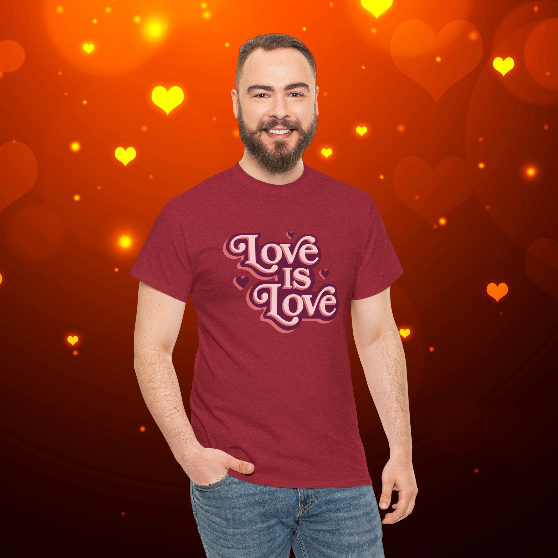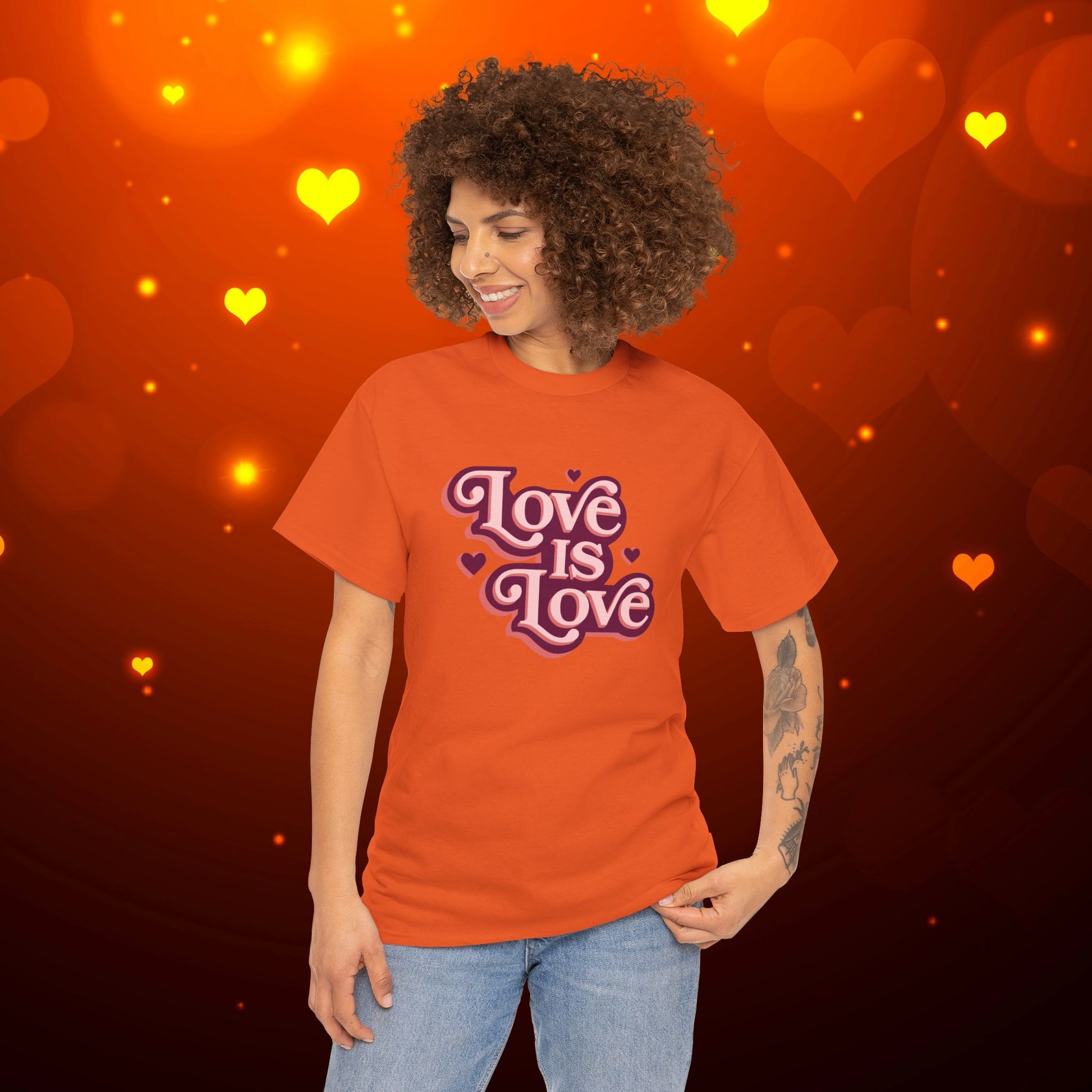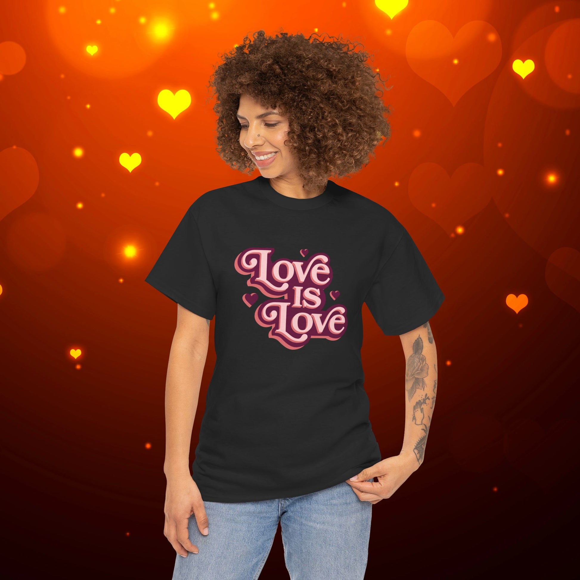 Soft, comfortable, and quietly bold — this tee carries a warm, retro-hearted message right on the chest. The rounded, groovy lettering and tiny hearts read “Love is Love” in a rosy, slightly faded palette that feels like a shared secret between friends. Wear it to morning coffee dates, weekend strolls, or low-key gatherings to signal kindness and solidarity without shouting. The classic crew shape and relaxed fit make it easy to layer or wear alone. It’s the kind of shirt that settles into everyday life and becomes a little reminder to be gentle and brave in equal measure.