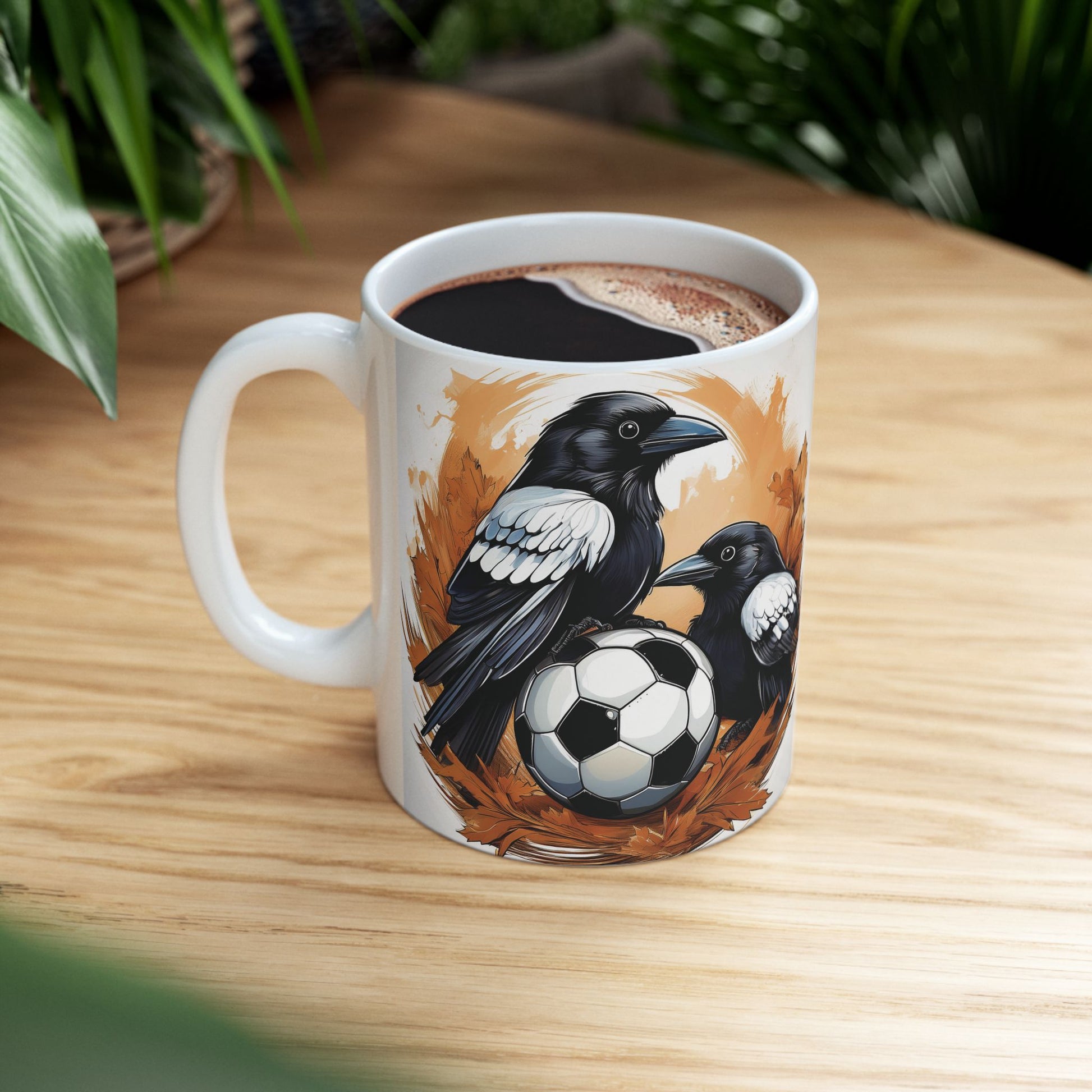 A glossy ceramic mug that brings a little story to every sip. Hand-printed with vivid inks, the design features sleek magpies perched beside a well-worn soccer ball and framed by warm autumn leaves. The artwork wraps around the mug so the scene reads whether you cradle it in your left or right hand. It feels like a quiet morning on the sidelines—cool air, the rustle of leaves, and the steady rhythm of a game you love. Lightweight enough for daily use, the glossy finish gives each color a lively pop while the comfortable C-handle keeps it easy to hold. Dishwasher and microwave safe, lead- and BPA-free, this mug is made to be used, admired, and carried through many practices, travel cups, and slow weekend mornings.