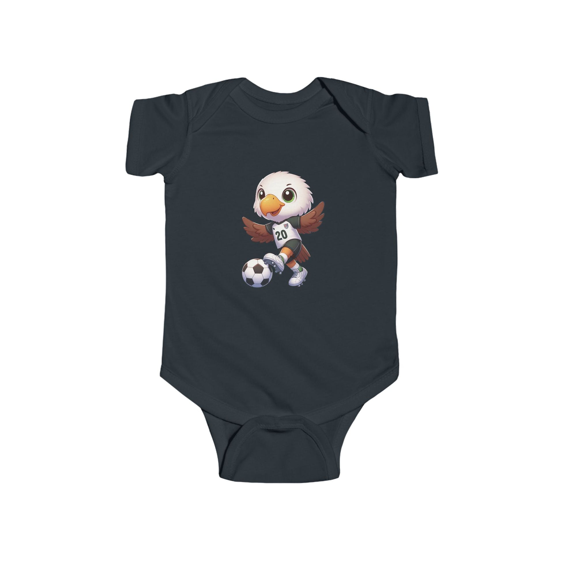 Baby clothing needs to be both durable and soft. With this US soccer themed infant fine jersey bodysuit, youths get just that. The fabric is 100% cotton for solid colors. For heather colors, polyester is included. There are seams along the sides of this product. All bindings are made with ribbed knitting for improved durability. There are plastic snaps at the cross closure for easy changing access.