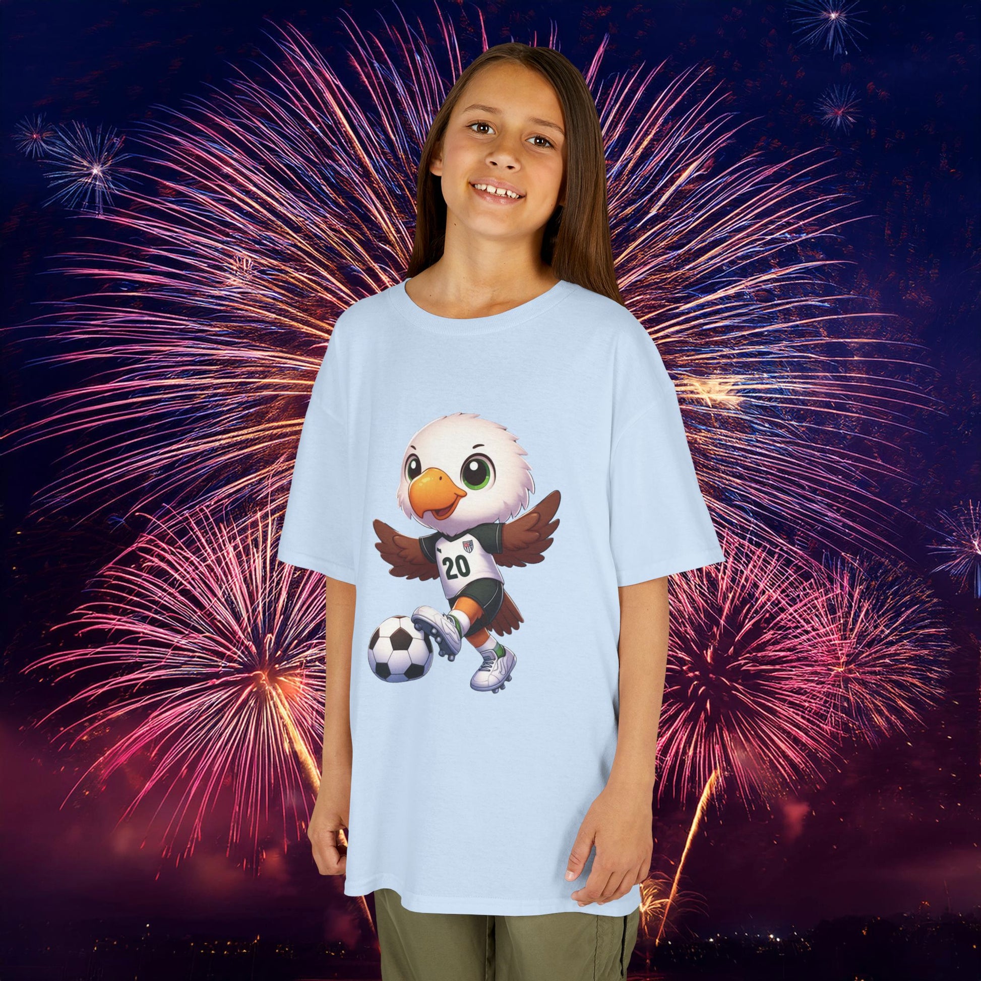 This USA soccer themed eagle heavy cotton tee is perfect for everyday use. The fabric is 100% cotton for solid colors. Polyester is included for heather-color variants. The shoulders have twill tape for improved durability. The collar is curl resistant due to ribbed knitting. There are no seams along the sides.