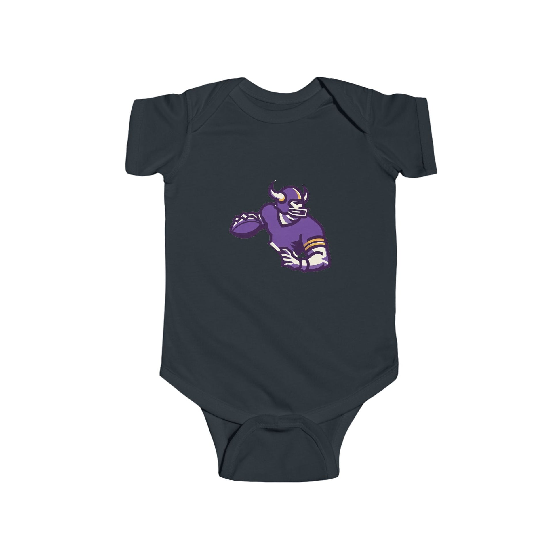 Baby clothing needs to be both durable and soft. With this Minnesota Vikings themed infant fine jersey bodysuit, youths get just that. The fabric is 100% cotton for solid colors. For heather colors, polyester is included. There are seams along the sides of this product. All bindings are made with ribbed knitting for improved durability. There are plastic snaps at the cross closure for easy changing access.