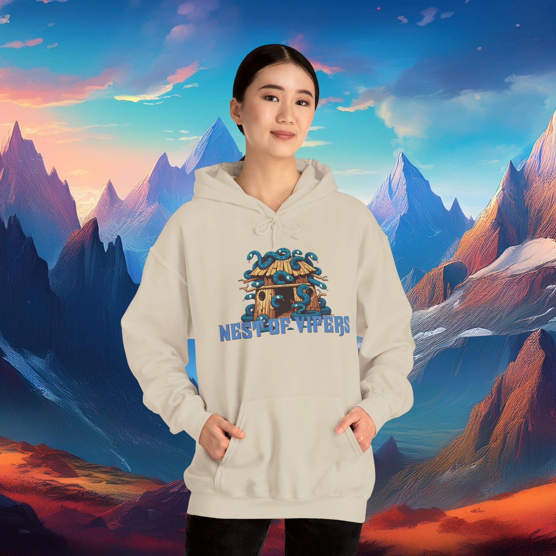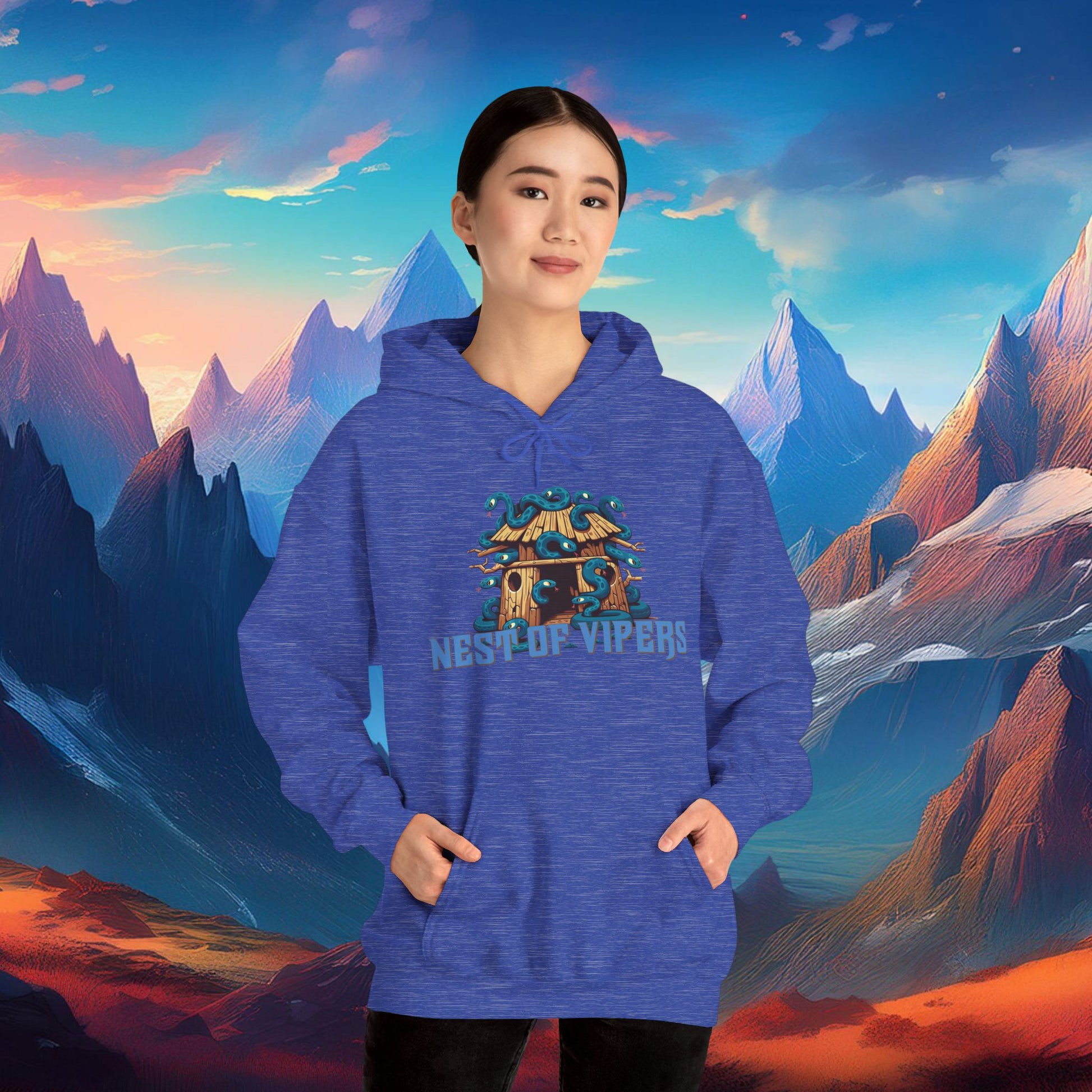 This Nest of Vipers heavy blend hooded sweatshirt is relaxation itself. Made with a thick blend of cotton and polyester, it feels plush, soft and warm, a perfect choice for any cold day. In the front, the spacious kangaroo pocket adds daily practicality while the hood's drawstring is the same color as the base sweater for extra style points.