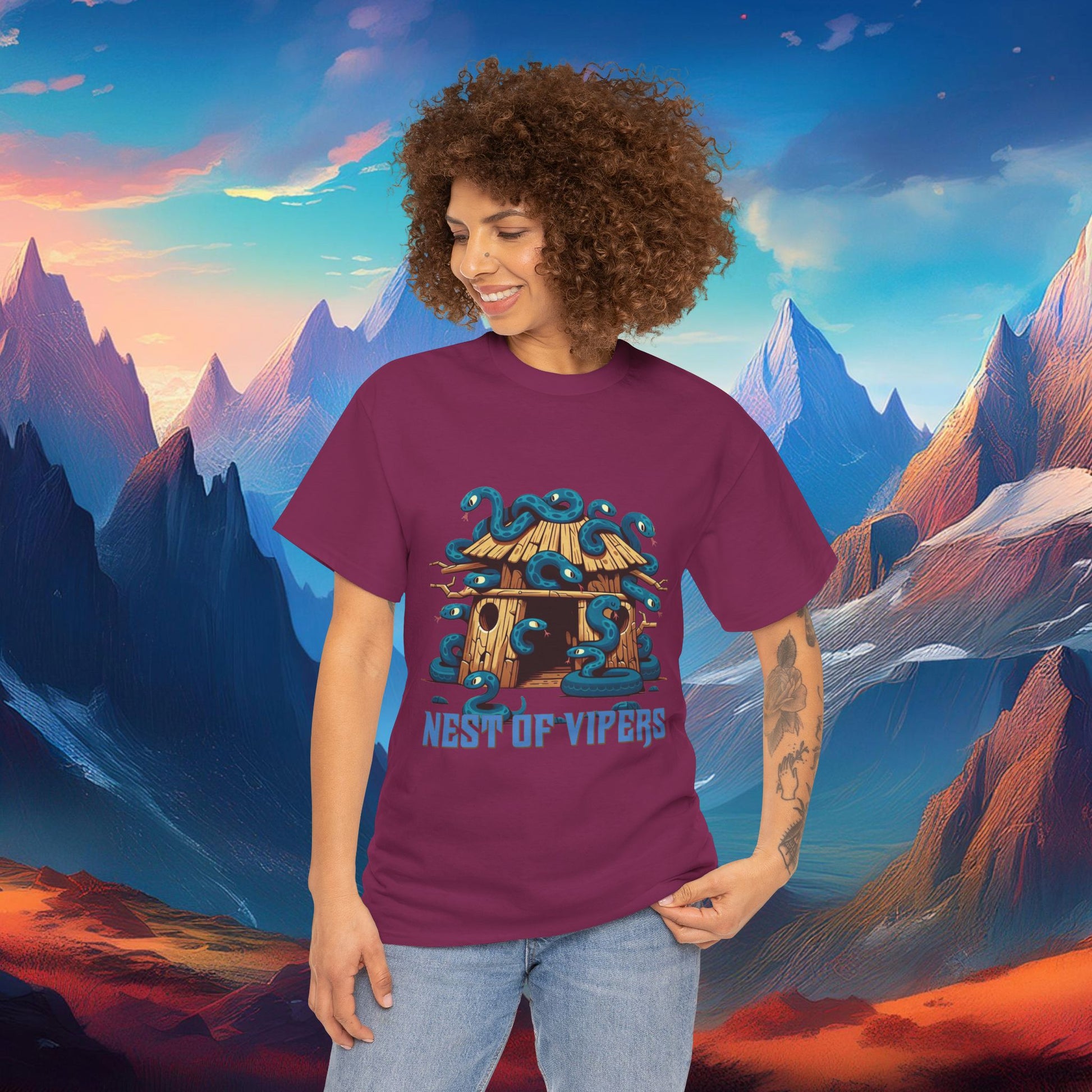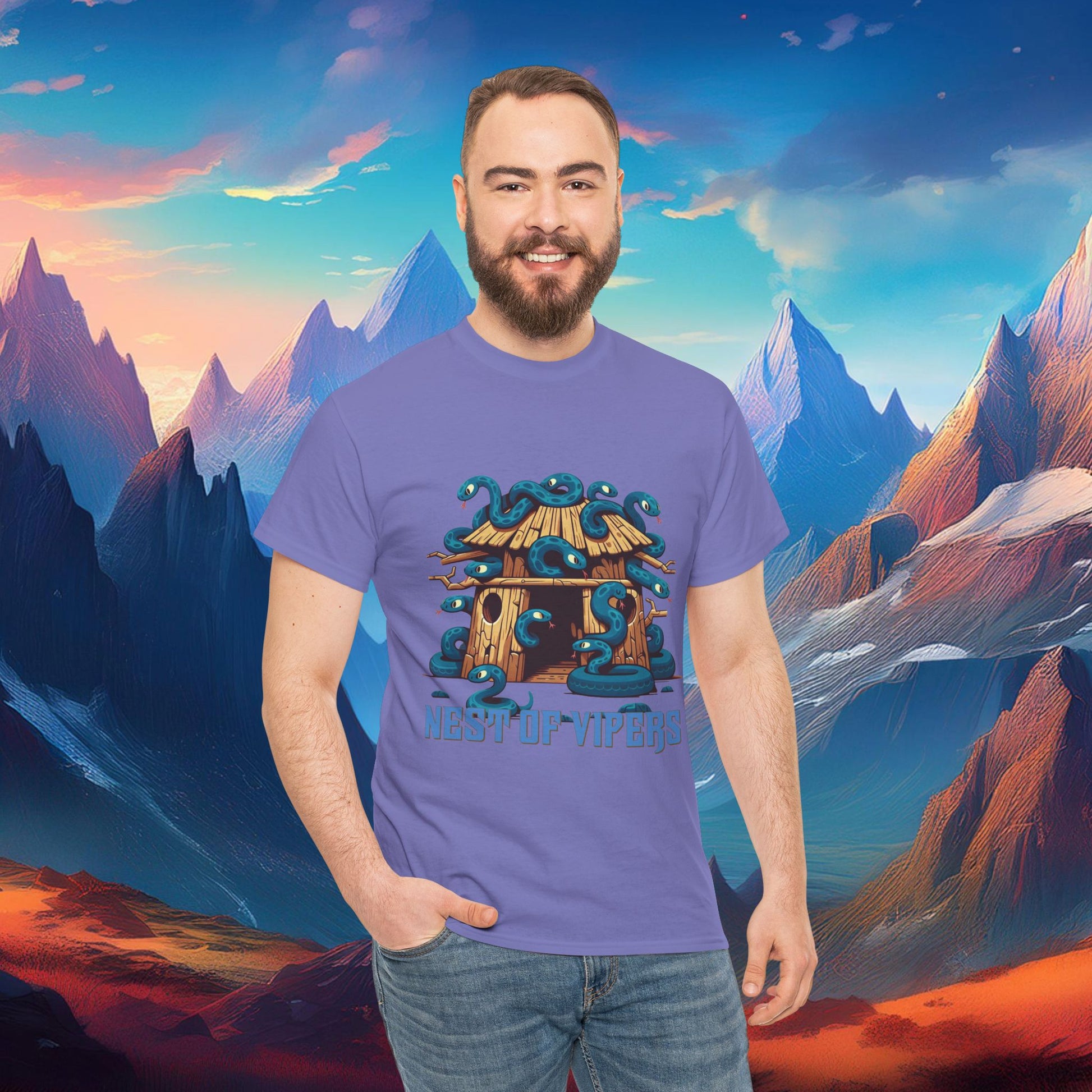 This Nest of Vipers heavy cotton tee is the basic staple of any wardrobe. It is the foundation upon which casual fashion grows. The specially spun fibers provide a smooth surface for premium printing vividity and sharpness. No side seams mean there are no itchy interruptions under the arms. The shoulders have tape for improved durability.