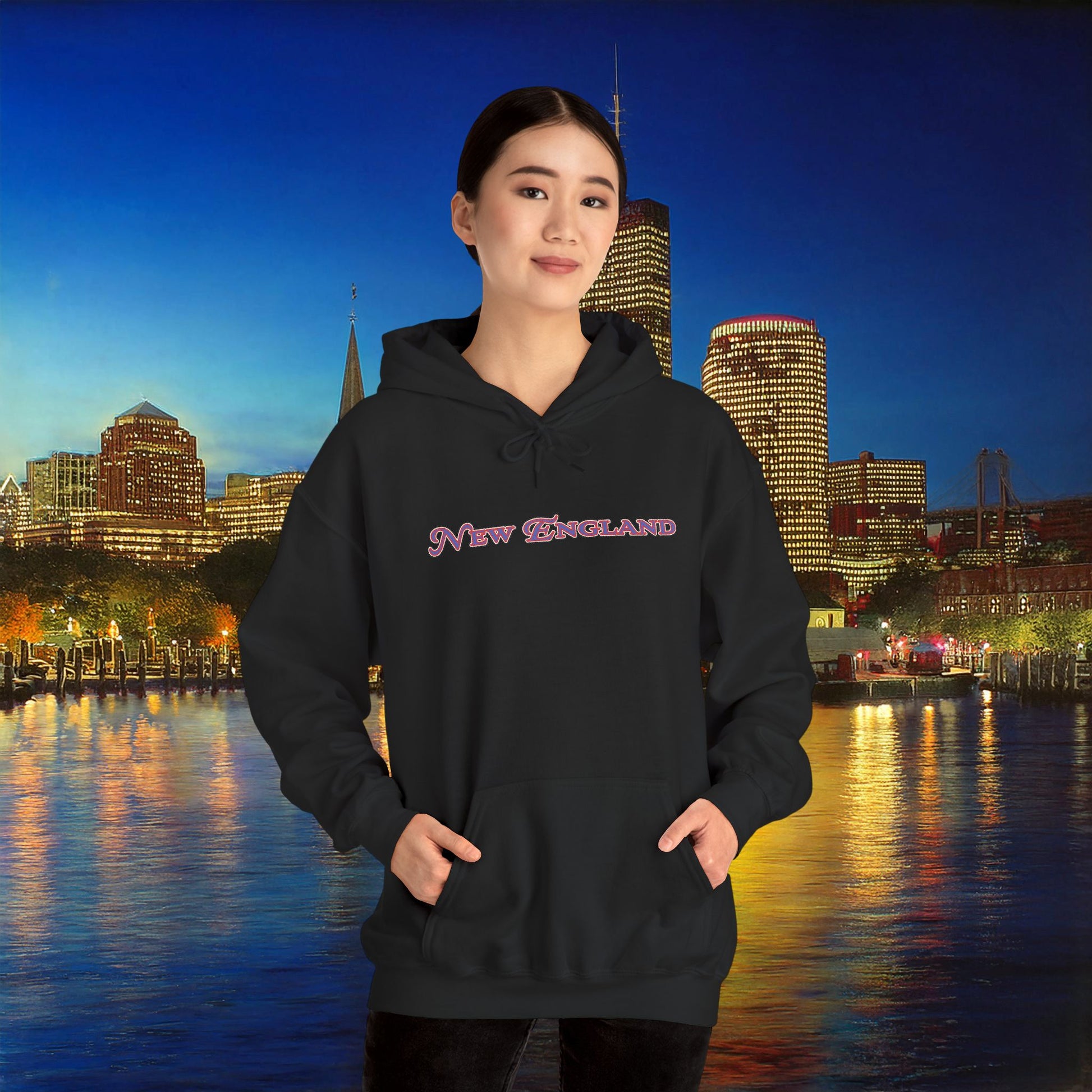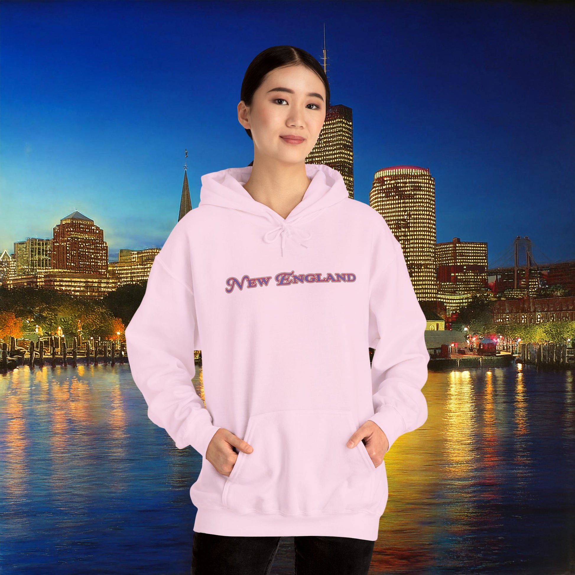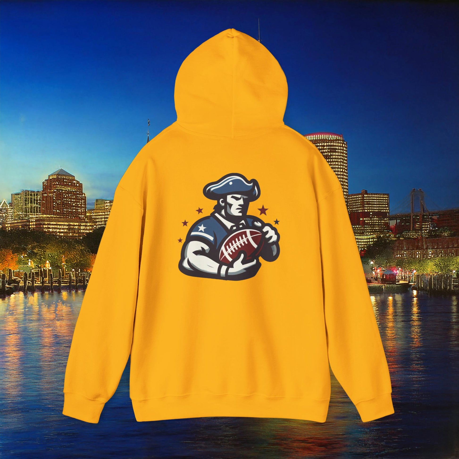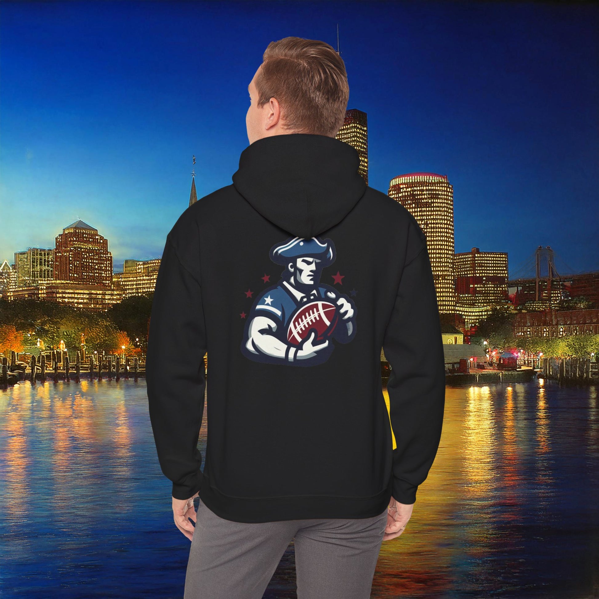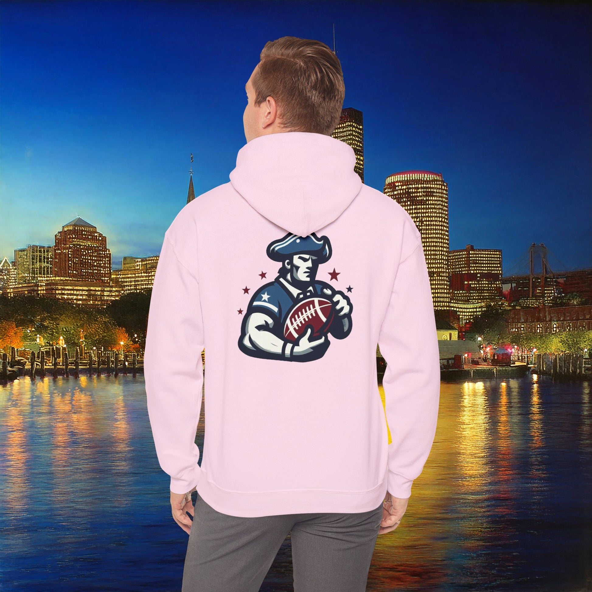 Soft, roomy, and built for chilly game days — this classic hoodie carries a vintage New England spirit. The front shows a subtle, old-school “New England” script that sits low and confident, while the back features a bold, retro patriot holding a football surrounded by stars. Wear it layered over a tee on crisp mornings or throw it on after practice; the pouch pocket and double-lined hood keep hands warm and heat locked in. The look reads like hometown pride: a little rugged, a little nostalgic, and ready for tailgates, stadium walks, or weekend hangs at the local diner.