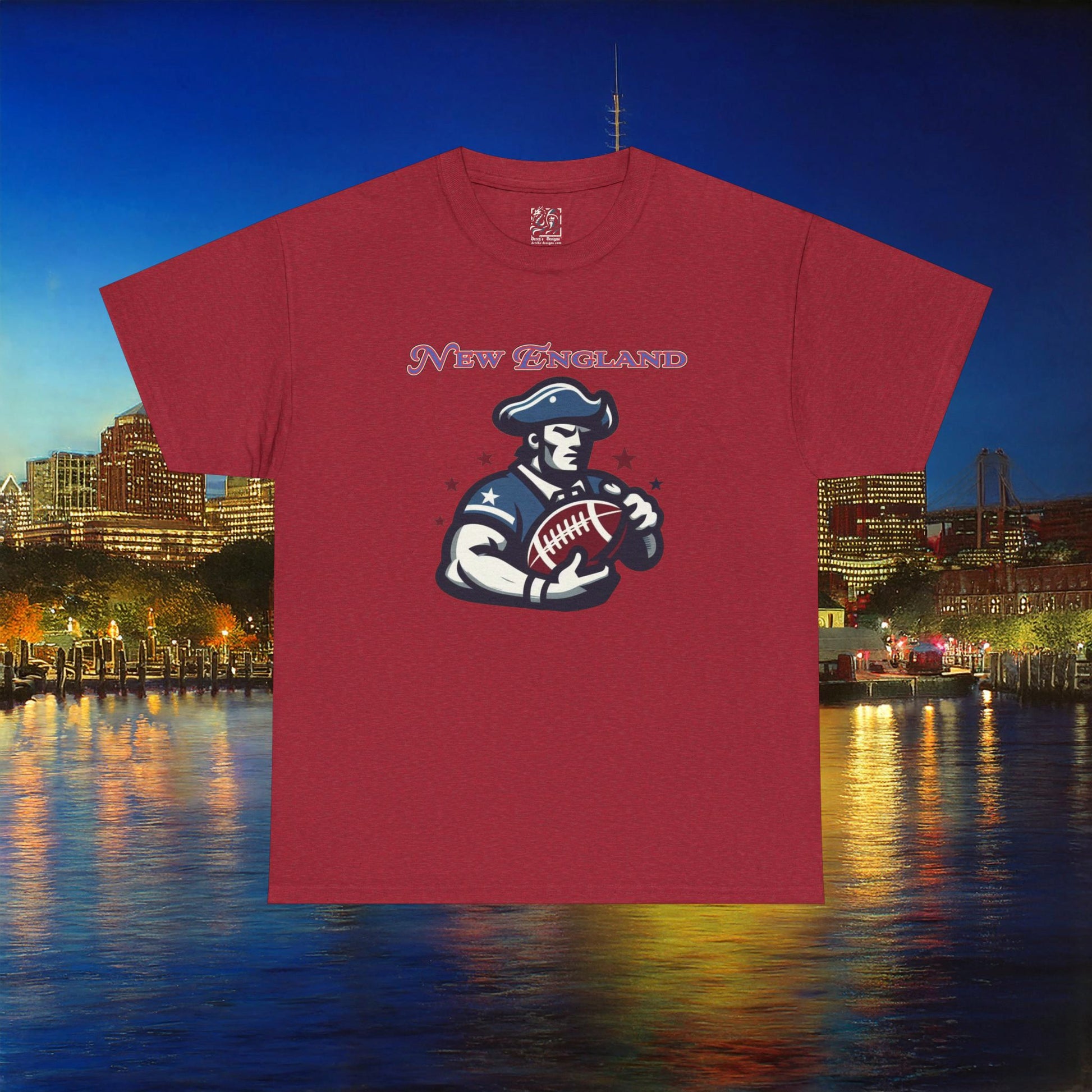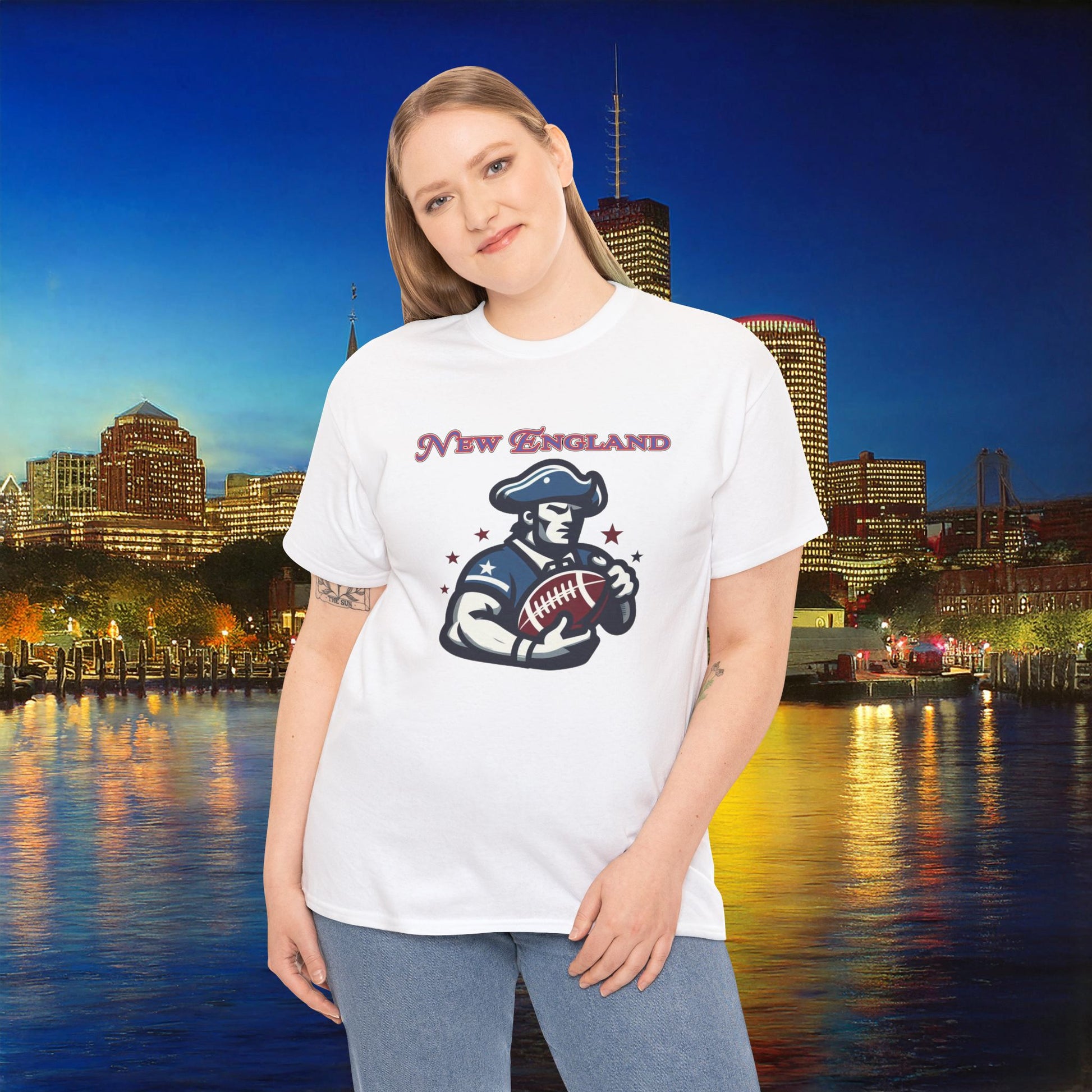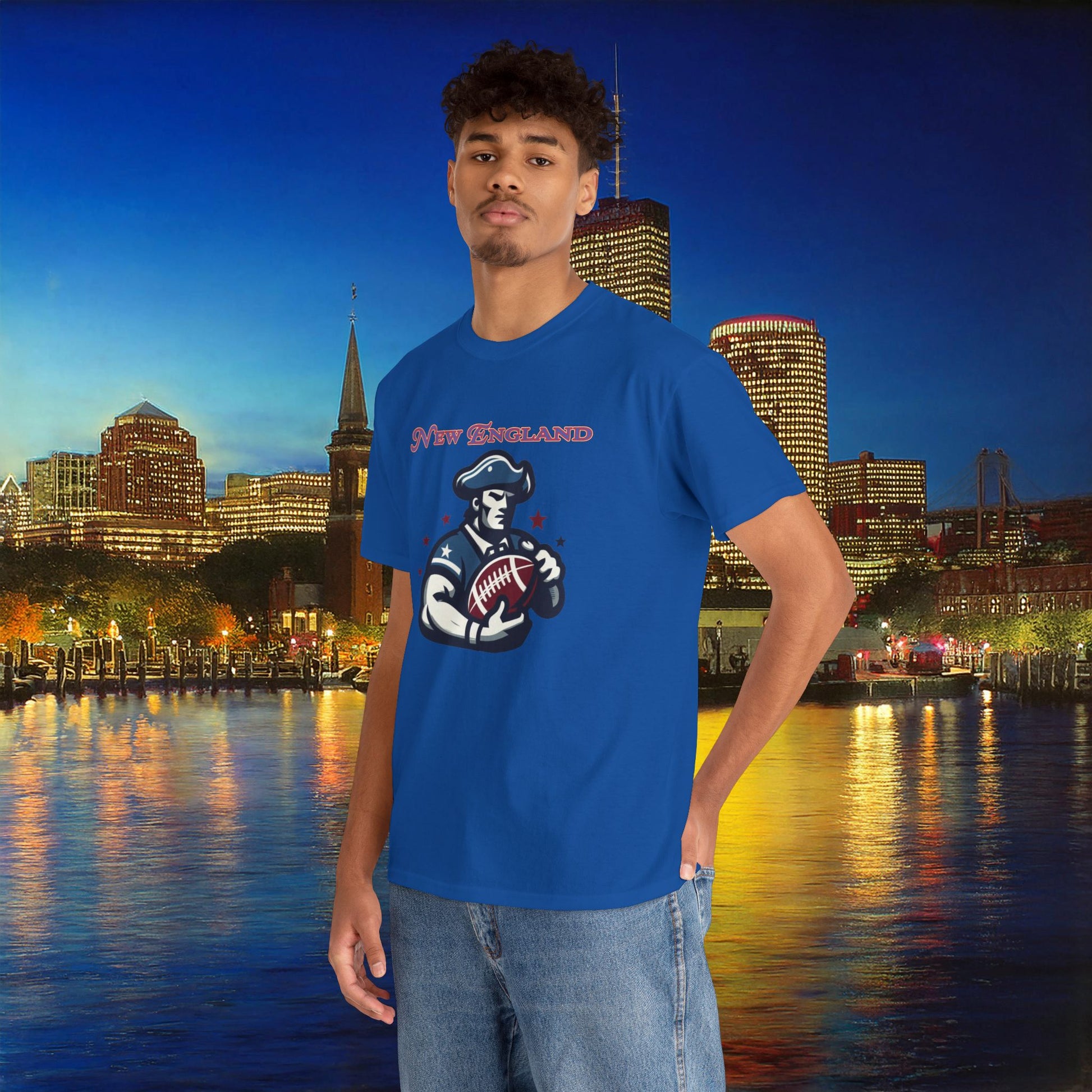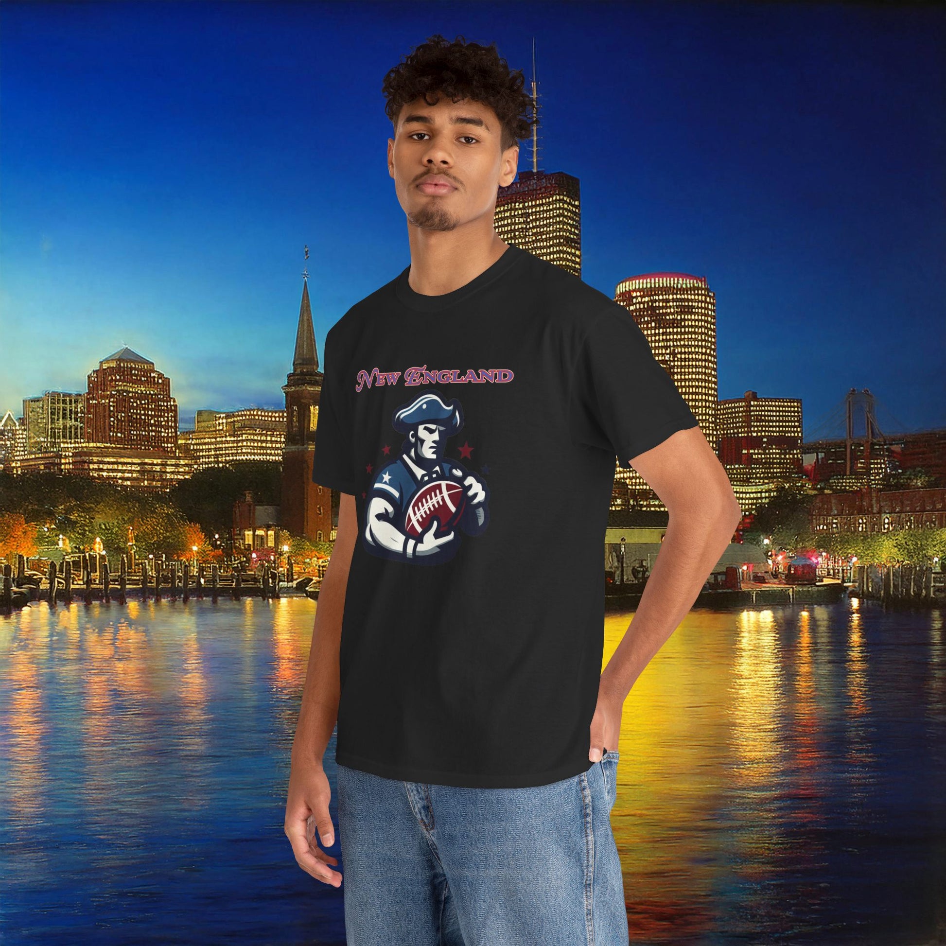 A comfortable, durable tee that carries hometown pride without shouting. Soft, medium-weight cotton sits close to the body with a classic crew neckline. The front features a vintage-inspired footballer graphic and ’New England’ lettering in worn, patriotic tones — subtle, wearable, and made to age well. Wear it to watch the game at a local bar, on a brisk fall walk, or layered under a jacket for weekend errands. The design feels like a shared Friday-night ritual: friends, takeout, and the low hum of the crowd. Thoughtful details — tear-away label, ribbed collar, and shoulder tape — keep the shirt feeling neat after repeated wears. Ethically sourced cotton and reliable printing make this a dependable piece in a casual rotation.