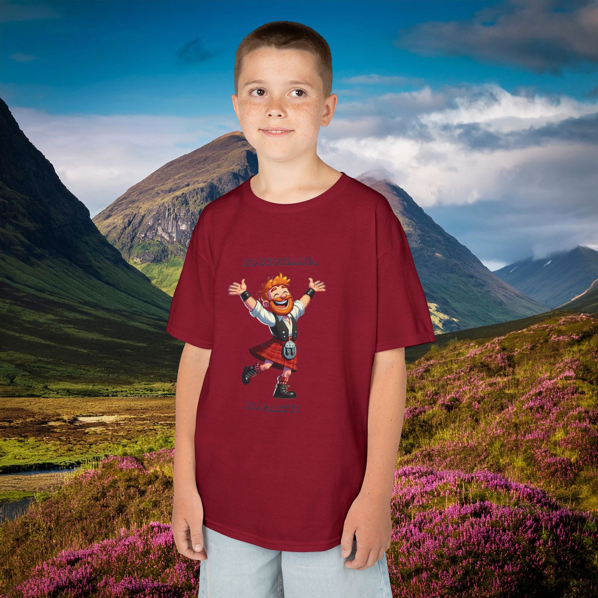 This No Scotland, No Party kids heavy cotton tee is perfect for everyday use. The fabric is 100% cotton for solid colors. Polyester is included for heather-color variants. The shoulders have twill tape for improved durability. The collar is curl resistant due to ribbed knitting. There are no seams along the sides.