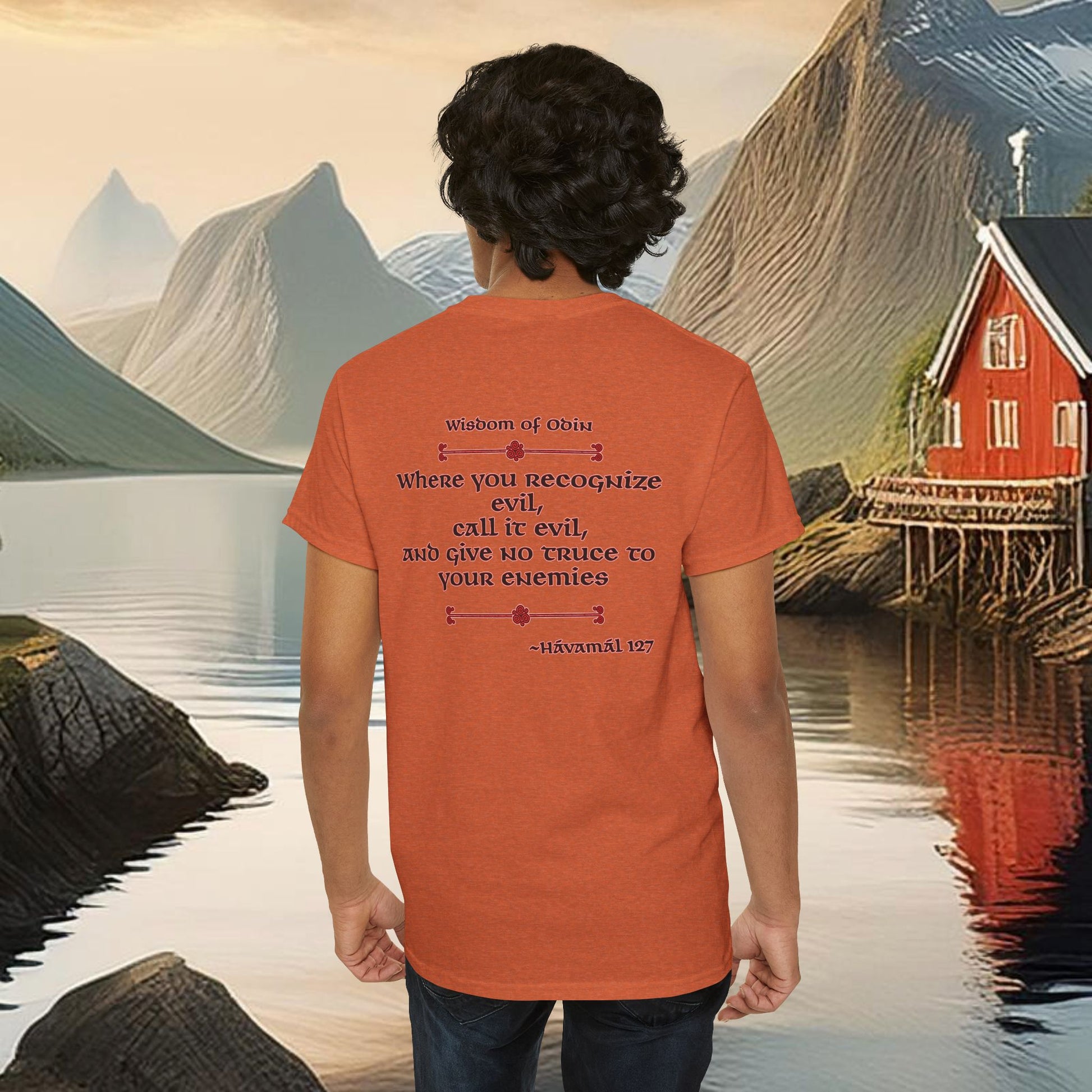 On the back, the design draws from the Wisdom of Odin, quoting Hávamál 127, a timeless reminder that choosing silence in the face of wrongdoing carries its own weight. Together, the graphics blend Norse symbolism with moral clarity, uniting ancient wisdom and modern resistance.