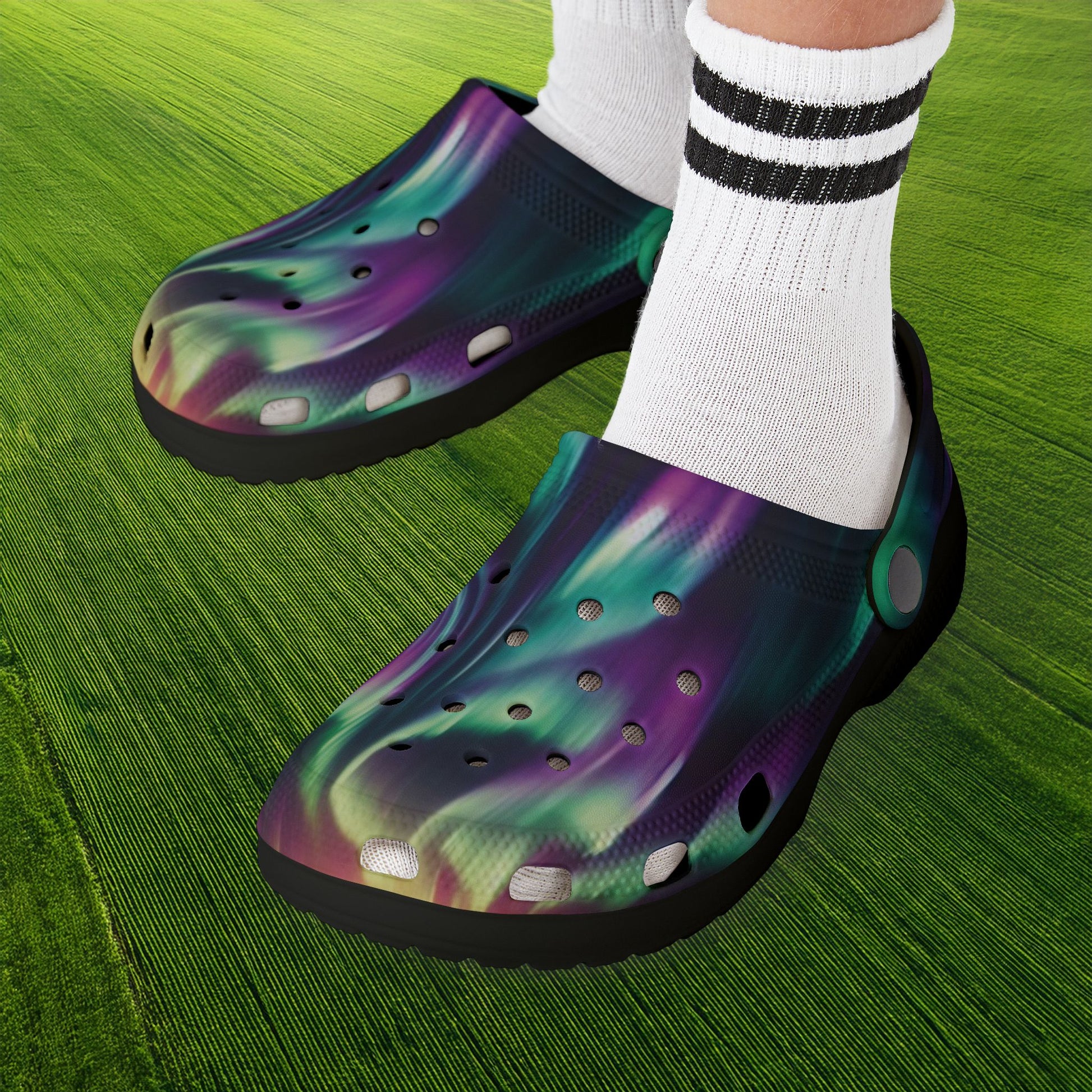 Introduce your child to comfortable and fun footwear with these vibrant northern lights Kid's EVA Foam Clogs. Designed for all-day wear, these clogs offer a unique blend of style and practicality. The artistic exterior and playful clog accessory charms transform each step into a fantastic adventure. Perfect for summer days, backyard playdates, or beach outings, these clogs are an essential addition to any child's wardrobe. Ideal for kids who love to express their individuality, they make great gifts for birthdays, holidays, or any special occasion. Lightweight and flexible, they effortlessly accommodate active play and exploration.