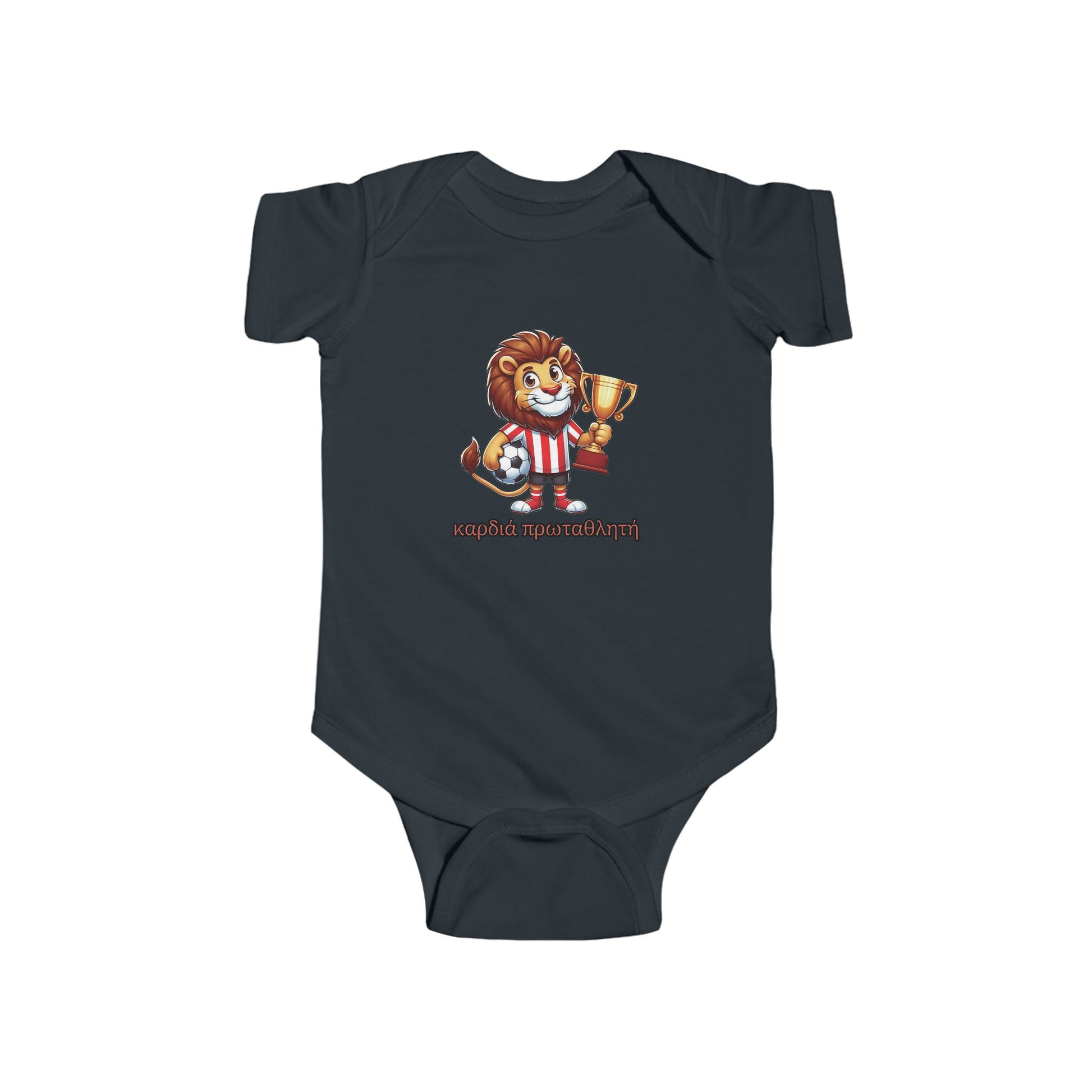 Baby clothing needs to be both durable and soft. With this Olympiacos themed infant fine jersey bodysuit, youths get just that. The fabric is 100% cotton for solid colors. For heather colors, polyester is included. There are seams along the sides of this product. All bindings are made with ribbed knitting for improved durability. There are plastic snaps at the cross closure for easy changing access.