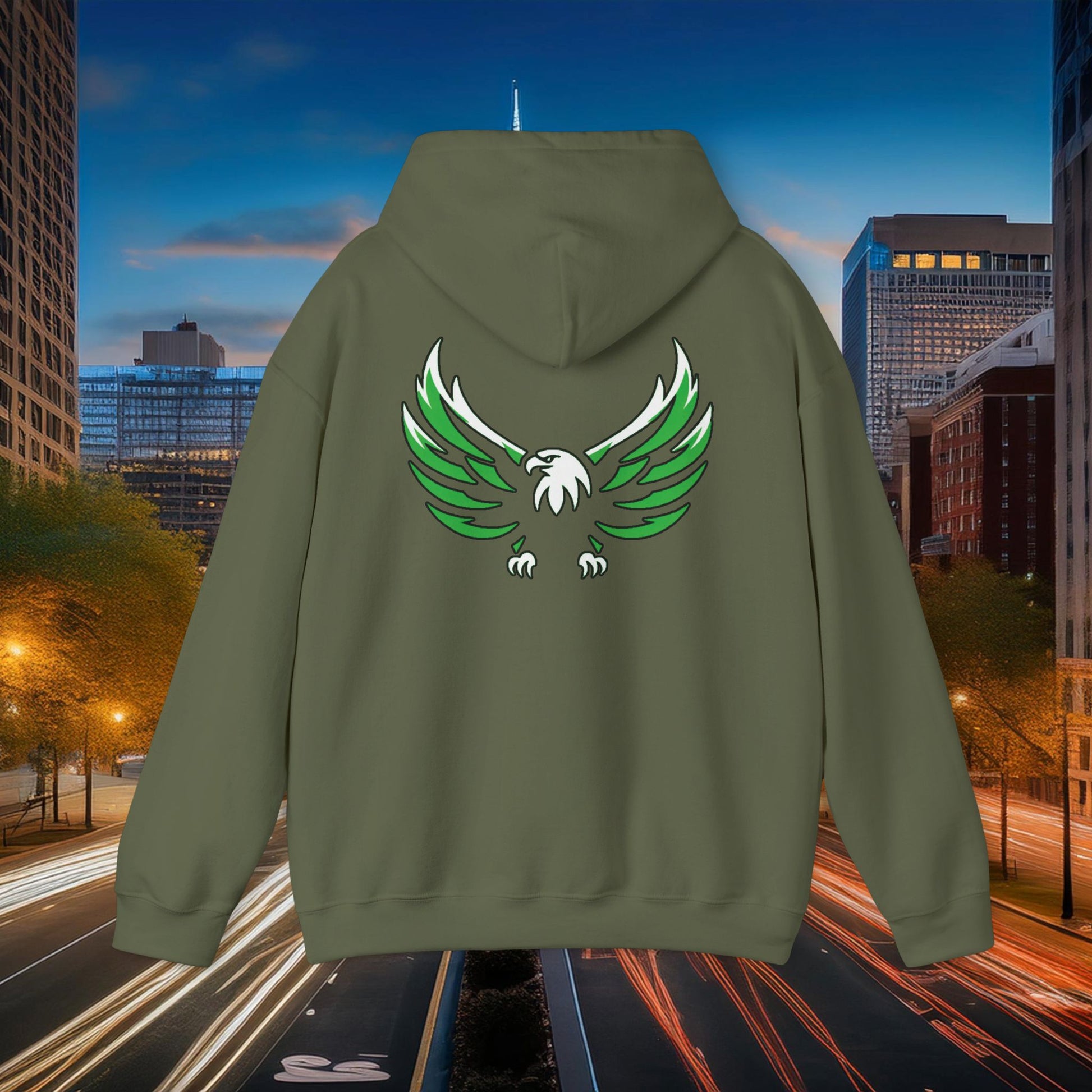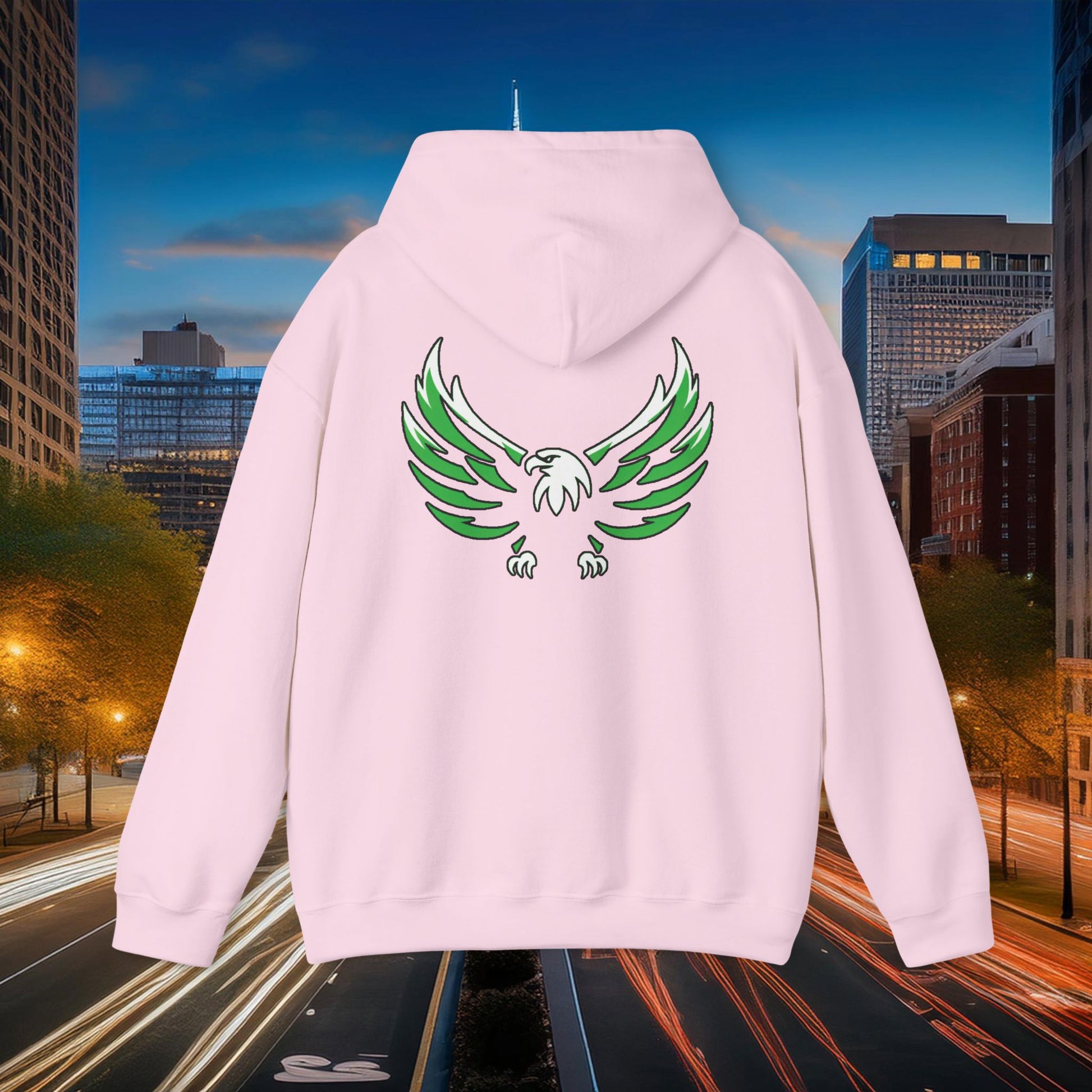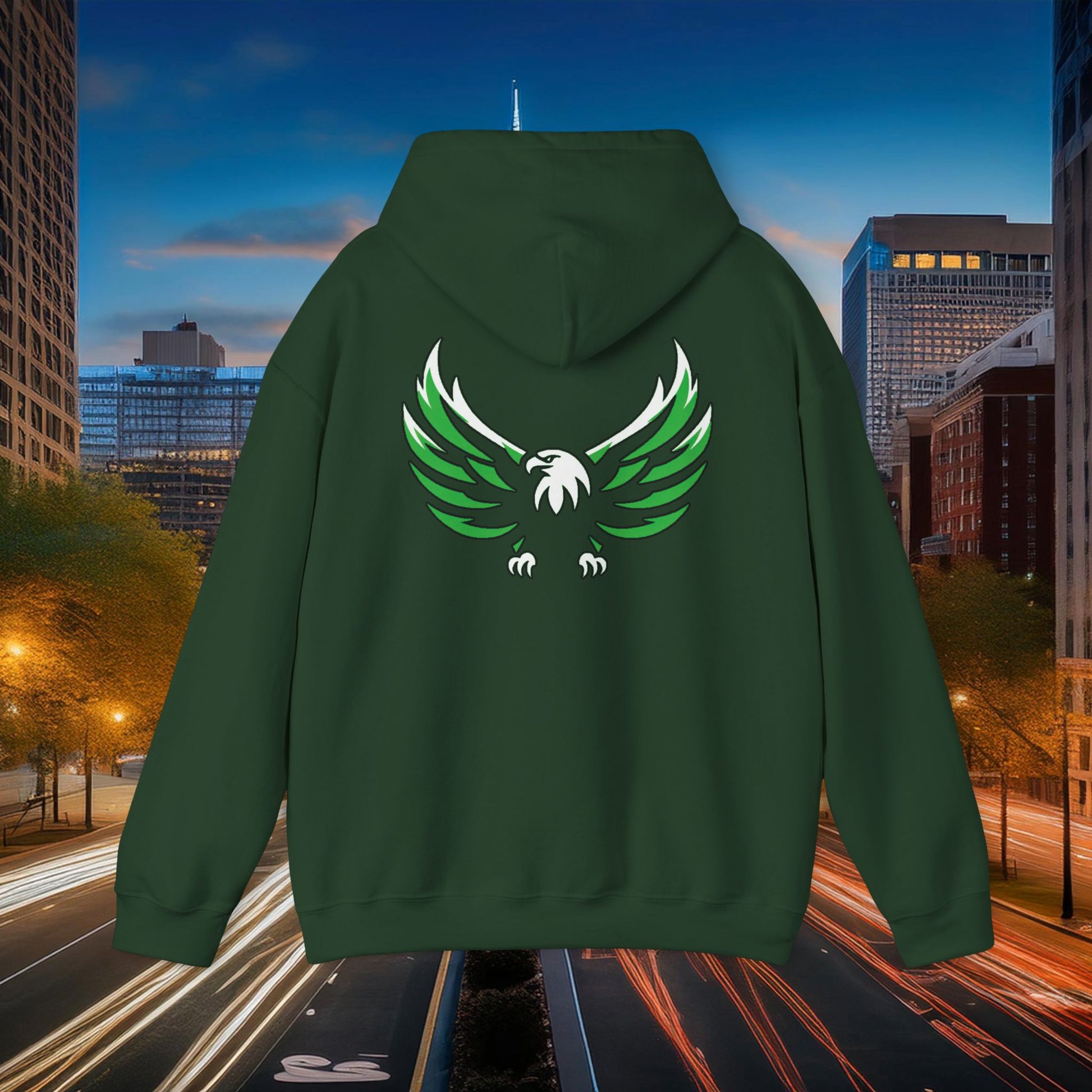 This Philadelphia Eagles themed heavy blend hooded sweatshirt is relaxation itself. Made with a thick blend of cotton and polyester, it feels plush, soft and warm, a perfect choice for any cold day. In the front, the spacious kangaroo pocket adds daily practicality while the hood's drawstring is the same color as the base sweater for extra style points.