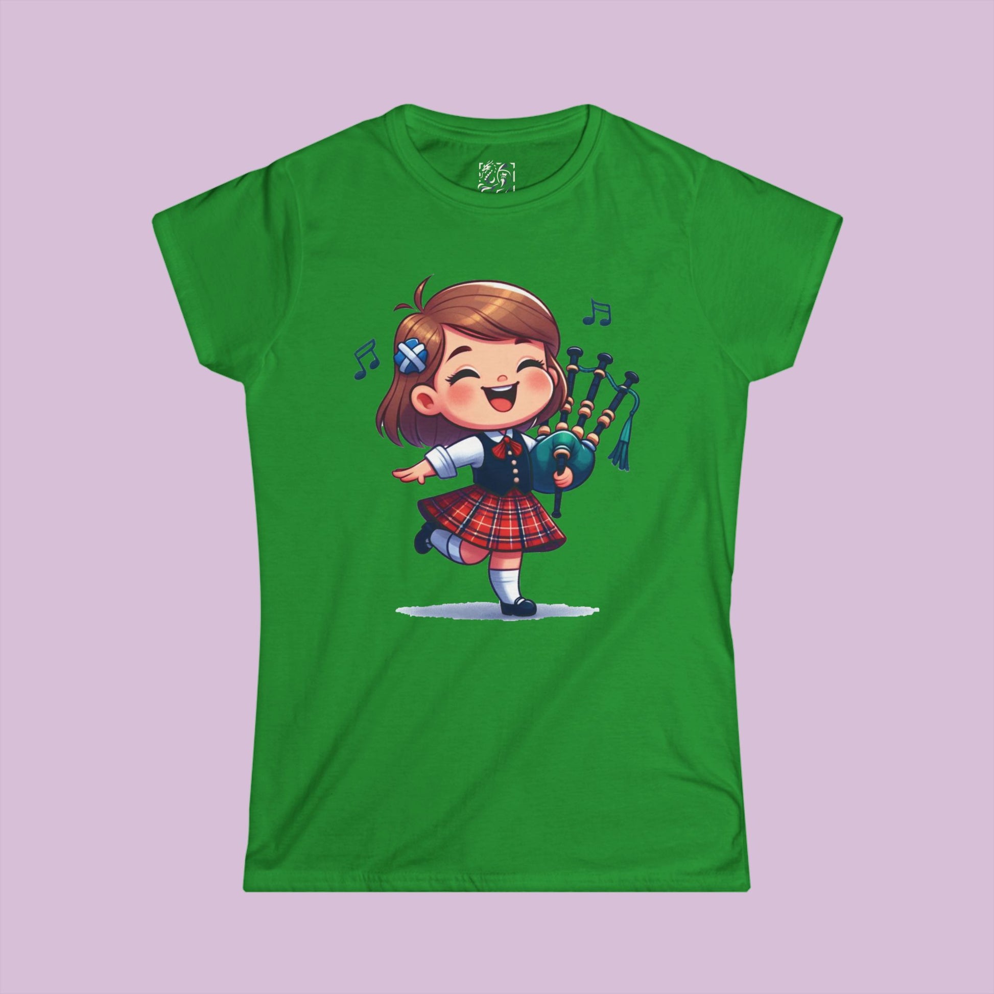 This Scottish themed woman's softstyle tee is a more feminine take on the classic tee. The sleeves are shortened to reveal some shoulder. The fabric is 100% ringspun cotton for all solid colors. The shoulders are taped with twill to prolong durability. The collar seam is reinforced with ribbed knitting.