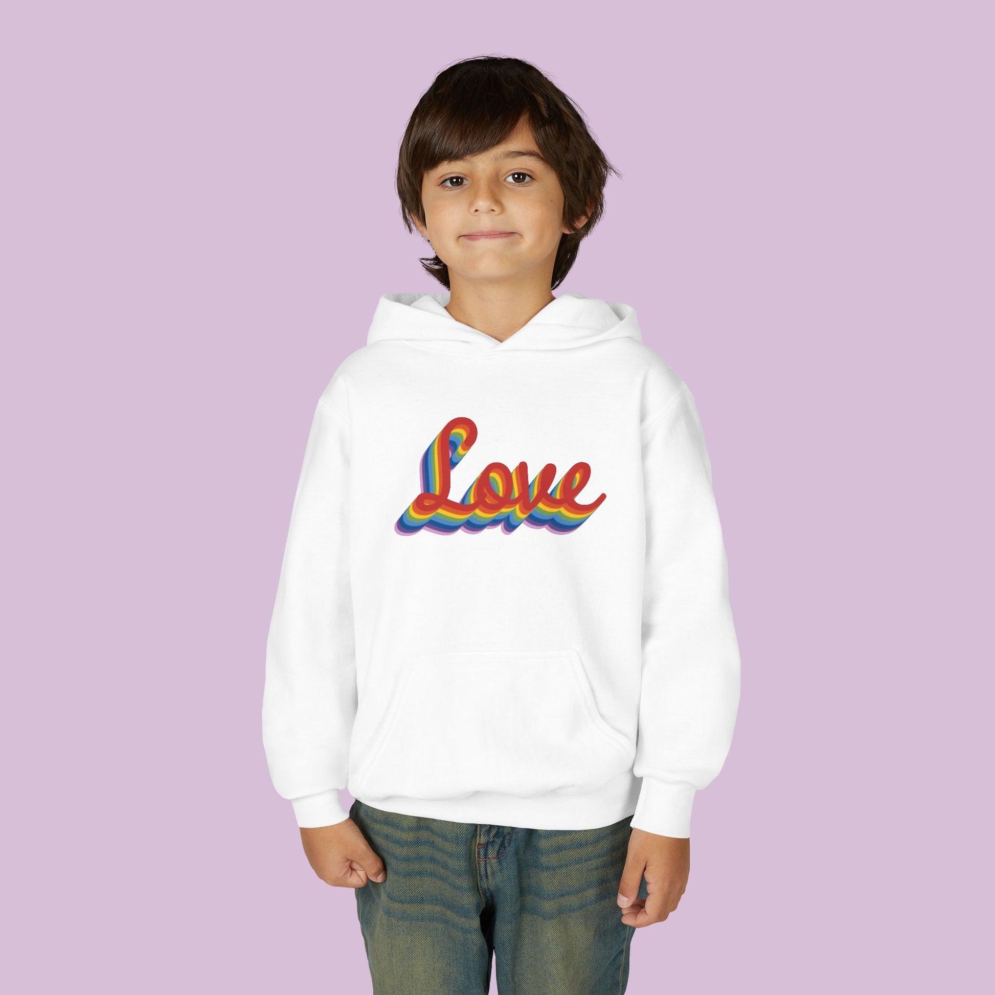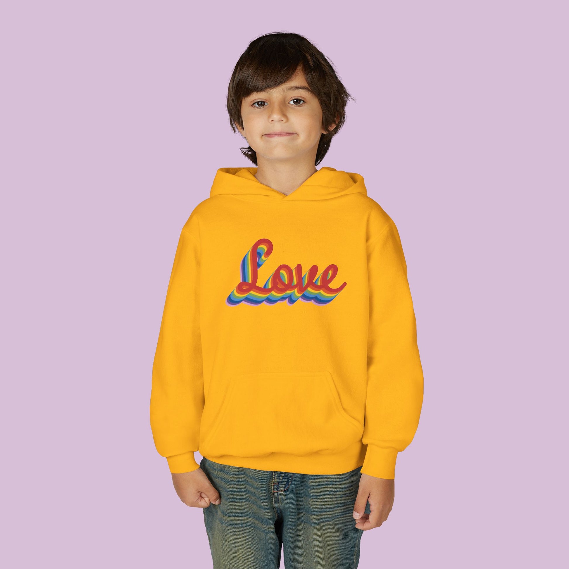 This Pride themed love design Youth Heavy Blend Hooded Sweatshirt offers a cozy and stylish way for kids to express themselves. With a vibrant 'Love' design, it radiates a positive and cheerful vibe, making it perfect for everyday wear or special occasions. Ideal for family gatherings, school events, or casual outings, this sweatshirt fits seamlessly into any child's wardrobe. It's a heartfelt choice for birthdays, holidays, or celebrations where love and warmth are the theme. A perfect gift for children who appreciate comfort and style, ensuring they stay warm while looking great during cooler days.